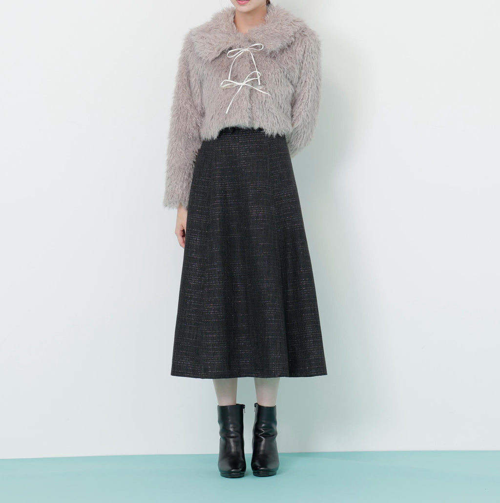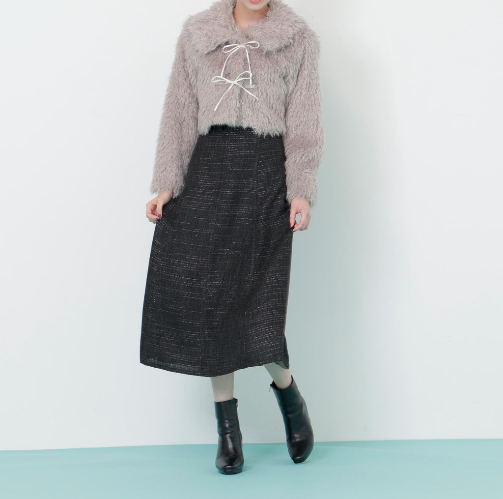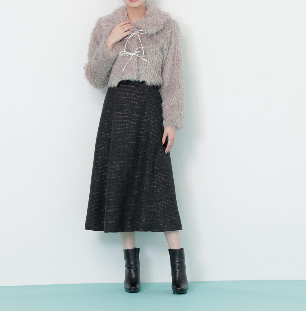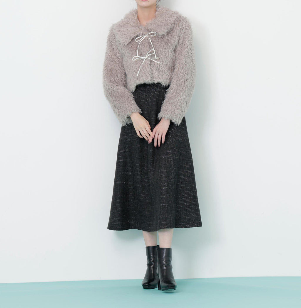 A short blazer made with trendy, long-haired, curly faux fur. It features a faux leather ribbon detail in a duffle coat style design. The faux leather ribbon is decorative, and the front buttons make it easy to put on and take off. The large collar is designed to create a face-enhancing effect. To prevent it from looking bulky, it has a compact silhouette. *Please note that the color may appear different due to lighting during photography.*