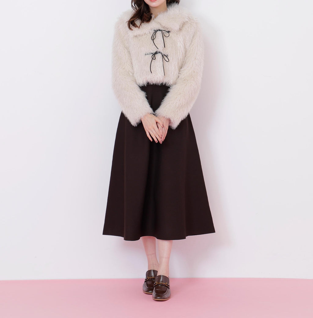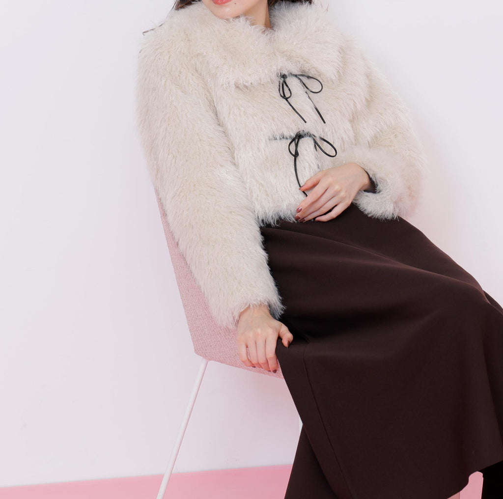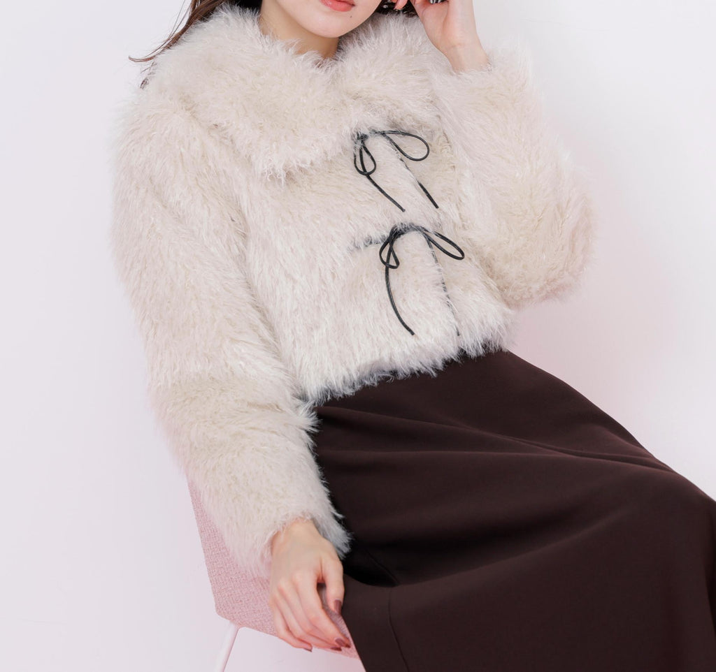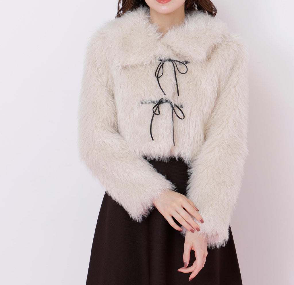 A short-length blouson made with trendy, long-haired, curly faux fur. It features a faux leather ribbon detail in a duffle coat style design. The faux leather ribbon is decorative, and the front buttons make it easy to put on and take off, which is a key point. The large collar can create a face-enhancing effect. To prevent it from looking bulky, it has a compact silhouette. *Please note that the color may appear different due to lighting during photography. Additionally, depending on your computer or smartphone environment, the product color may differ slightly from the images. Please understand this in advance. The color of the product can be referenced from the product single image. *Please note that the product images are samples, and there may be changes in color, size, or other specifications.