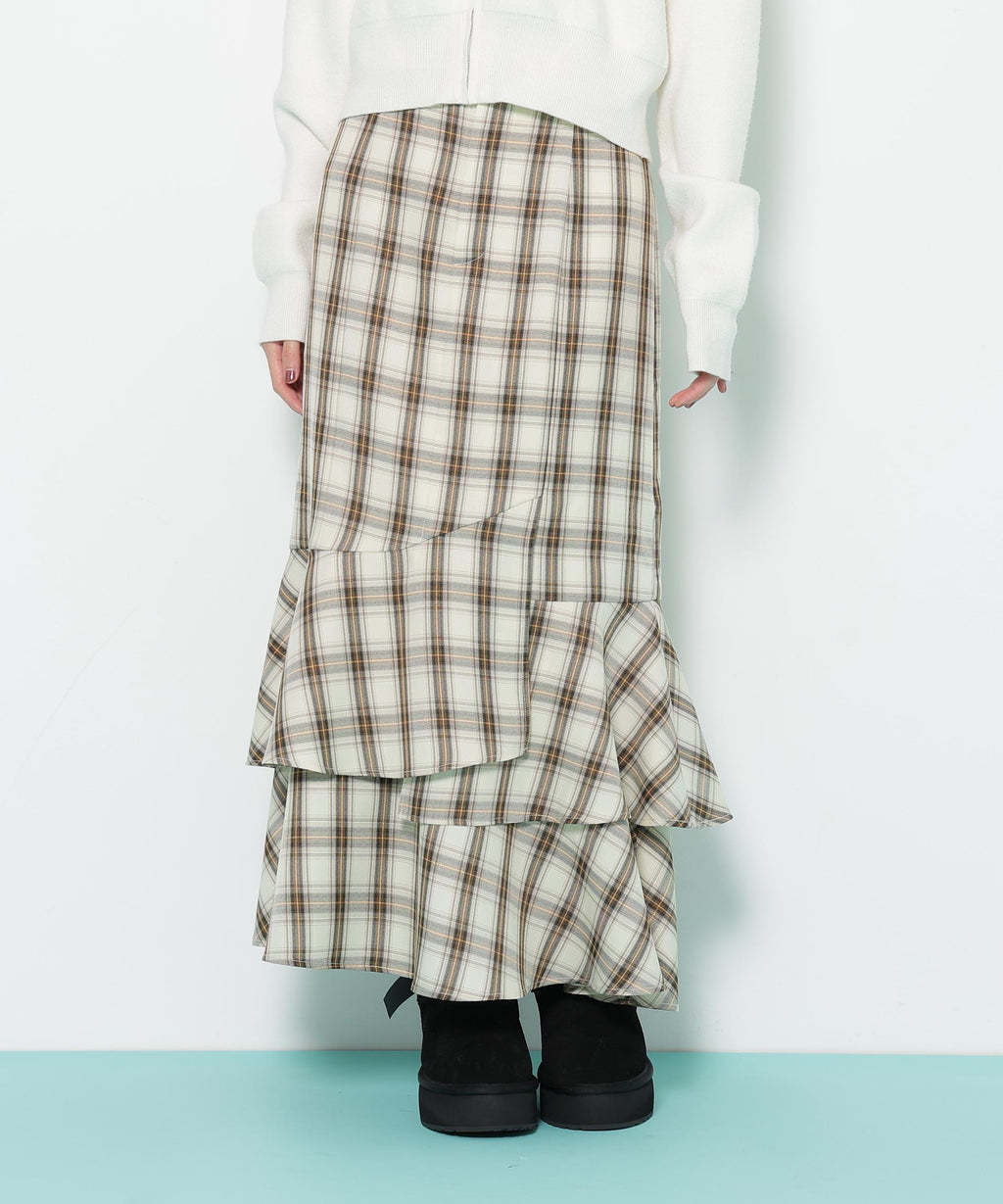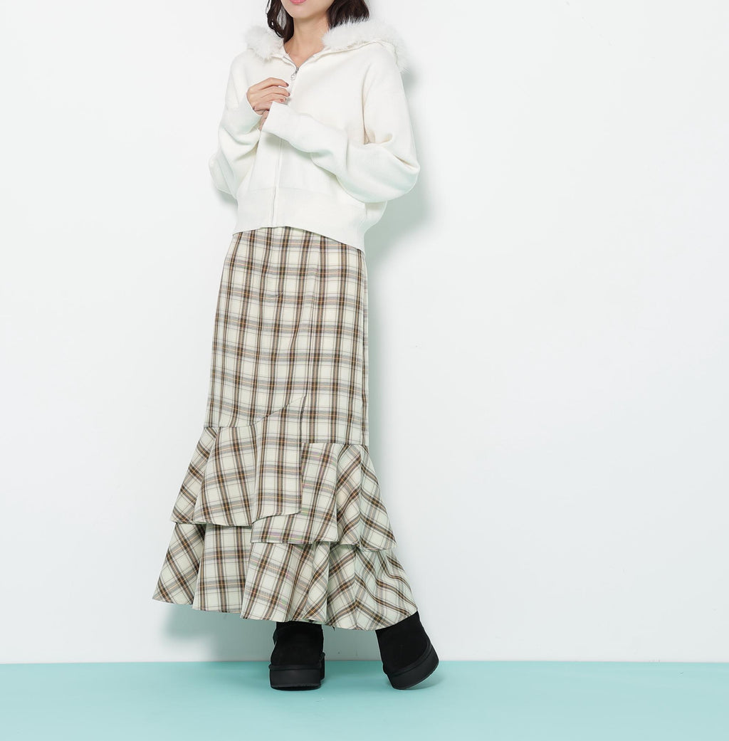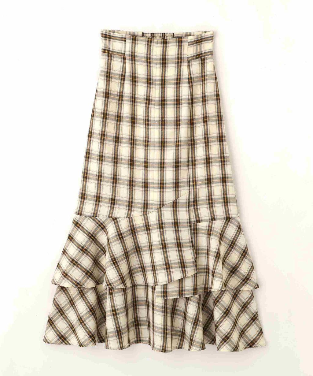 Slim mermaid silhouette skirt. It features a high waist design in a mermaid silhouette. The back has a fitted lace-up, creating a clean waistline. Pairing it with a loose-knit sweater is also recommended. It comes in three solid colors that are easy to match, featuring the autumn/winter trend of big check patterns. *Please note that the color may appear different due to lighting during photography.* Additionally, depending on your computer or smartphone environment, the product and image colors may differ slightly. Please understand this in advance. Please refer to the product single image for the product's color. *Please note that the product images are samples, and there may be changes in color or size specifications.*