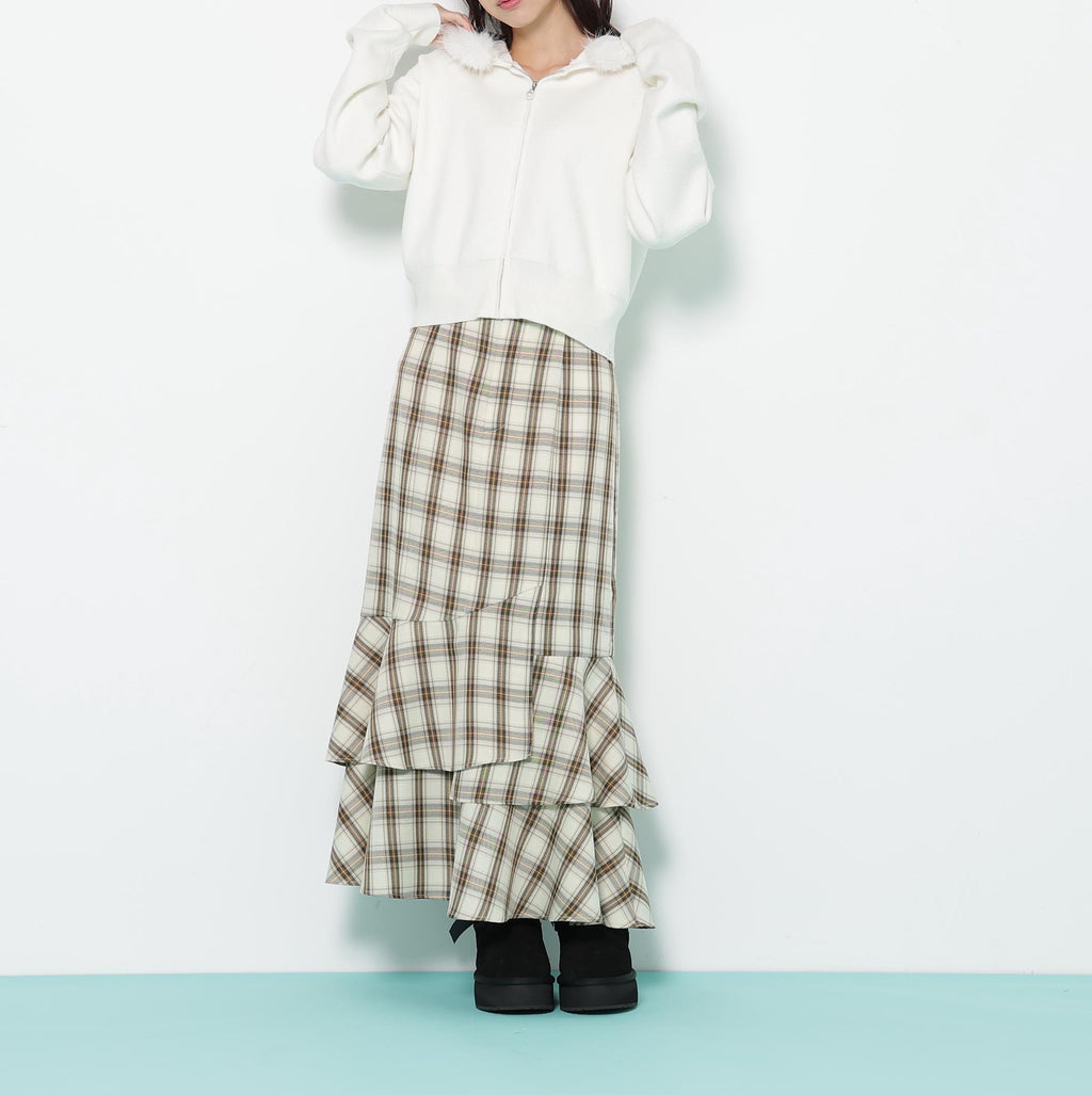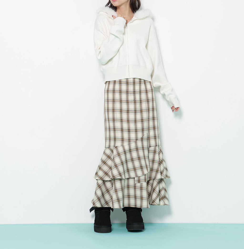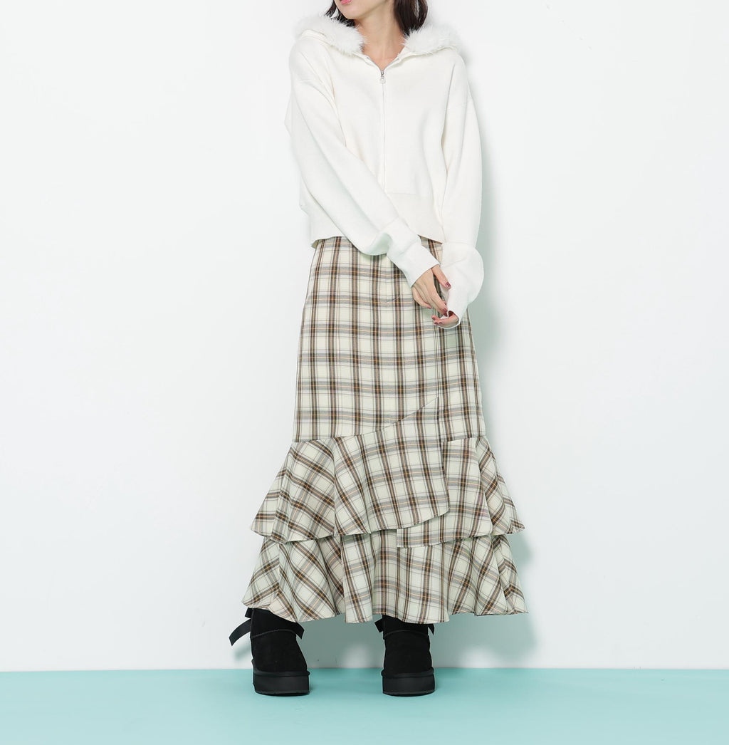 Slim mermaid silhouette skirt. It features a high waist design in a mermaid silhouette. The back has a fitted lace-up, creating a clean waistline. Pairing it with a loose-knit sweater is also recommended. It comes in three solid colors that are easy to match, featuring the autumn/winter trend of big check patterns. *Please note that the color may appear different due to lighting during photography.* Additionally, depending on your computer or smartphone environment, the product and image colors may differ slightly. Please understand this in advance. Please refer to the product single image for the product's color. *Please note that the product images are samples, and there may be changes in color or size specifications.*