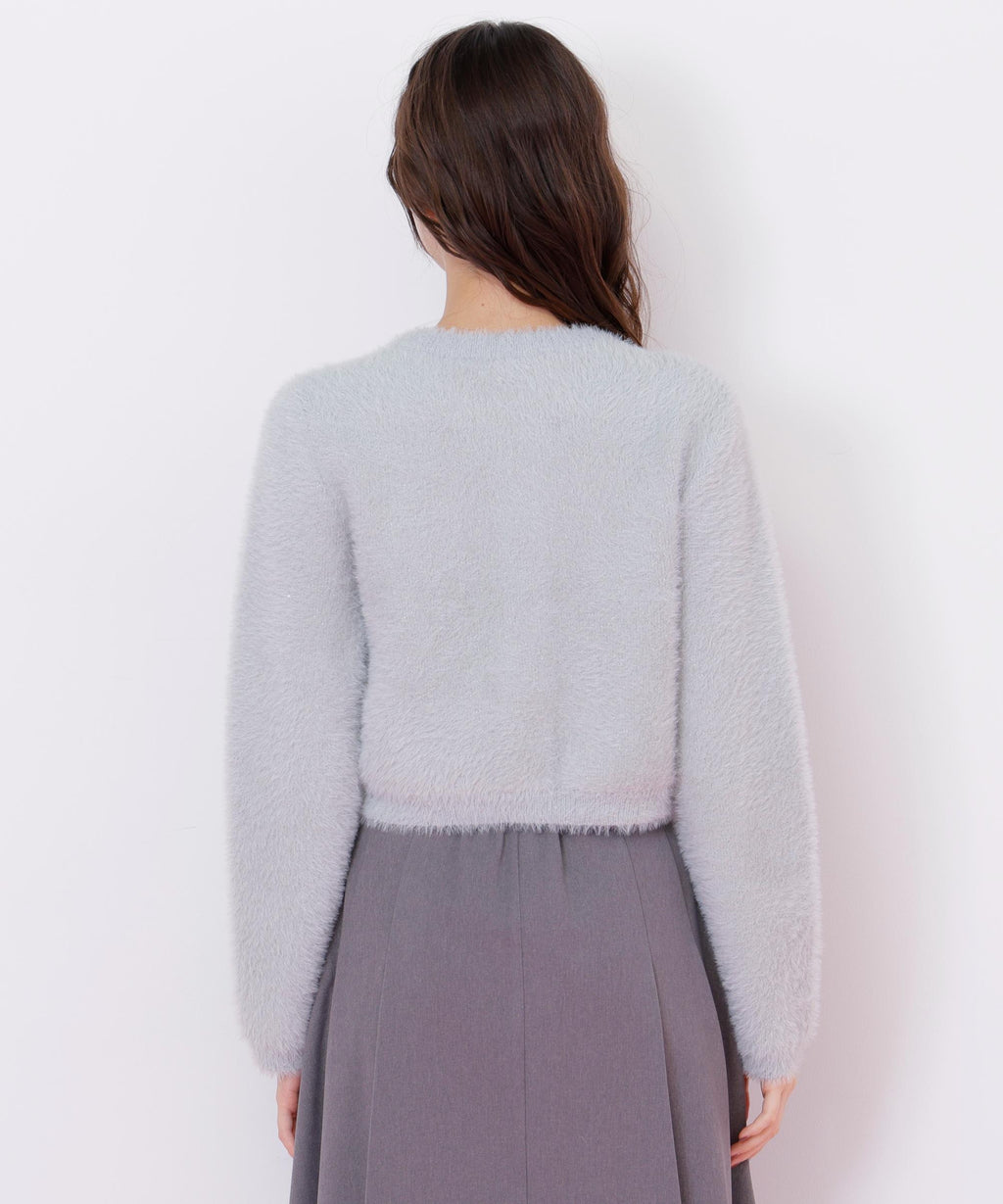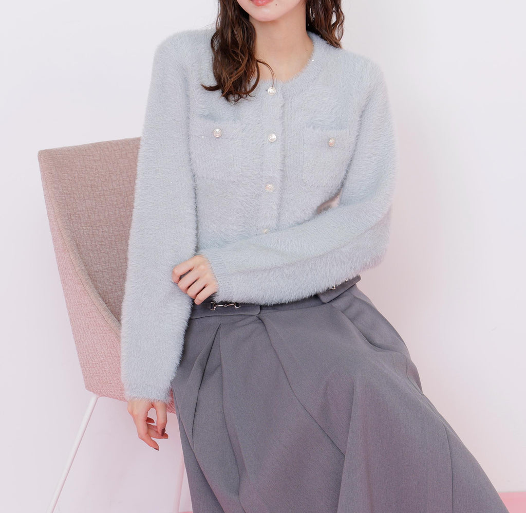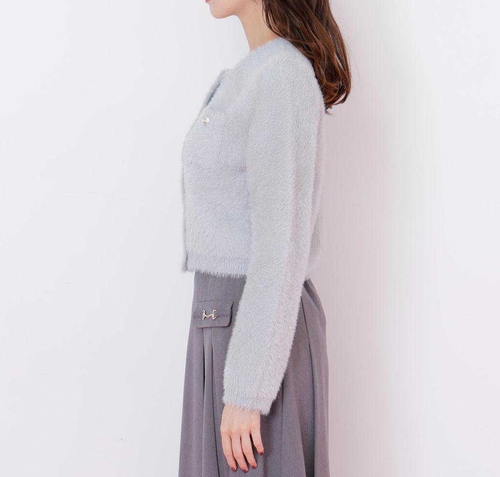 A glamorous knit jacket woven with short fluffy shaggy yarn, small sequins, and glitter yarn. The elegant gloss in the same color makes it not too flashy, making it recommended for both office and daily outings. Knit jackets are easy to wear, lightweight, and resistant to wrinkles, making them convenient to carry. *Please note that the color may appear different due to lighting during photography.*
