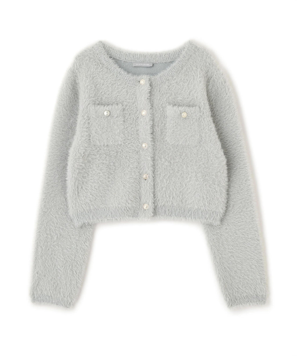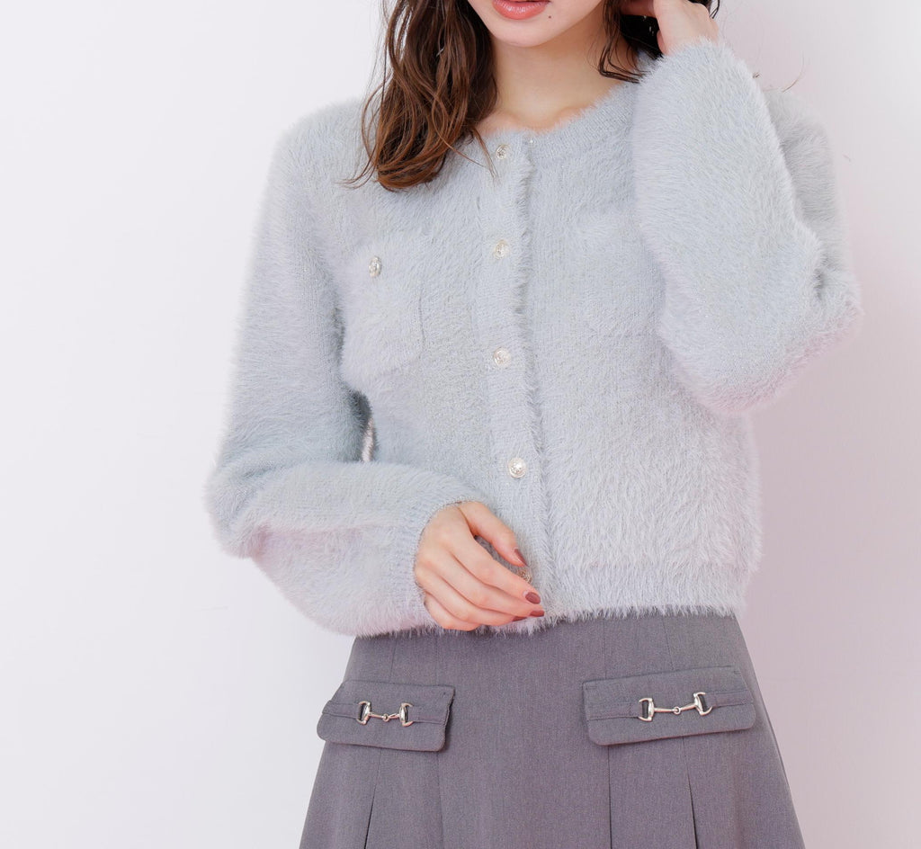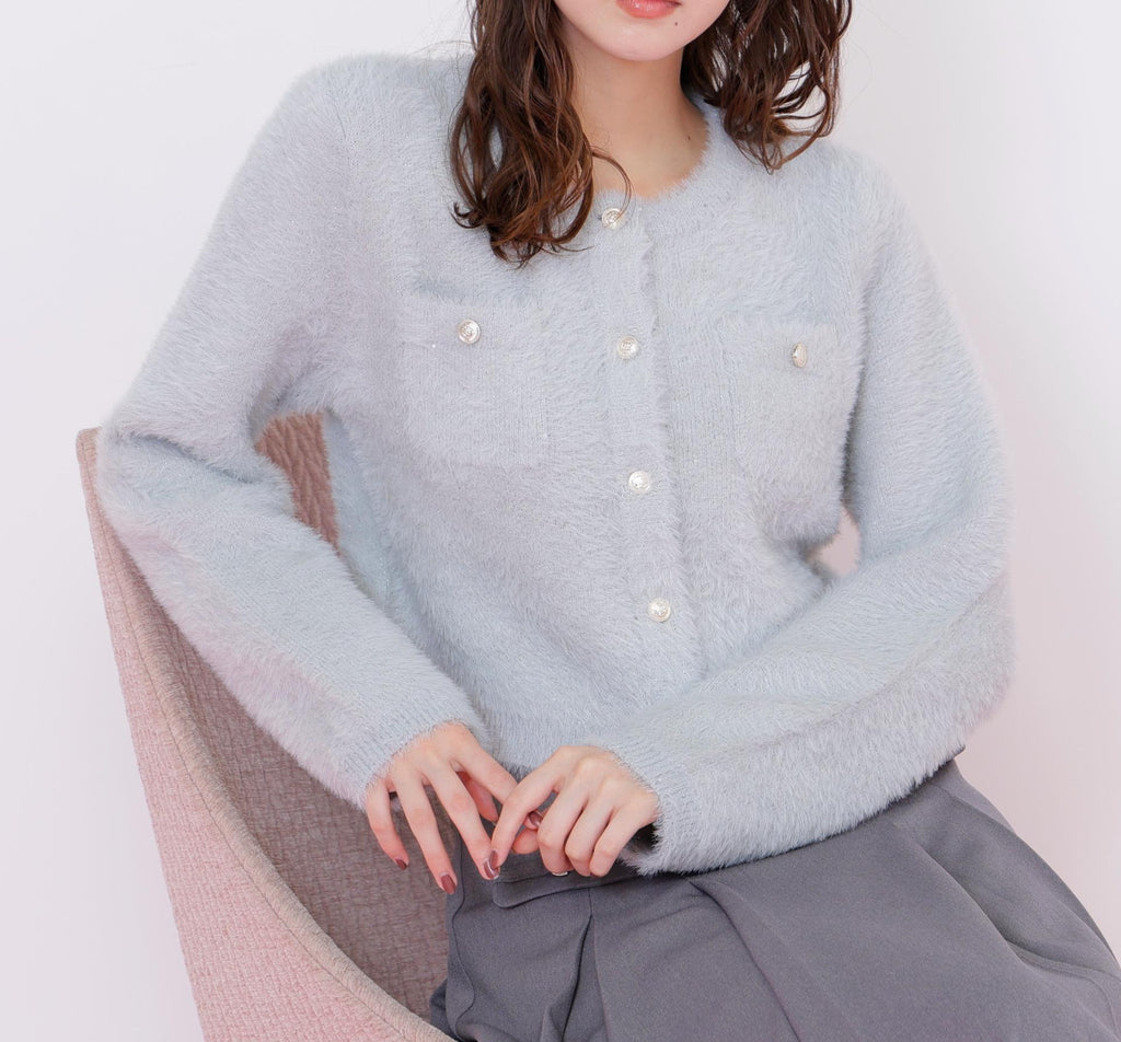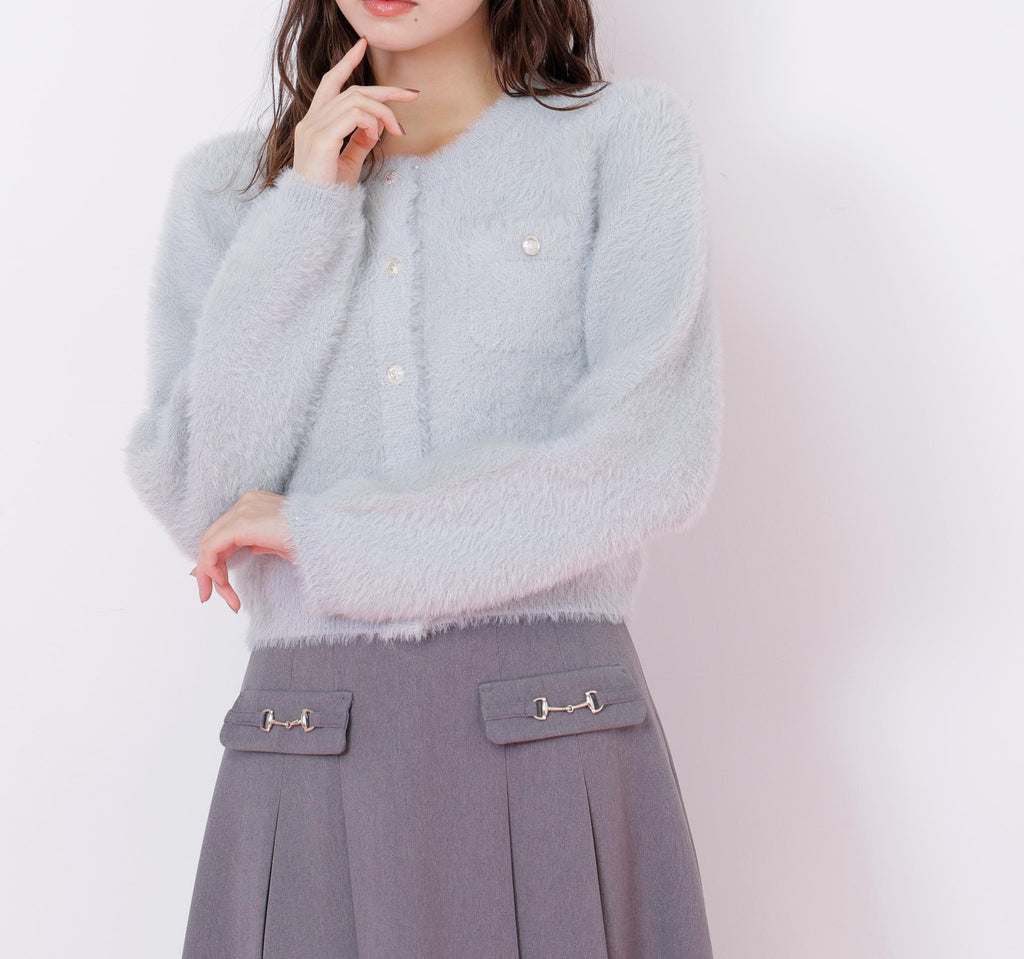 A glamorous knit jacket woven with short fluffy shaggy yarn, small sequins, and glitter yarn. The elegant gloss in the same color makes it not too flashy, making it recommended for both office and daily outings. Knit jackets are easy to wear, lightweight, and resistant to wrinkles, making them convenient to carry. *Please note that the color may appear different due to lighting during photography.*
