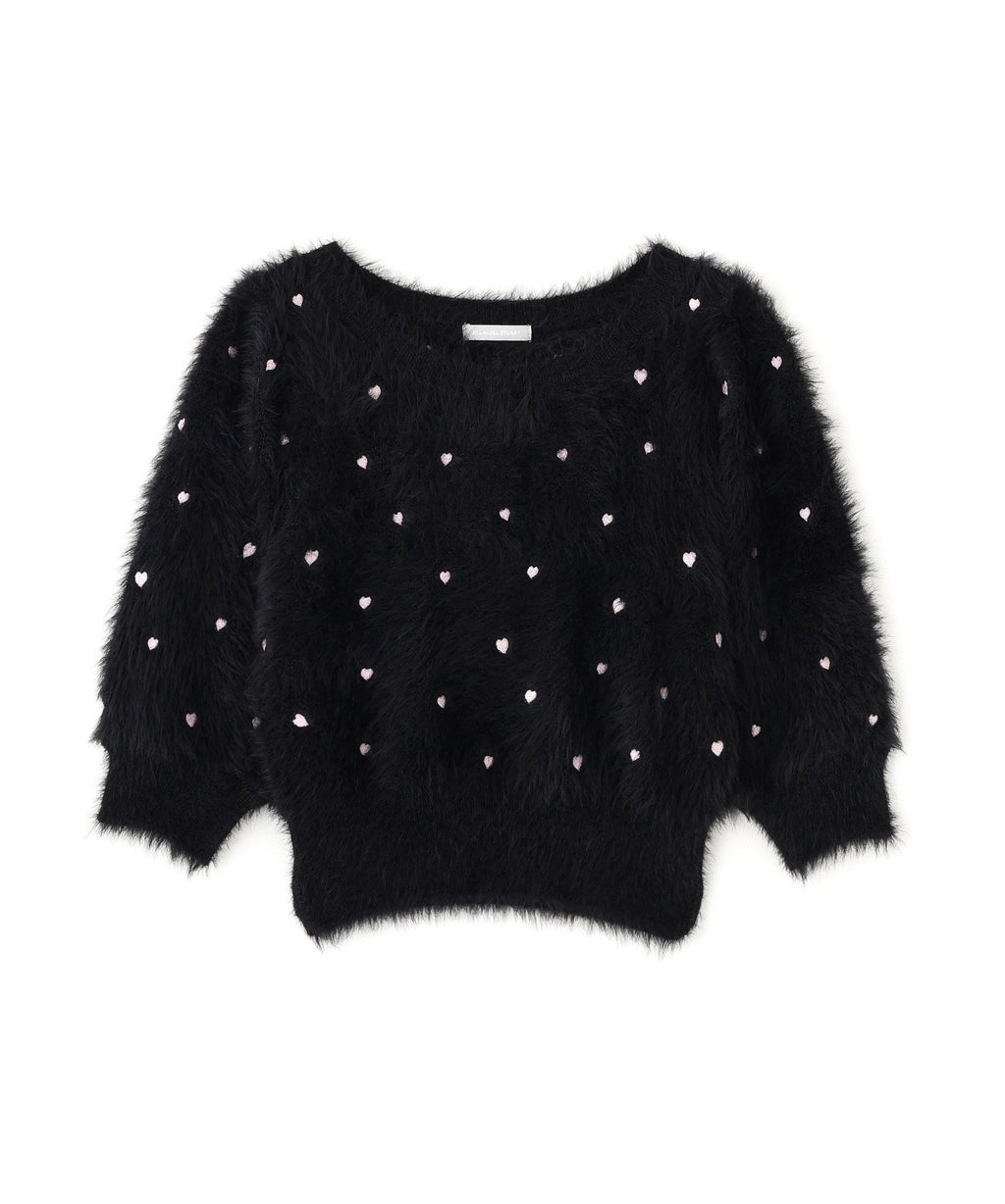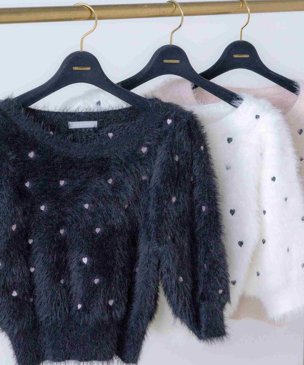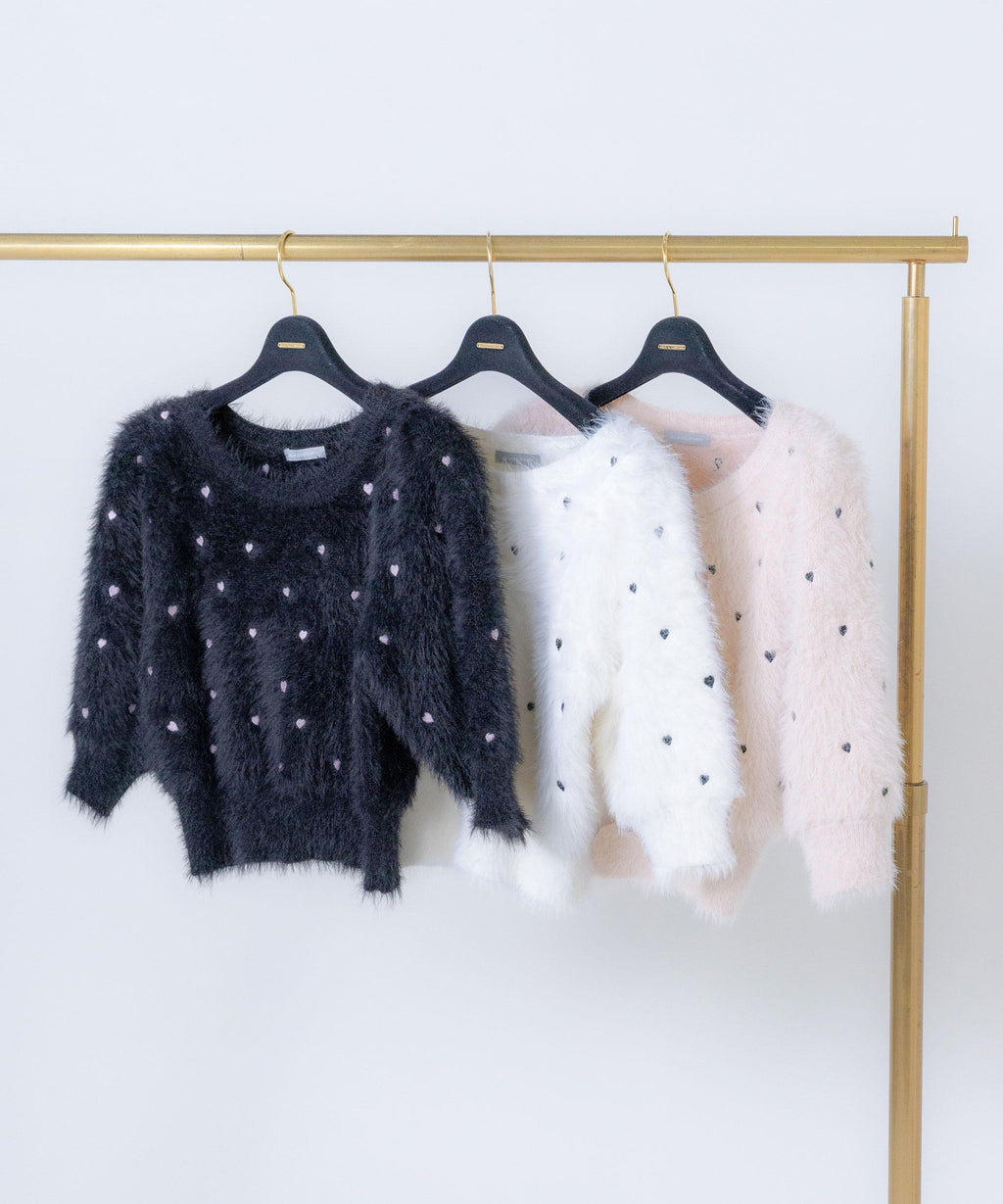A short-sleeved top that makes you look adorable as the main feature in a single piece. Made of fluffy shaggy knit, with a design featuring randomly embroidered heart motifs. The sleeves are puffed, giving a soft, voluminous look. The color scheme is also a point that perfectly matches the upcoming season. *Please note that the color may appear different due to lighting during photography.*