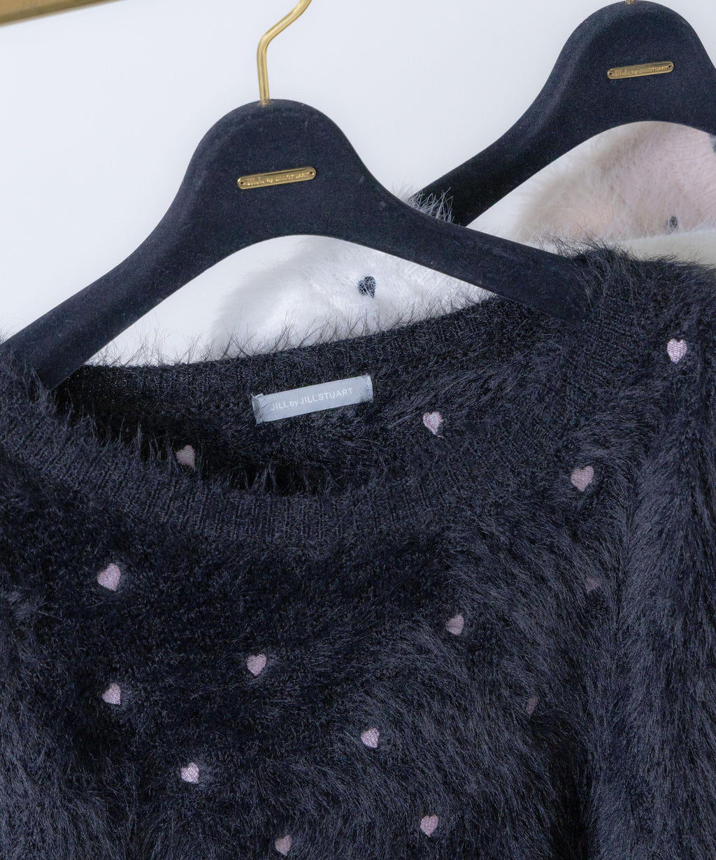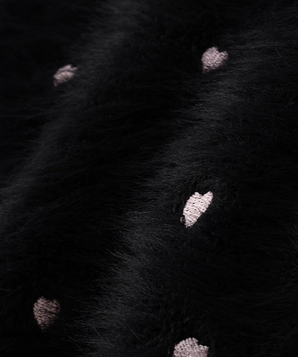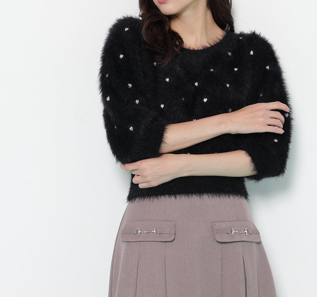 A short-sleeved top that makes you look adorable as the main feature in a single piece. Made of fluffy shaggy knit, with a design featuring randomly embroidered heart motifs. The sleeves are puffed, giving a soft, voluminous look. The color scheme is also a point that perfectly matches the upcoming season. *Please note that the color may appear different due to lighting during photography.*