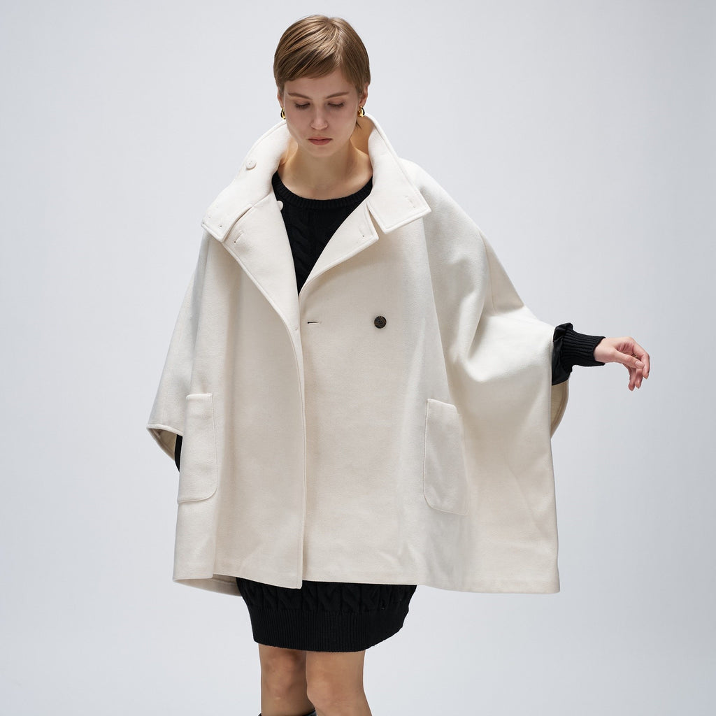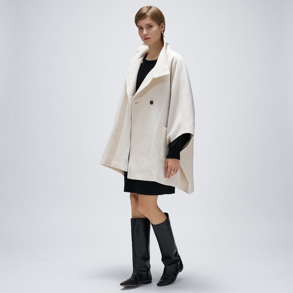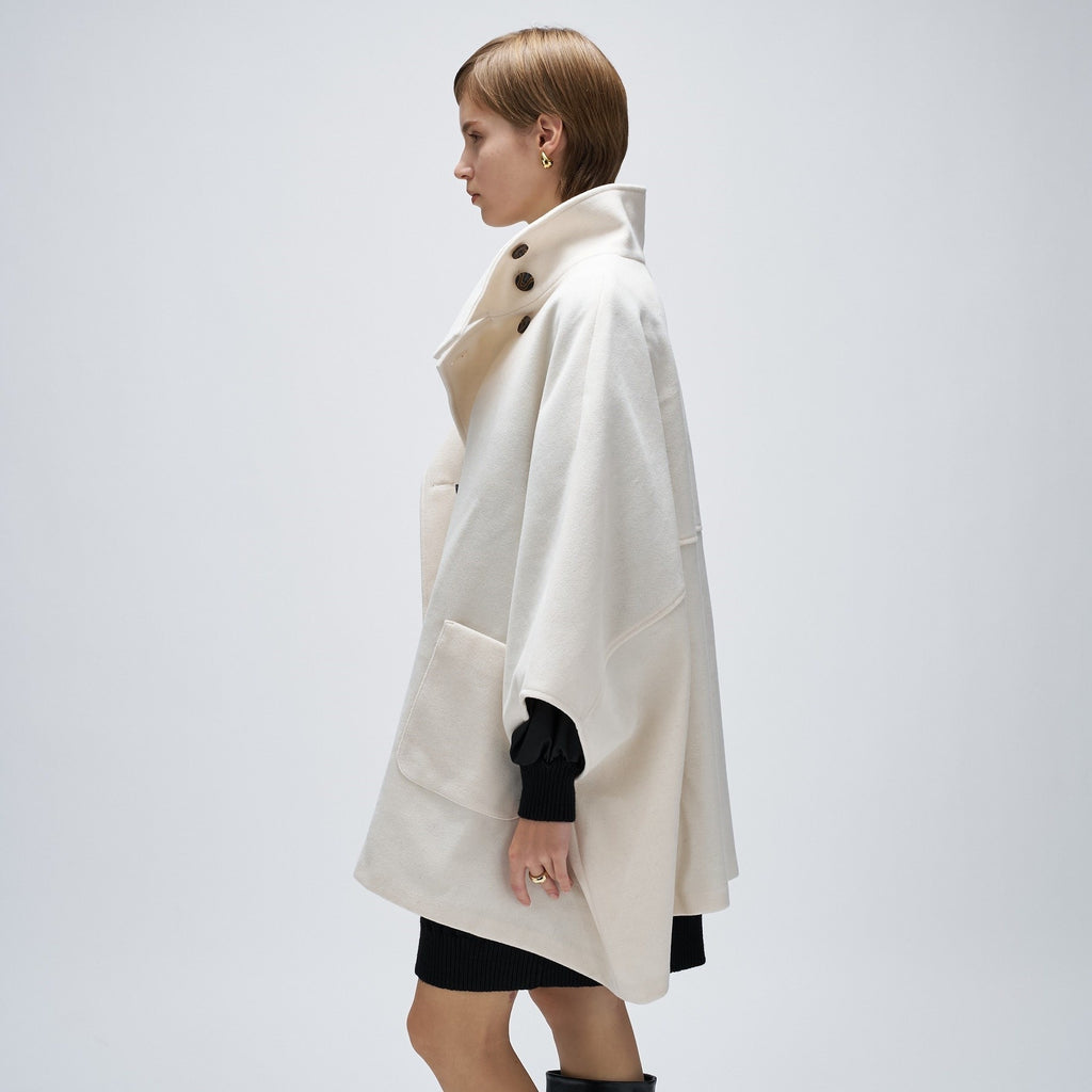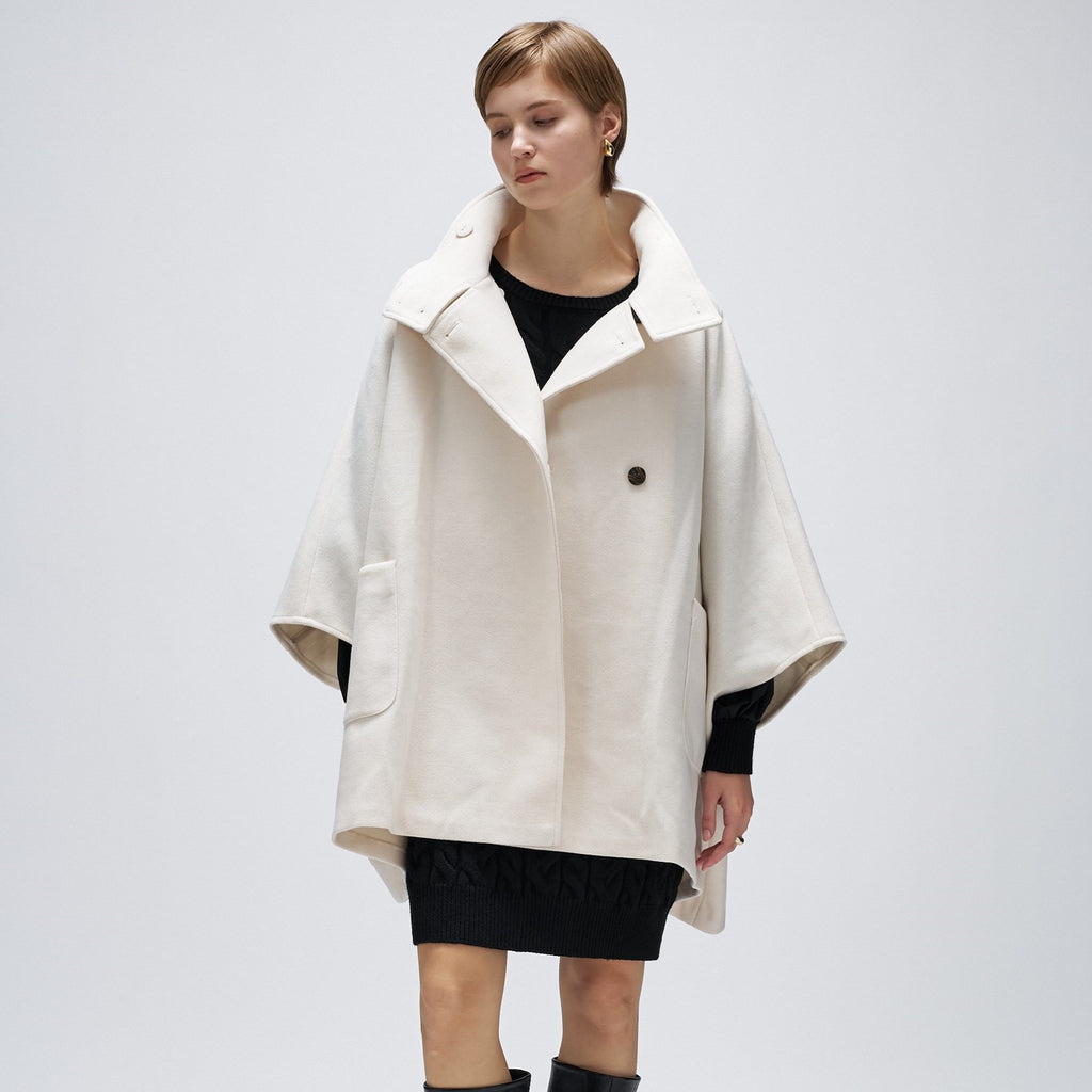 ・The cape silhouette features a wide Width and sleeves, creating a sense of three-dimensionality and lightness.