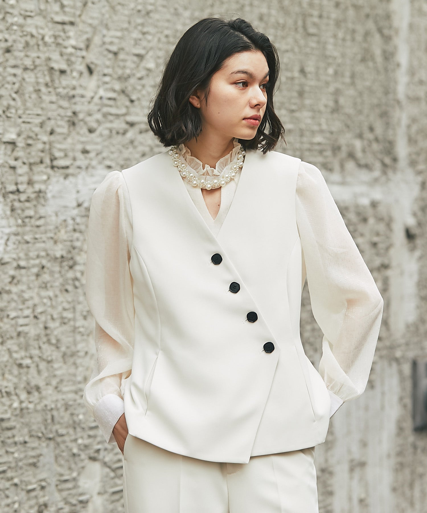 ● The V-neck opening creates a sharp impression, and the diagonally arranged buttons make it more stylish.