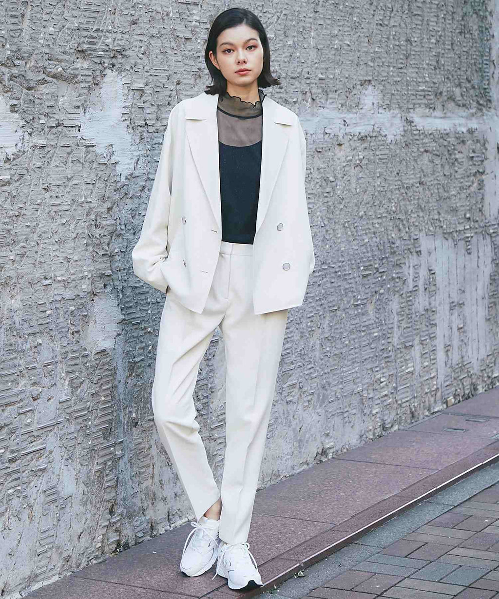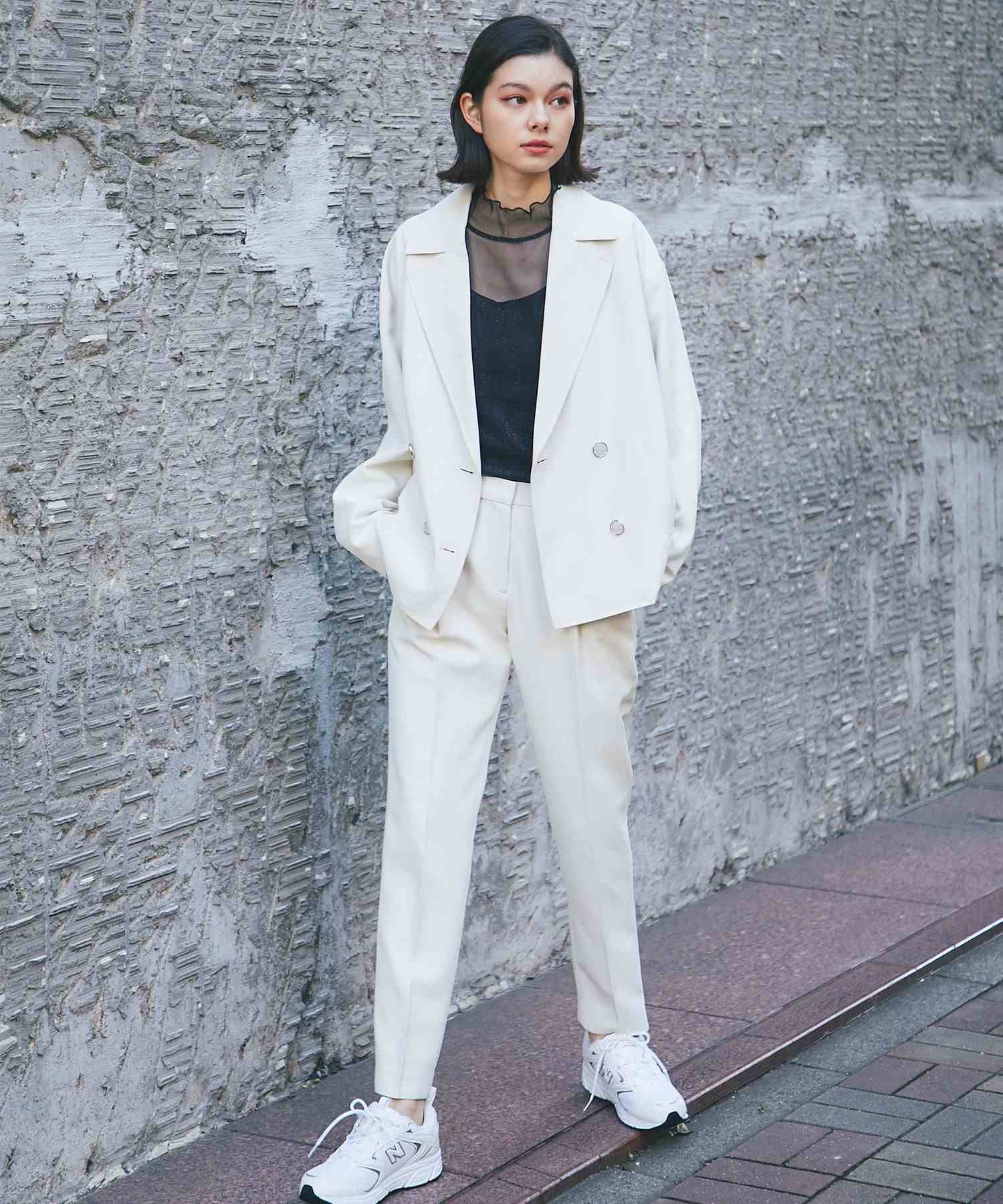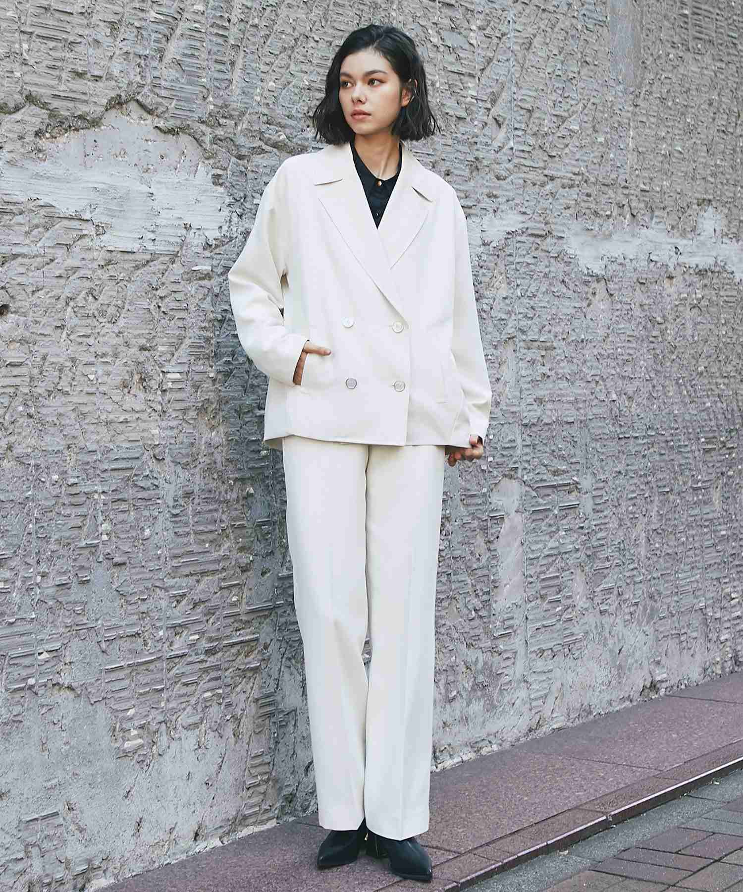L: Width 61cm | Shoulder width 52cm | Length (front) 63cm (back) 68cm | Sleeve length 54cm | Waist (tapered pants) 71cm (wide pants) 73cm | Hip (tapered pants) 103cm (wide pants) 100cm | Rise (tapered pants) 28cm (wide pants) 32cm | Inseam (tapered pants) 68cm (wide pants) 71cm | Thigh circumference (tapered pants) 65cm (wide pants) 63cm | Hem circumference (tapered pants) 34cm (wide pants) 52cm