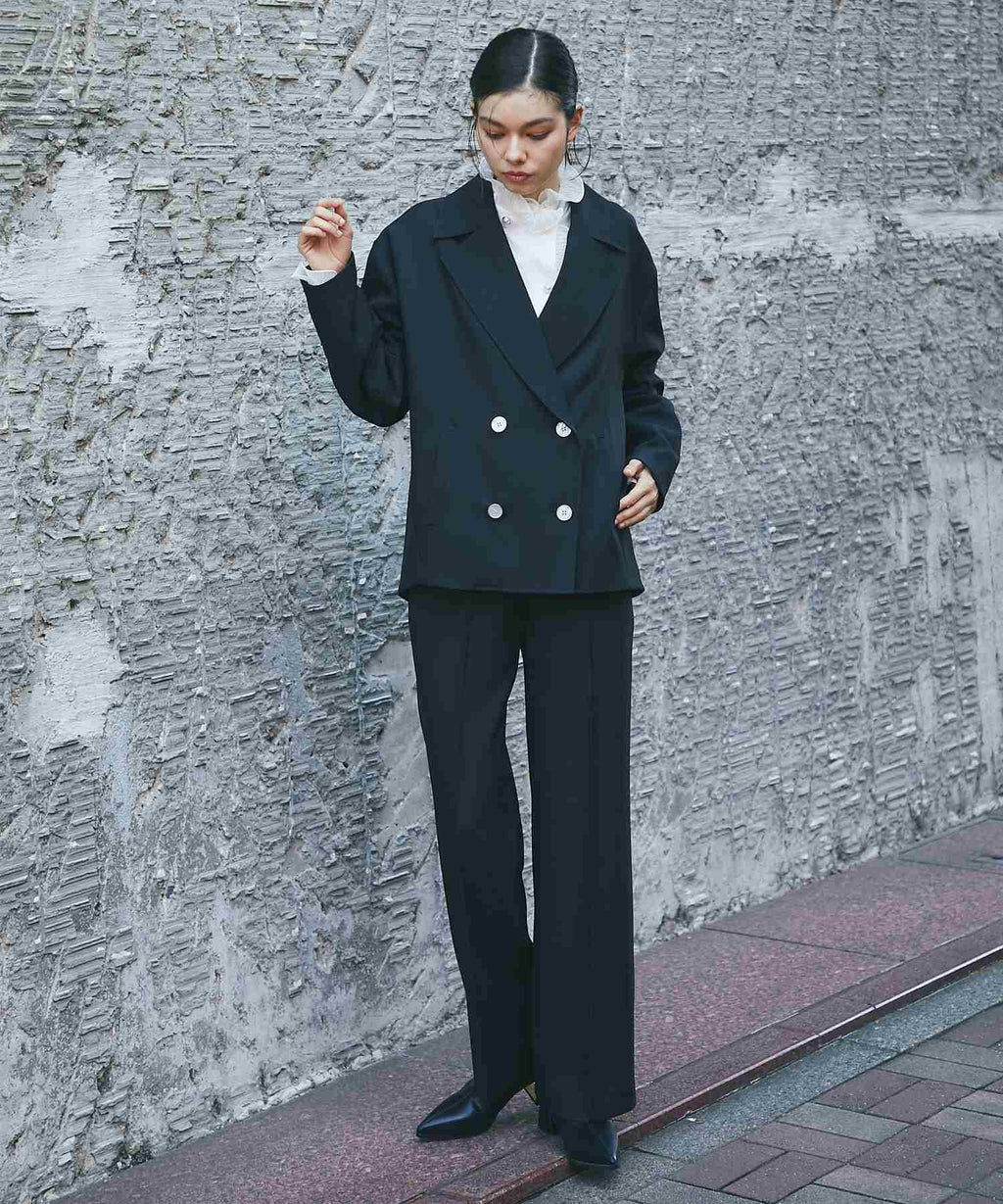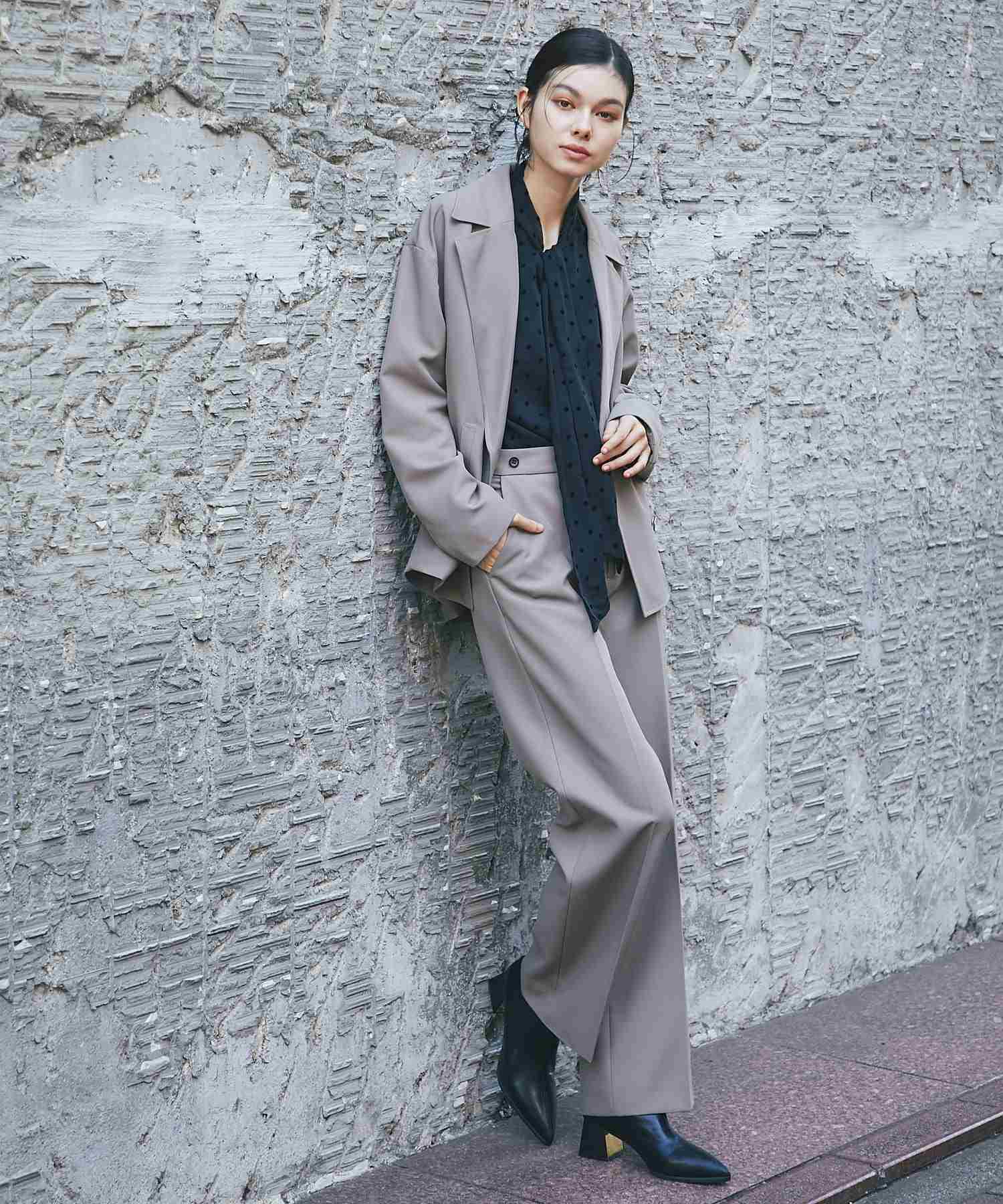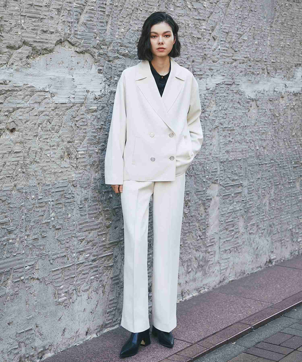 L: Width 61cm | Shoulder width 52cm | Length (front) 63cm (back) 68cm | Sleeve length 54cm | Waist (tapered pants) 71cm (wide pants) 73cm | Hip (tapered pants) 103cm (wide pants) 100cm | Rise (tapered pants) 28cm (wide pants) 32cm | Inseam (tapered pants) 68cm (wide pants) 71cm | Thigh circumference (tapered pants) 65cm (wide pants) 63cm | Hem circumference (tapered pants) 34cm (wide pants) 52cm