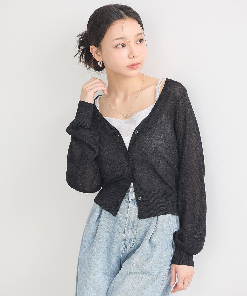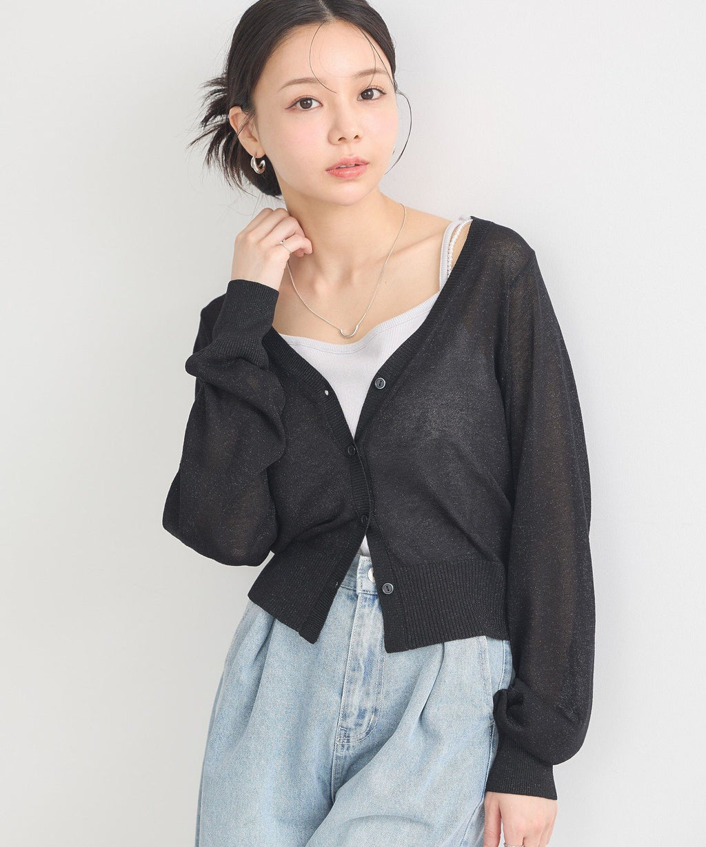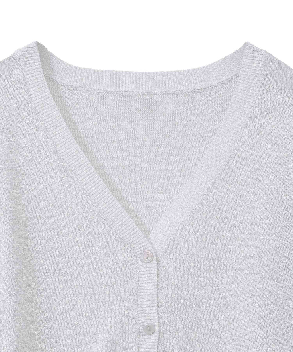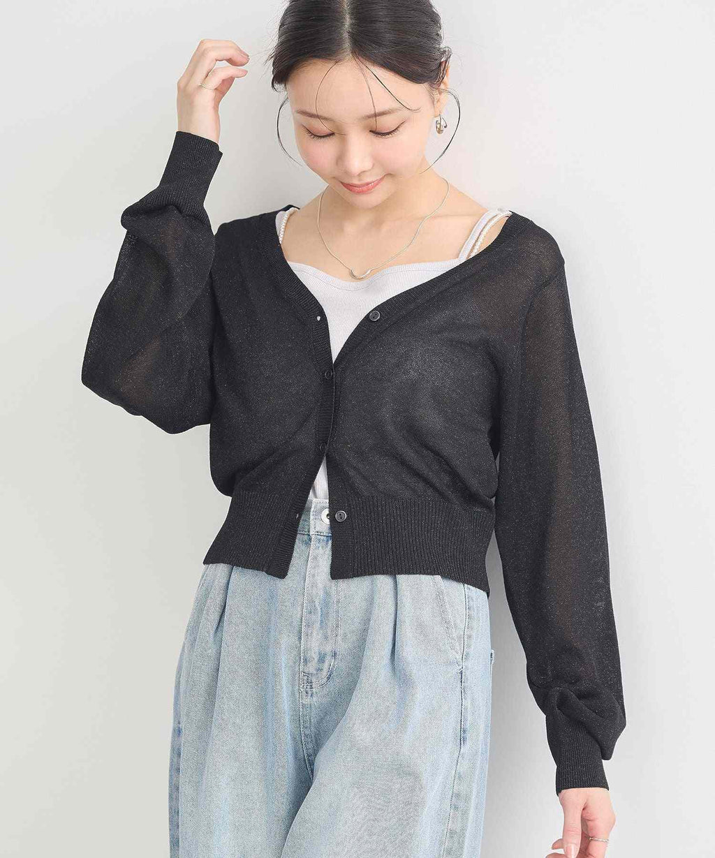 A design cardigan with a lamé & sheer material that supports elegant styling. With a slightly short length that is on-trend, it can be well balanced with a wide range of bottoms. The deep V-neck beautifully showcases the neck and collarbone line, which is also a nice point. This is a recommended item that completes a seasonal outfit just by throwing it on.