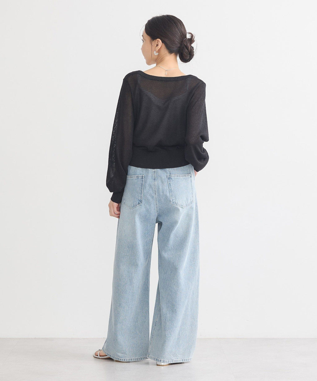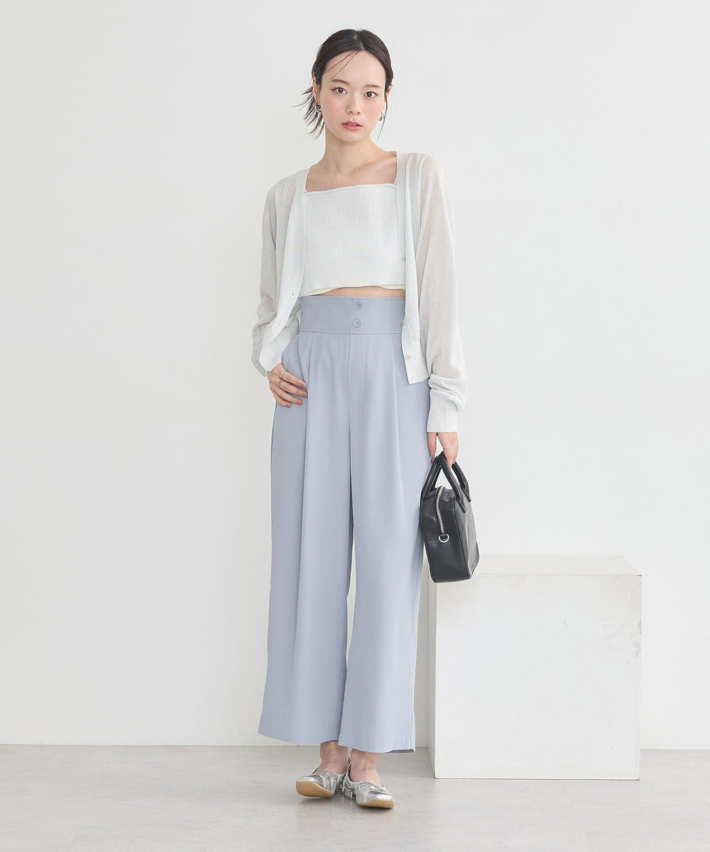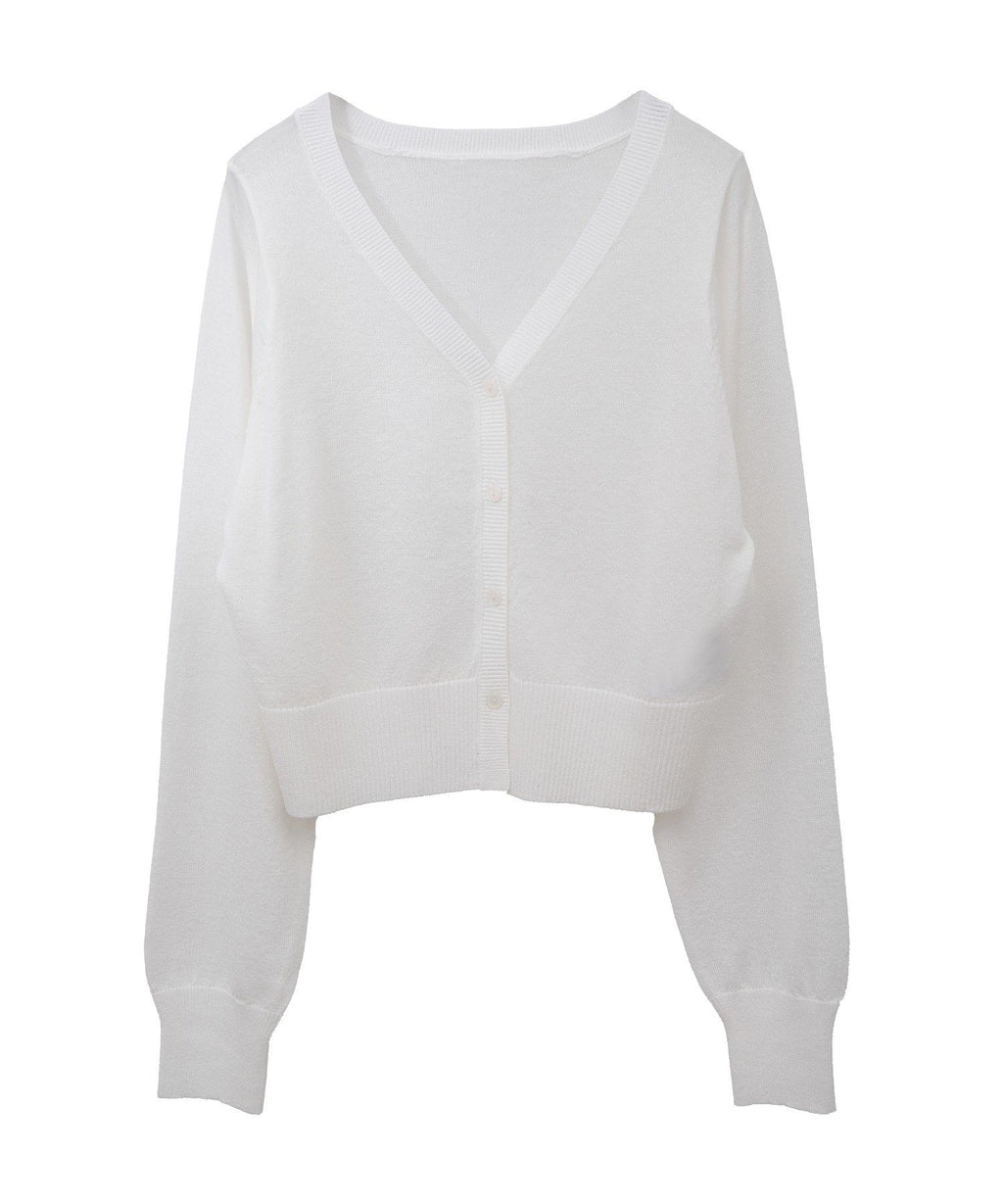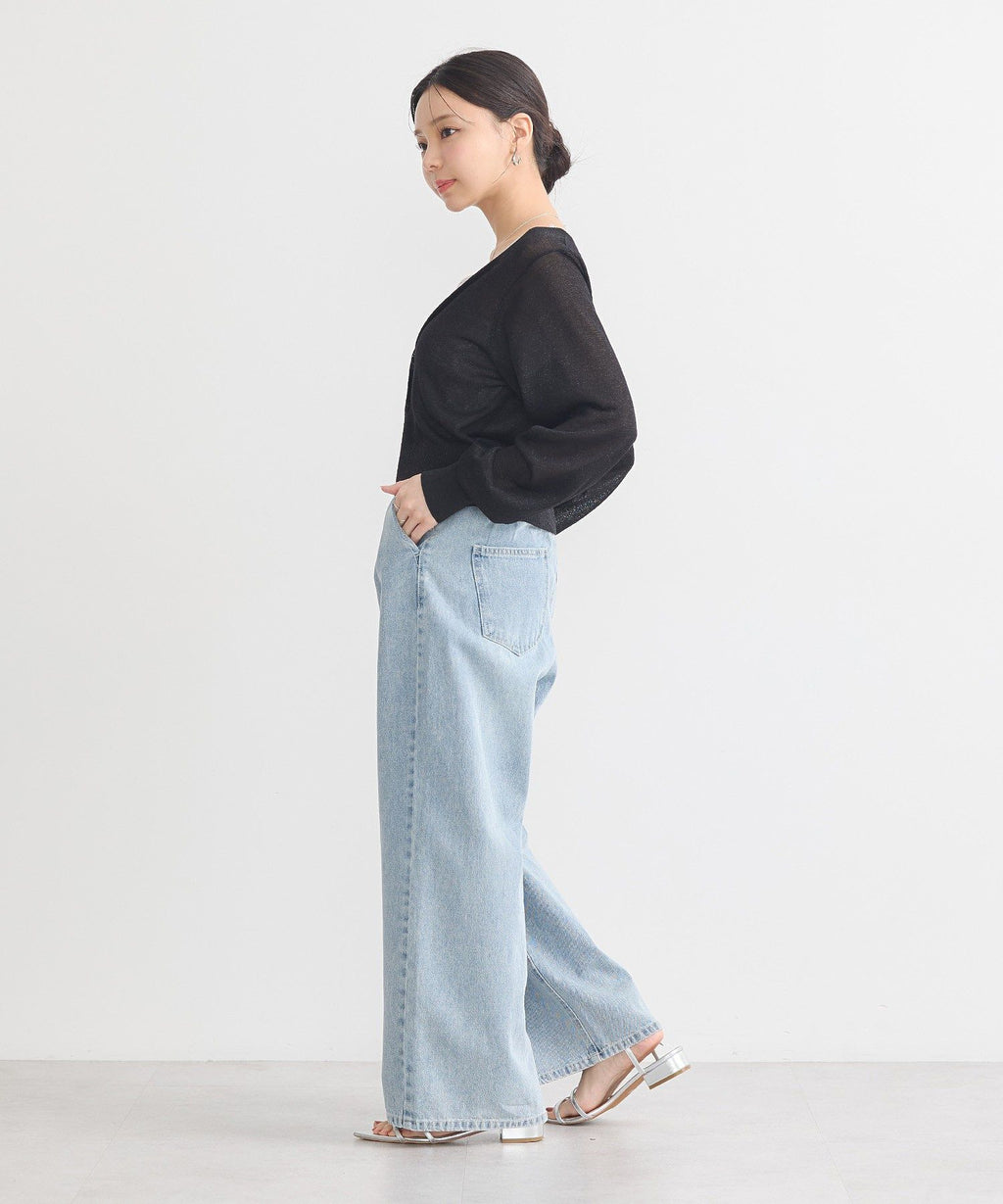 A design cardigan with a lamé & sheer material that supports elegant styling. With a slightly short length that is on-trend, it can be well balanced with a wide range of bottoms. The deep V-neck beautifully showcases the neck and collarbone line, which is also a nice point. This is a recommended item that completes a seasonal outfit just by throwing it on.