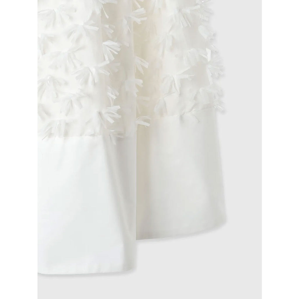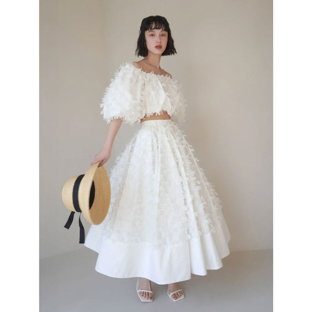 The generous use of fabric creates a sense of volume, and the softly spreading silhouette enhances femininity.