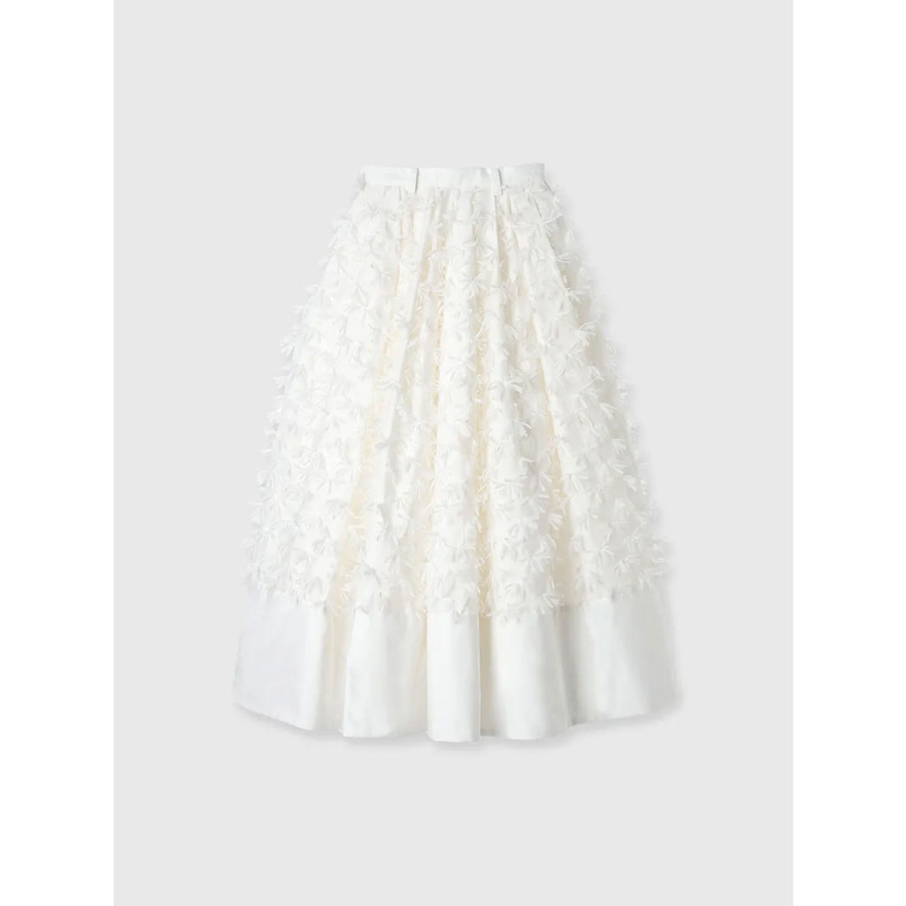 A striking flared skirt with a vibrant design featuring a three-dimensional ribbon motif throughout.