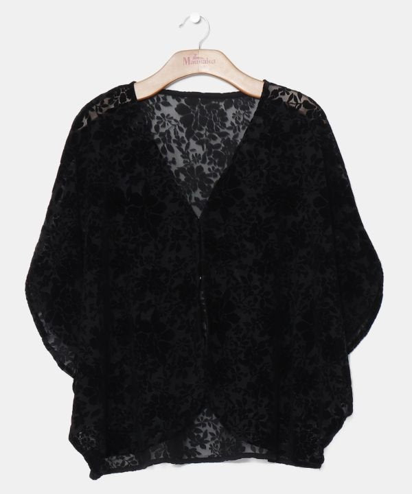 A luxurious flock print with a botanical pattern creates a chic and calm adult resort style in this oversized cardigan. Wearing it with sleeves on is of course an option, but just draping it over your shoulders completes a luxurious coordination.