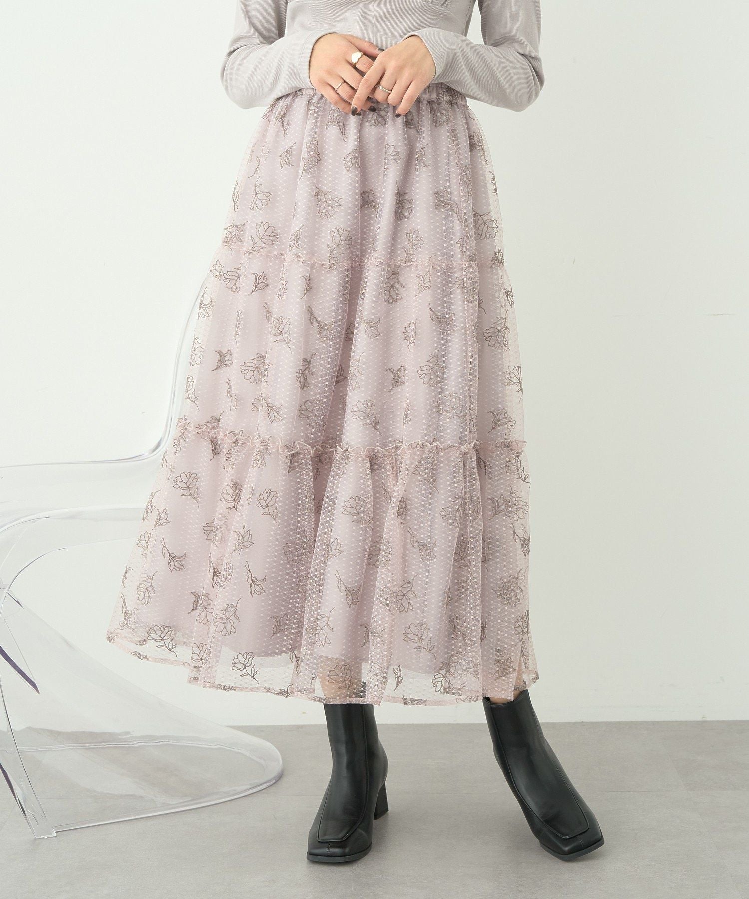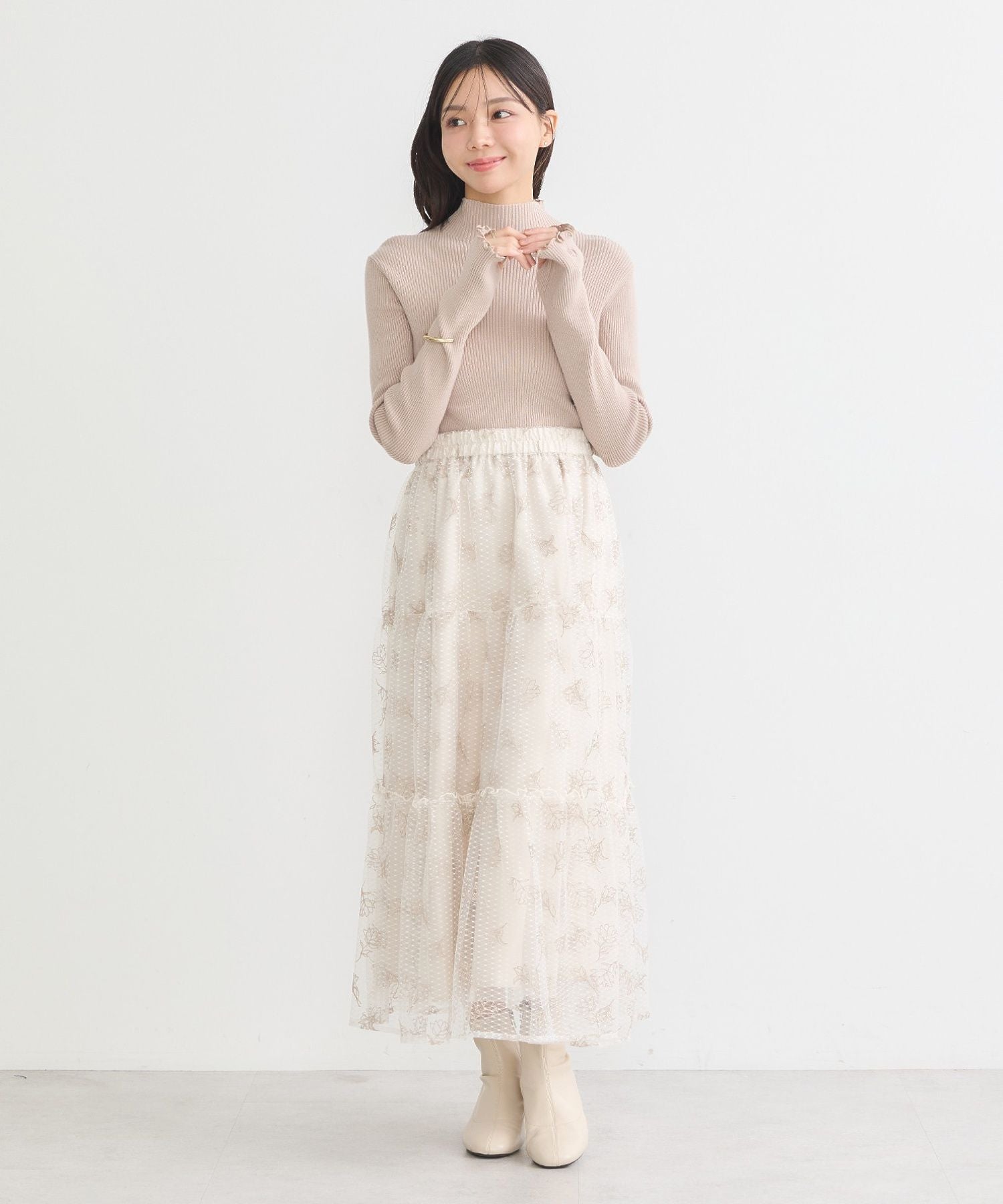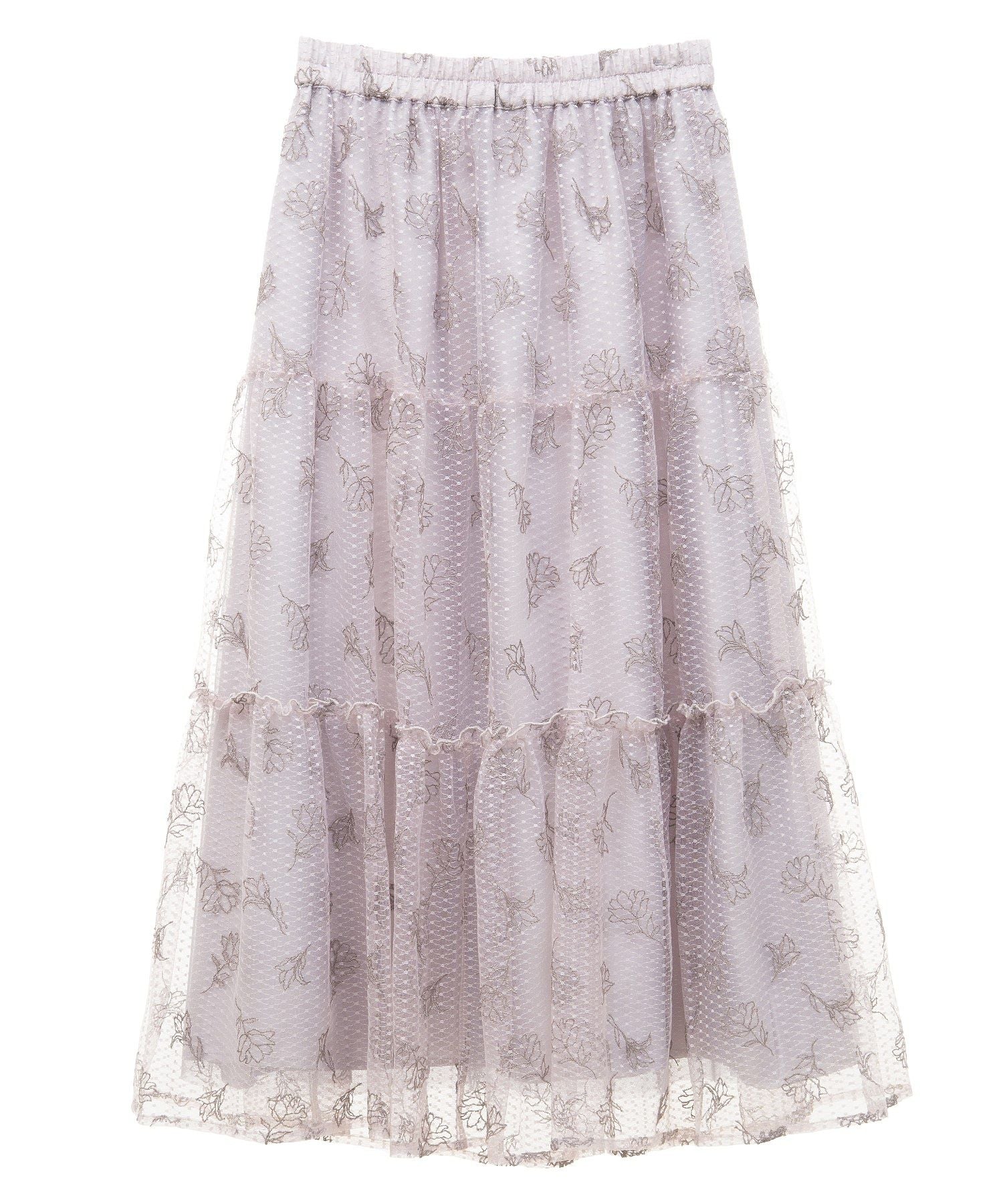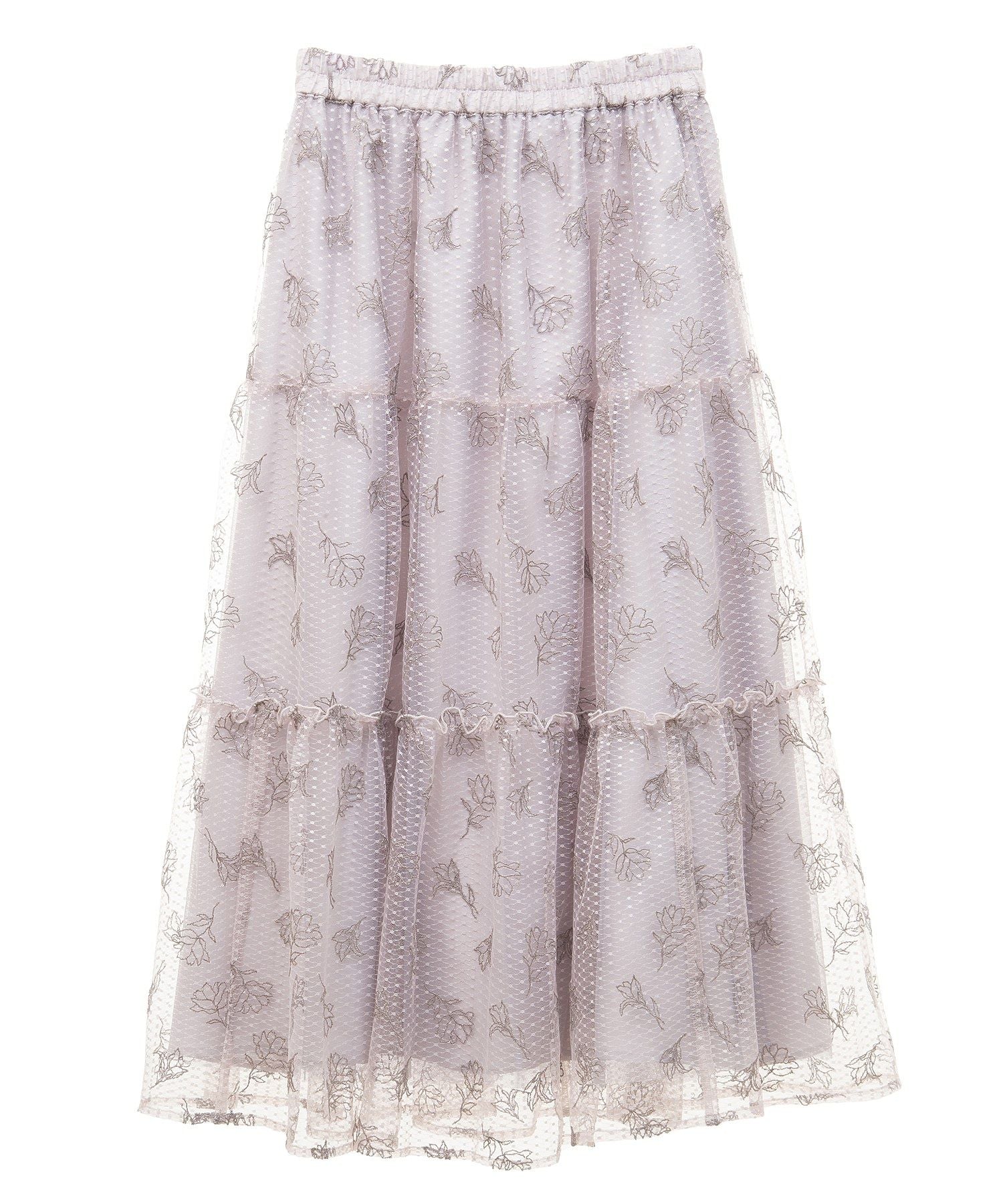 A skirt finished with a feminine and elegant atmosphere by adding tone-on-tone floral embroidery to tulle fabric. The tiered design flares gently towards the hem, and the fully elastic waistband provides a stress-free wearing experience. It also has a lining, allowing you to wear it without worrying about transparency, which is a nice point. It pairs well with casual tops like cut-and-sew or sweatshirts, making it a recommended item that can be used in various coordinate styles.