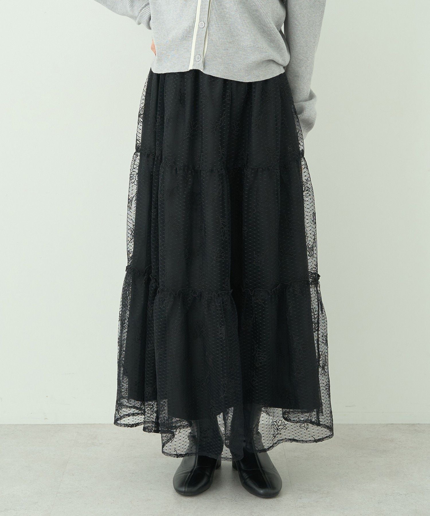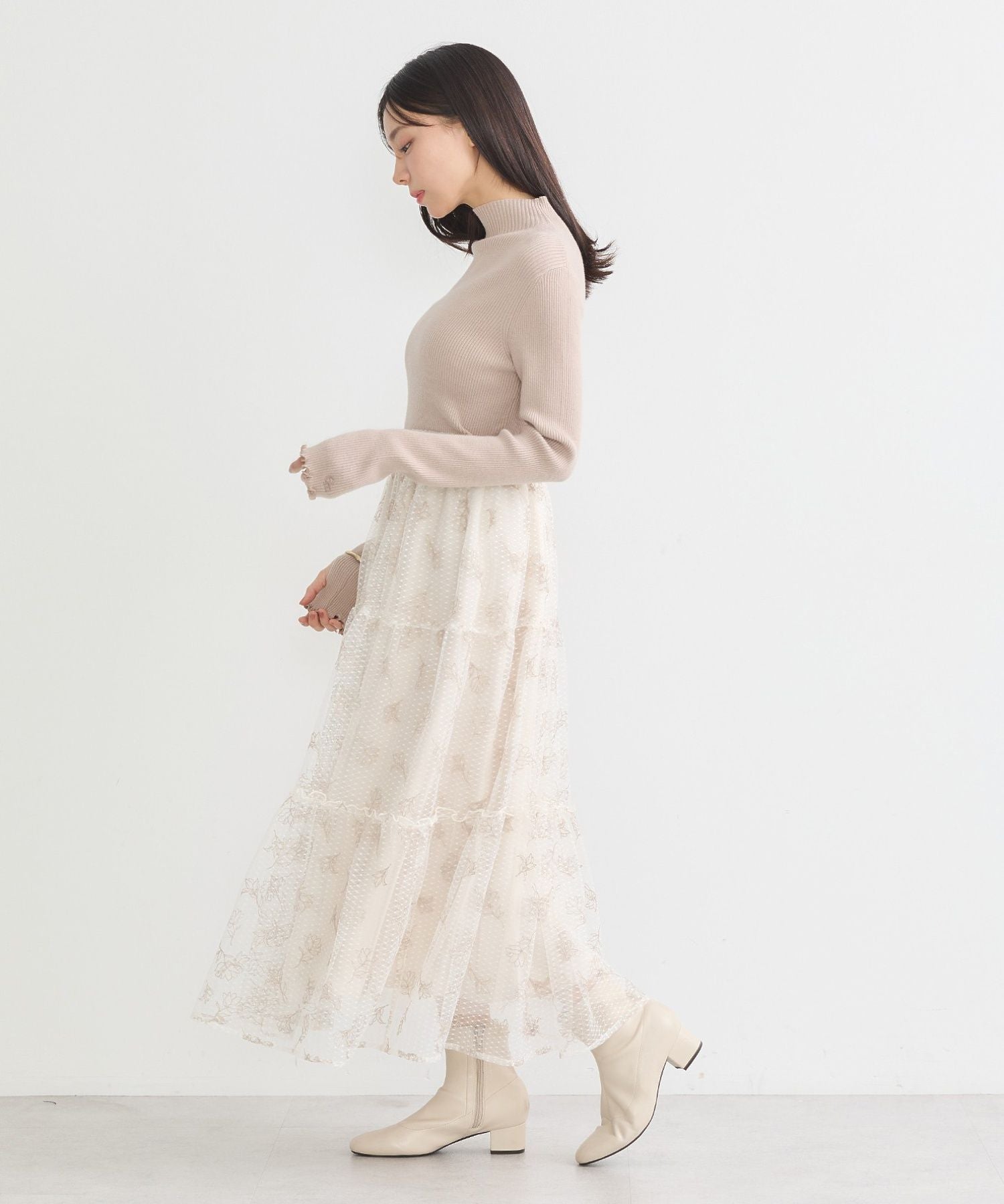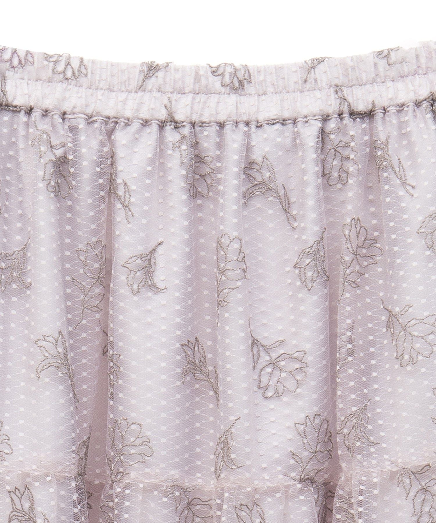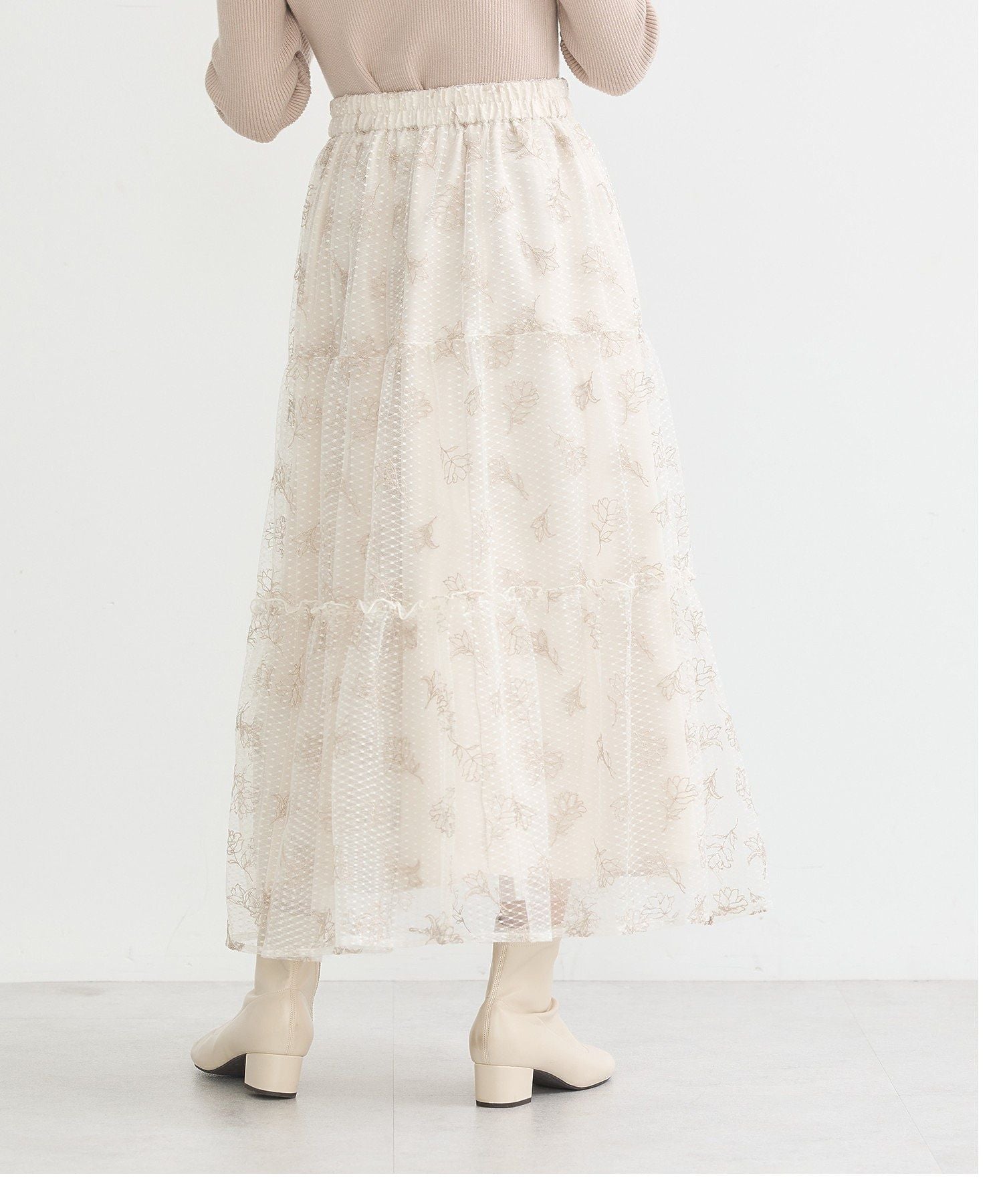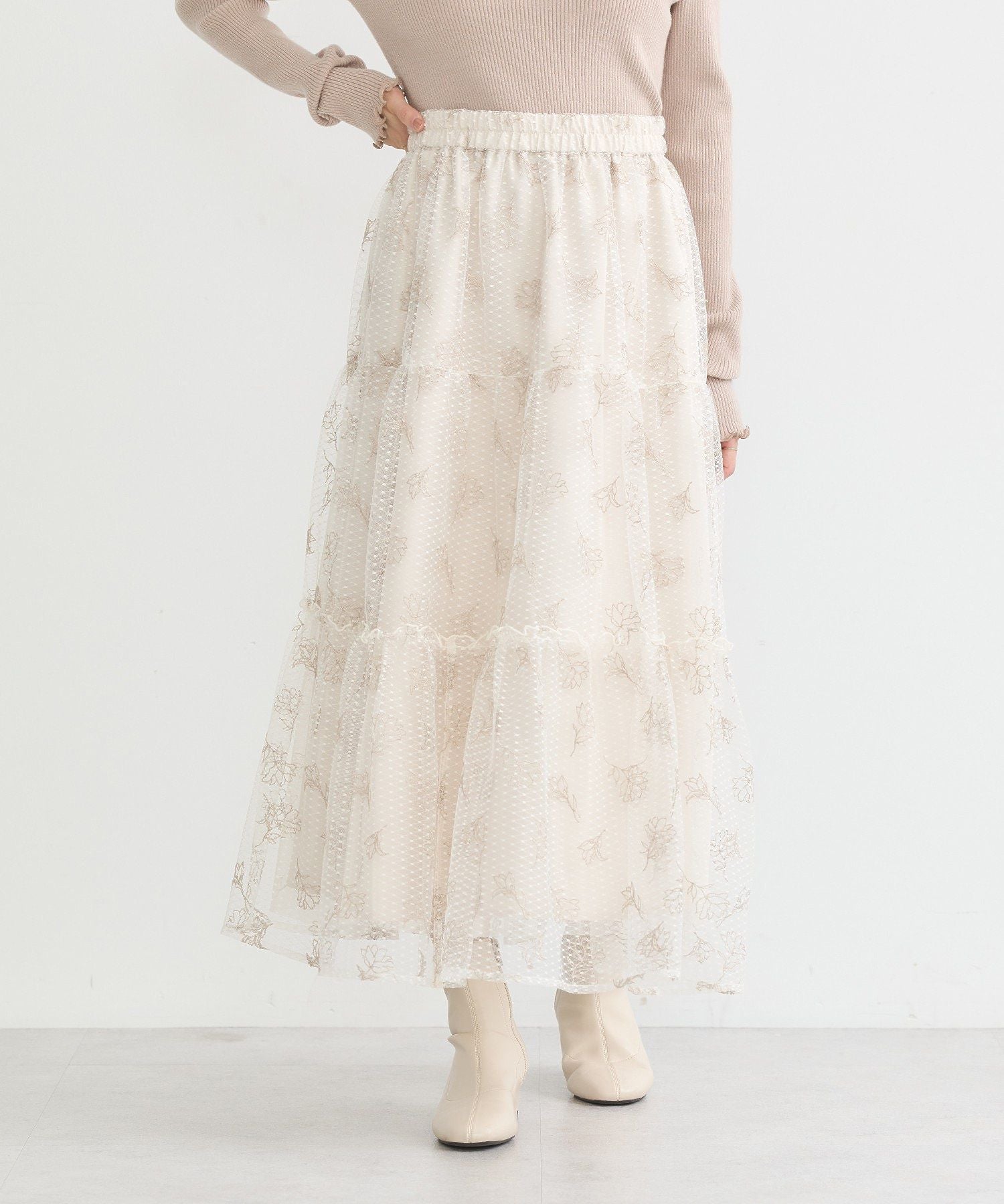 A skirt finished with a feminine and elegant atmosphere by adding tone-on-tone floral embroidery to tulle fabric. The tiered design flares gently towards the hem, and the fully elastic waistband provides a stress-free wearing experience. It also has a lining, allowing you to wear it without worrying about transparency, which is a nice point. It pairs well with casual tops like cut-and-sew or sweatshirts, making it a recommended item that can be used in various coordinate styles.