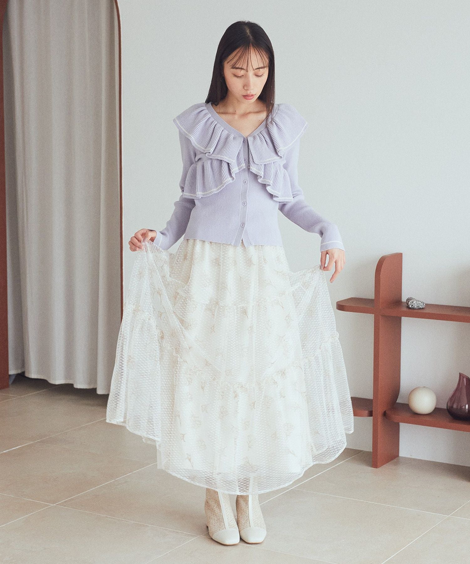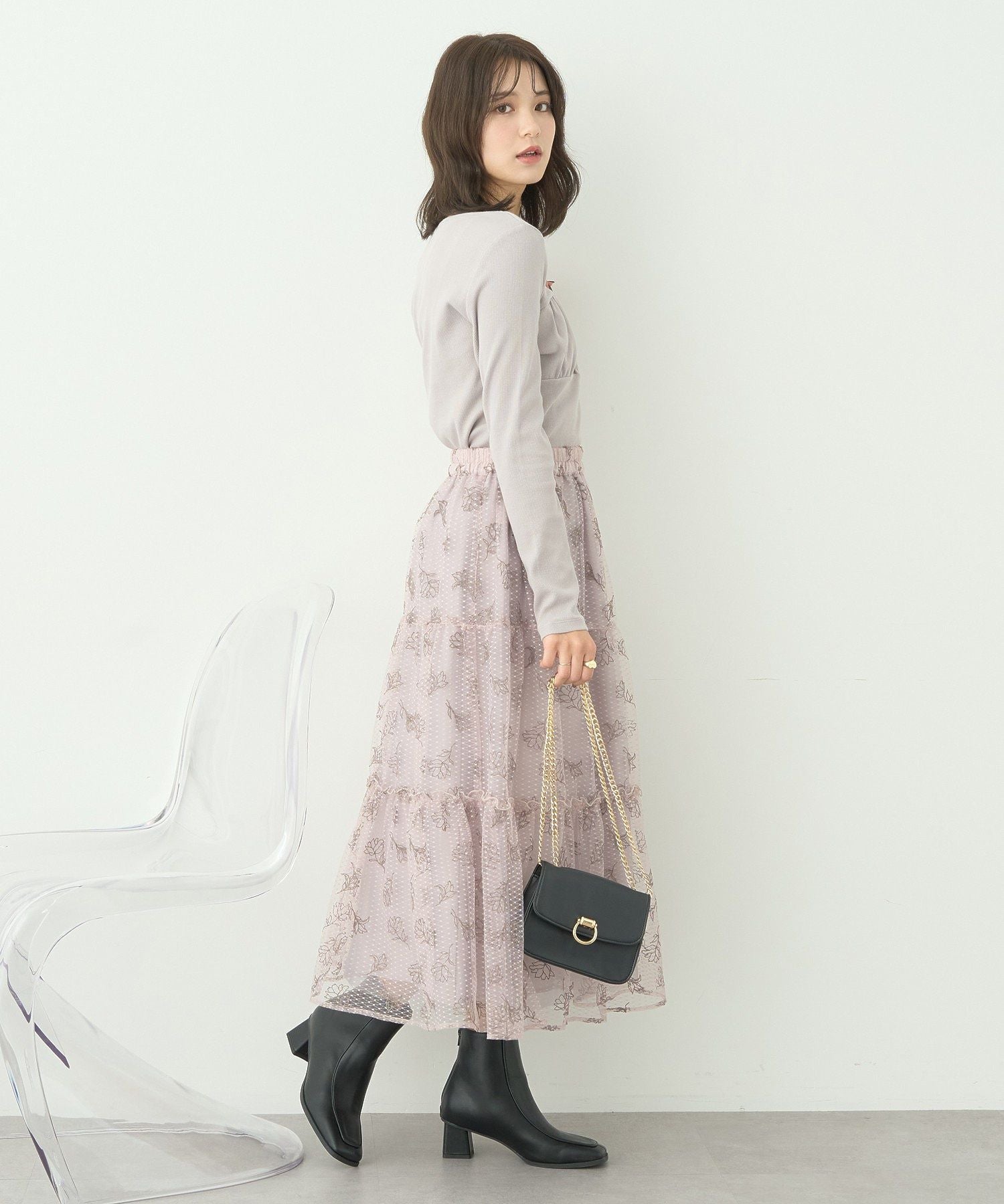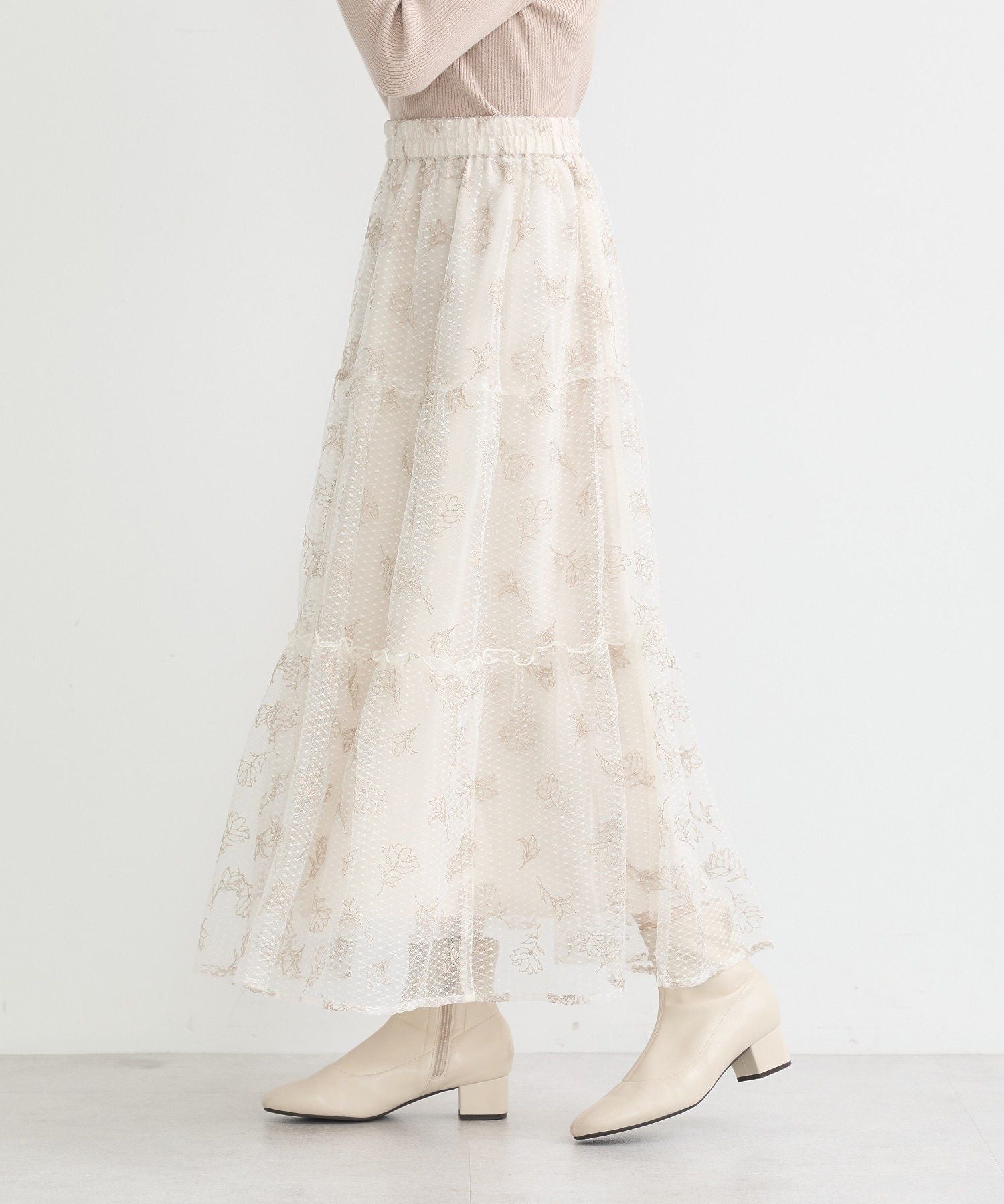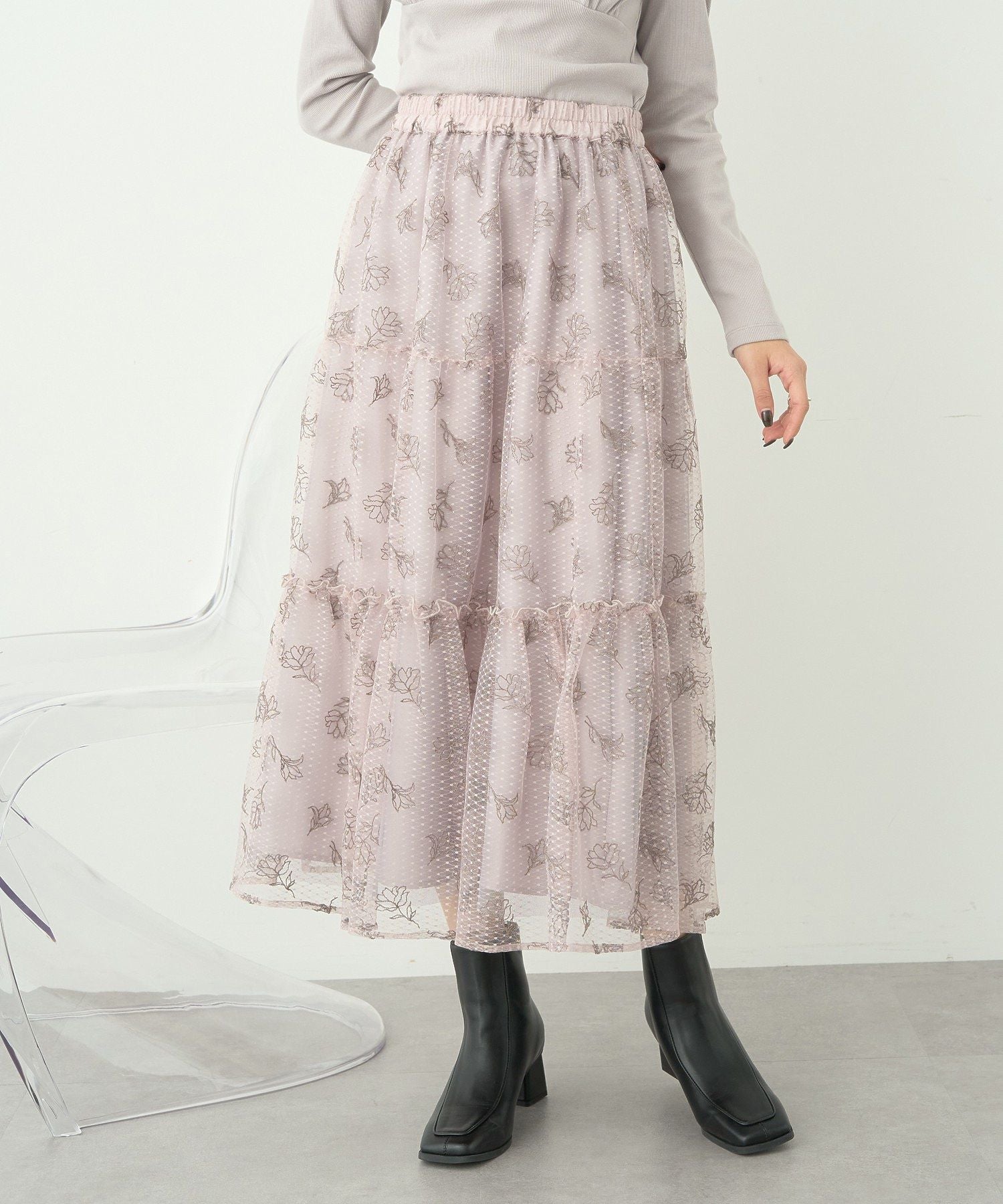A skirt finished with a feminine and elegant atmosphere by adding tone-on-tone floral embroidery to tulle fabric. The tiered design flares gently towards the hem, and the fully elastic waistband provides a stress-free wearing experience. It also has a lining, allowing you to wear it without worrying about transparency, which is a nice point. It pairs well with casual tops like cut-and-sew or sweatshirts, making it a recommended item that can be used in various coordinate styles.
