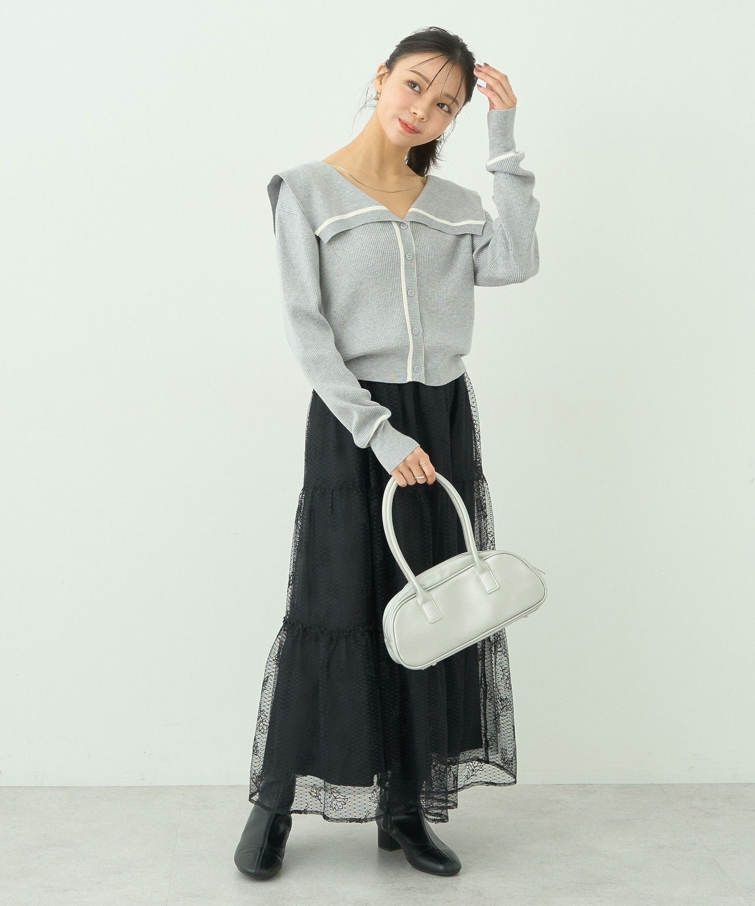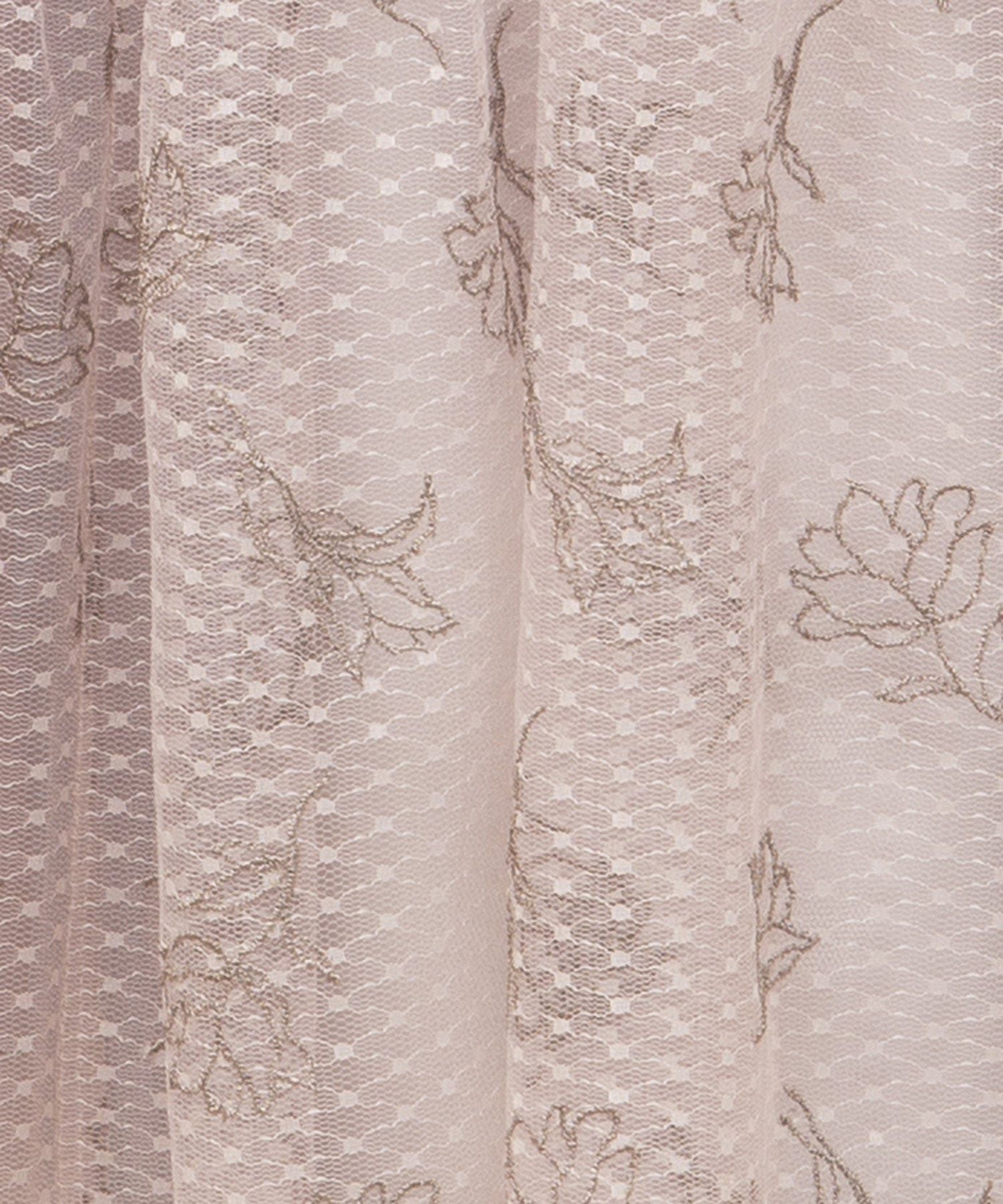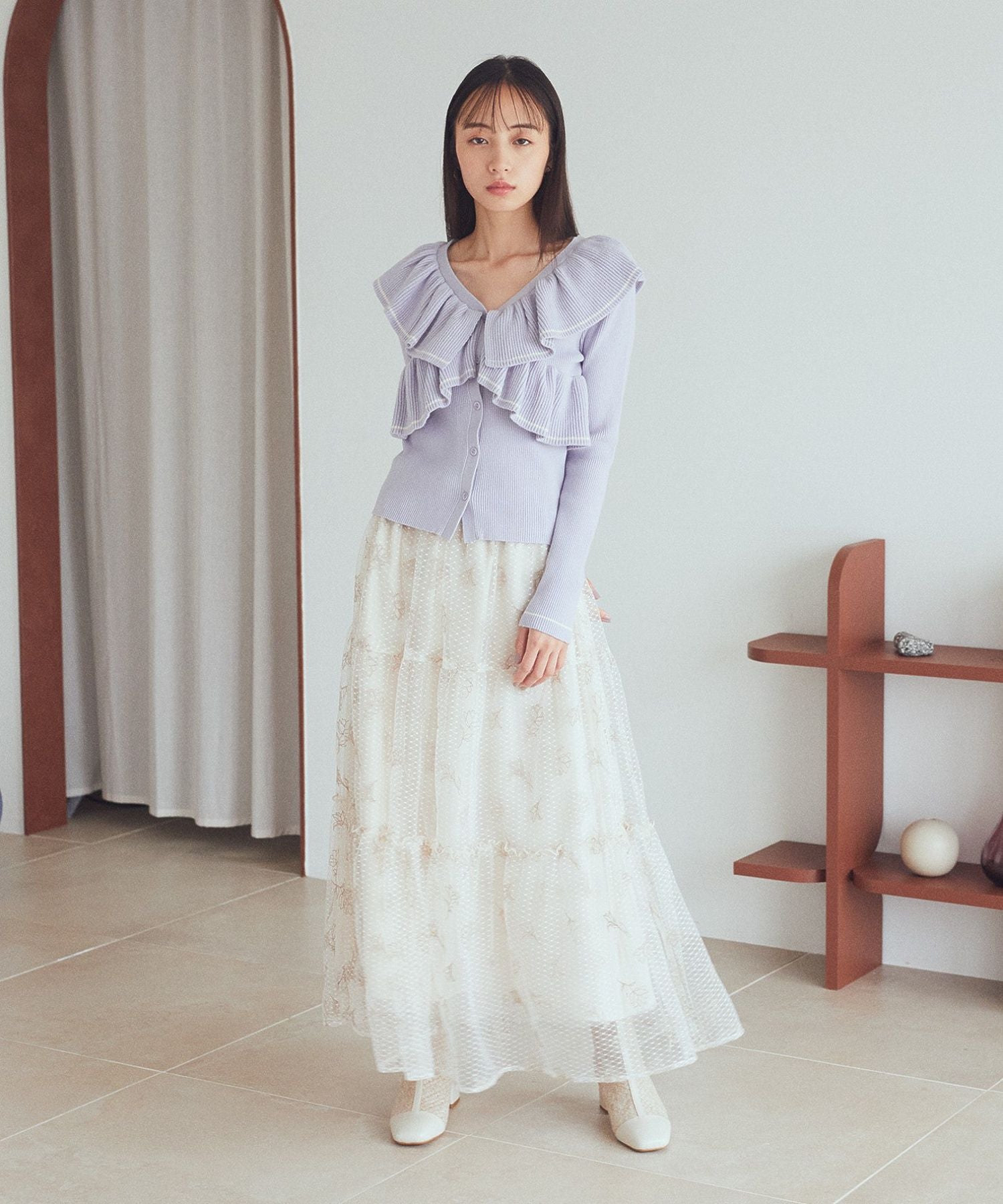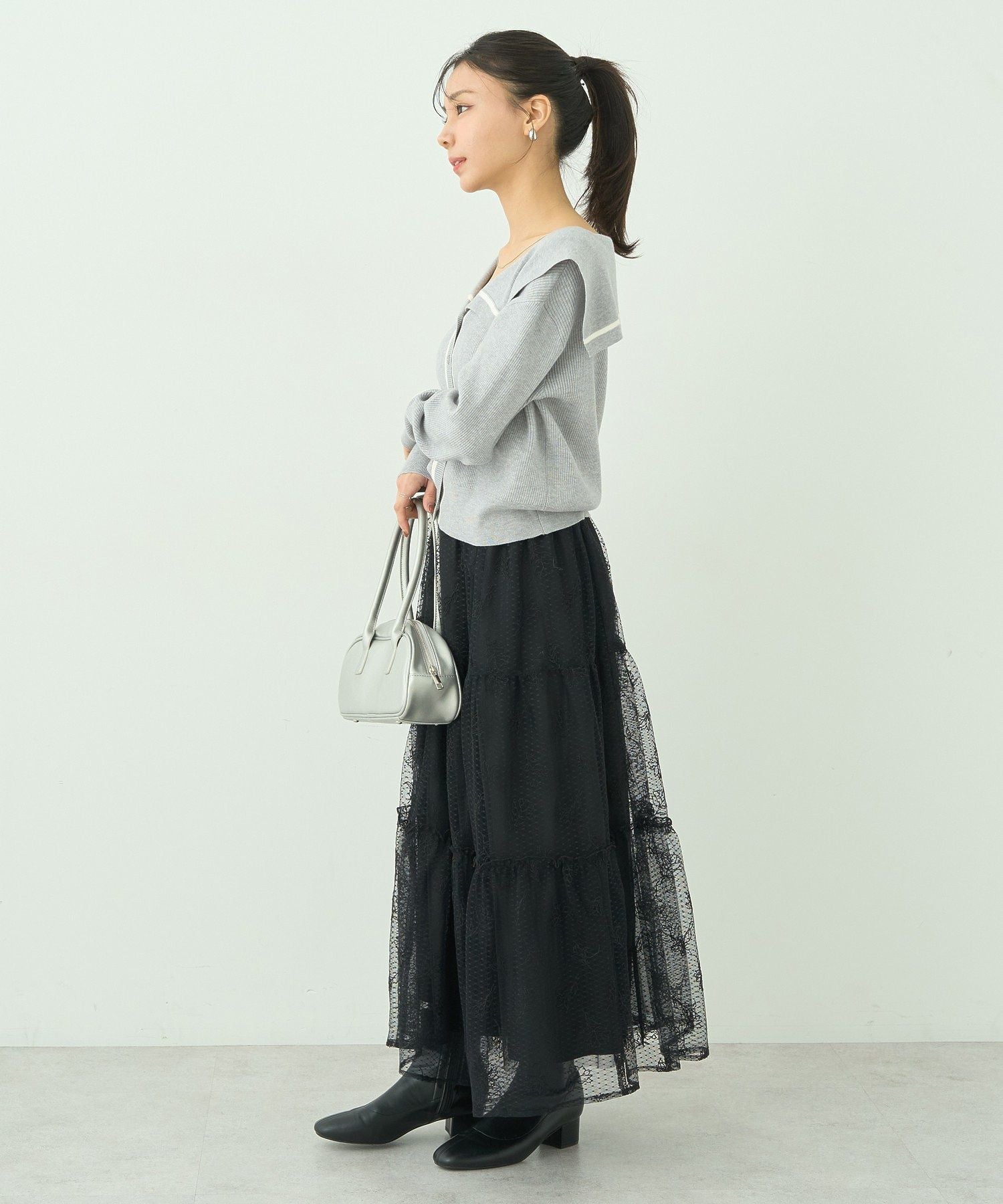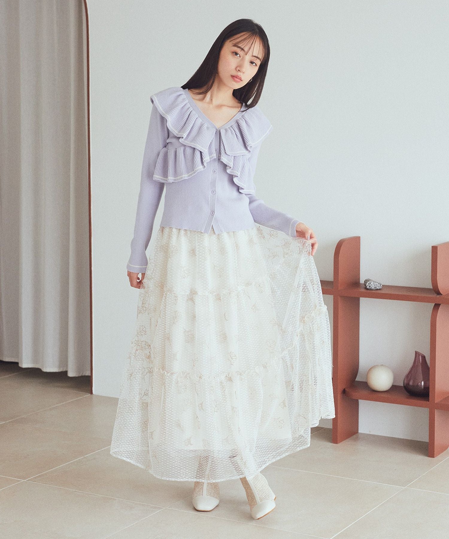 A skirt finished with a feminine and elegant atmosphere by adding tone-on-tone floral embroidery to tulle fabric. The tiered design flares gently towards the hem, and the fully elastic waistband provides a stress-free wearing experience. It also has a lining, allowing you to wear it without worrying about transparency, which is a nice point. It pairs well with casual tops like cut-and-sew or sweatshirts, making it a recommended item that can be used in various coordinate styles.