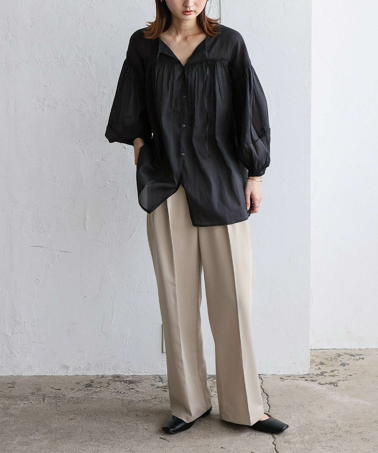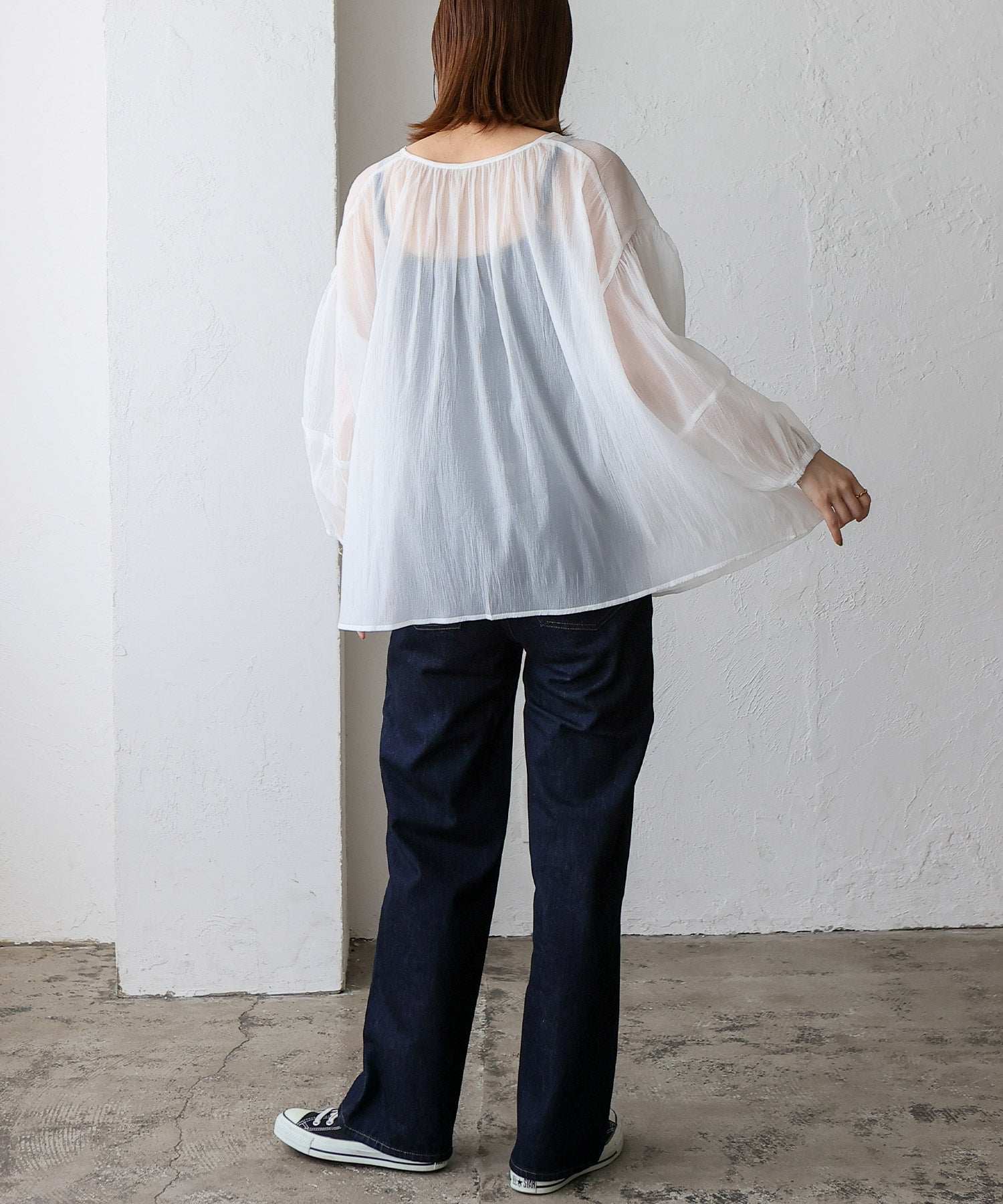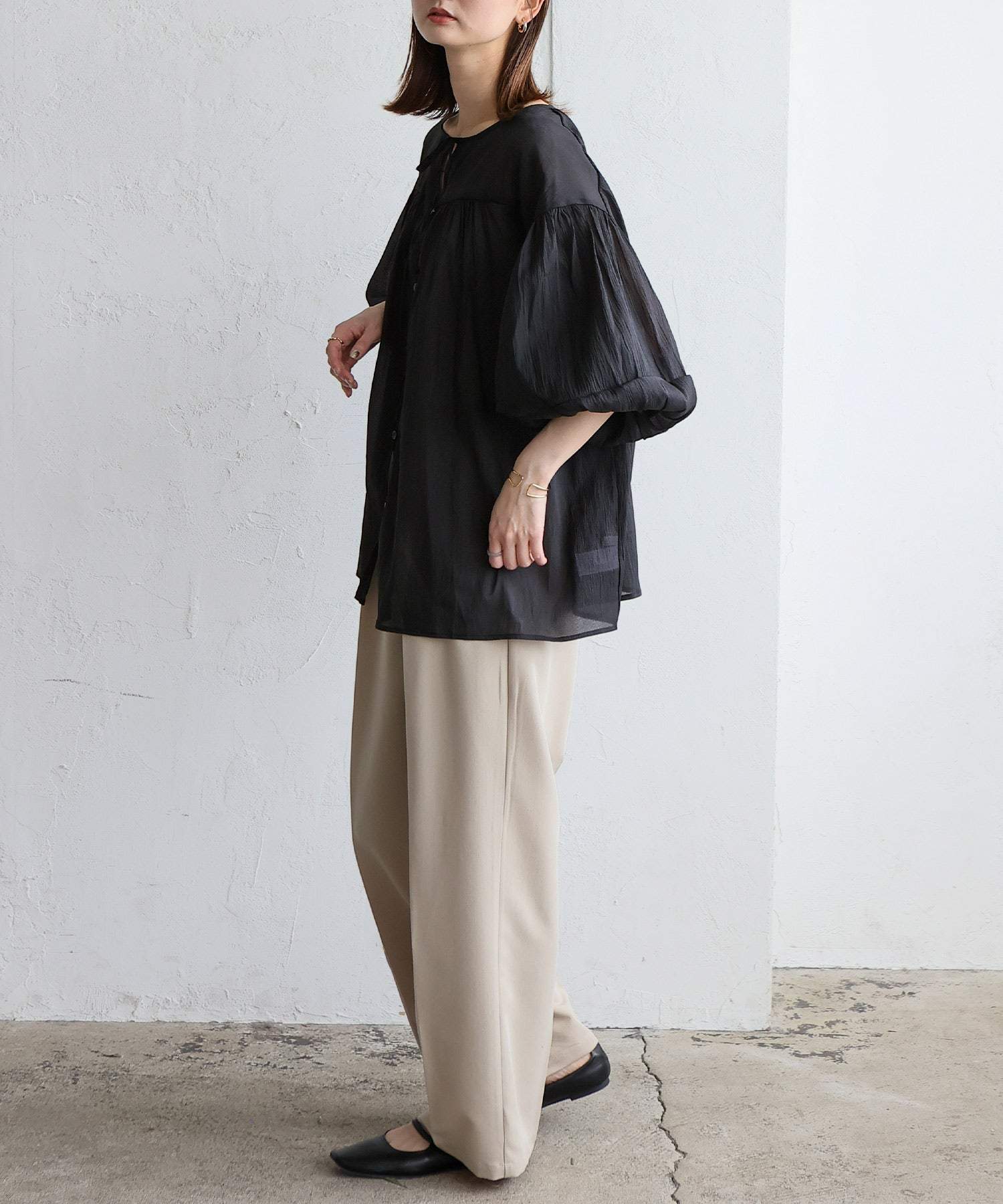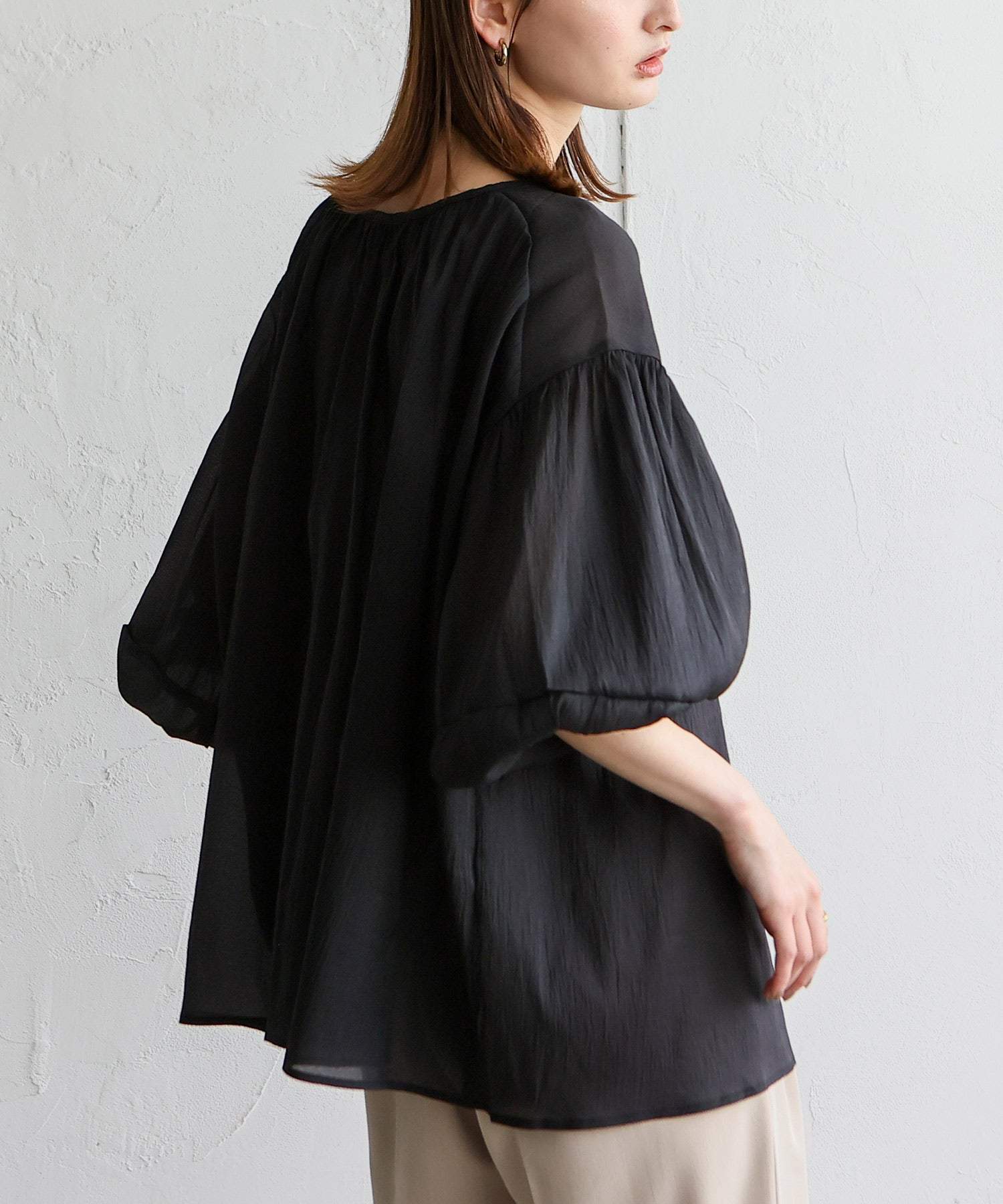 A balloon sleeve sheer blouse with a charming, fluffy silhouette.
