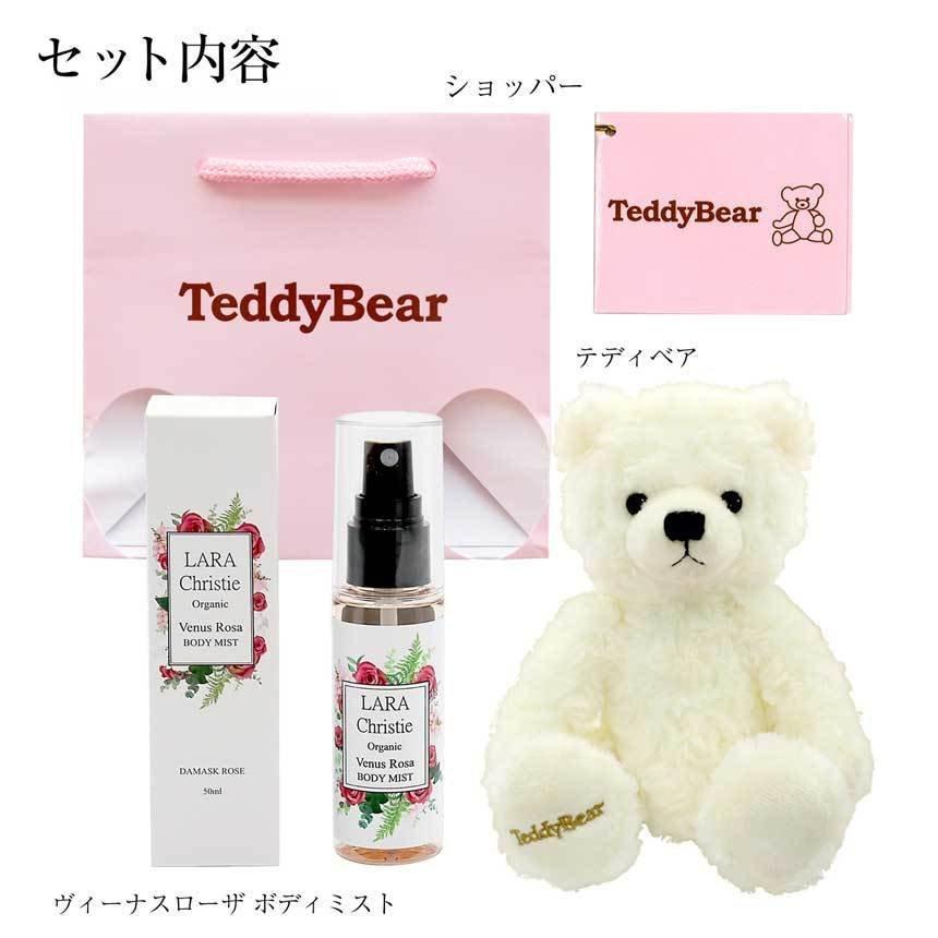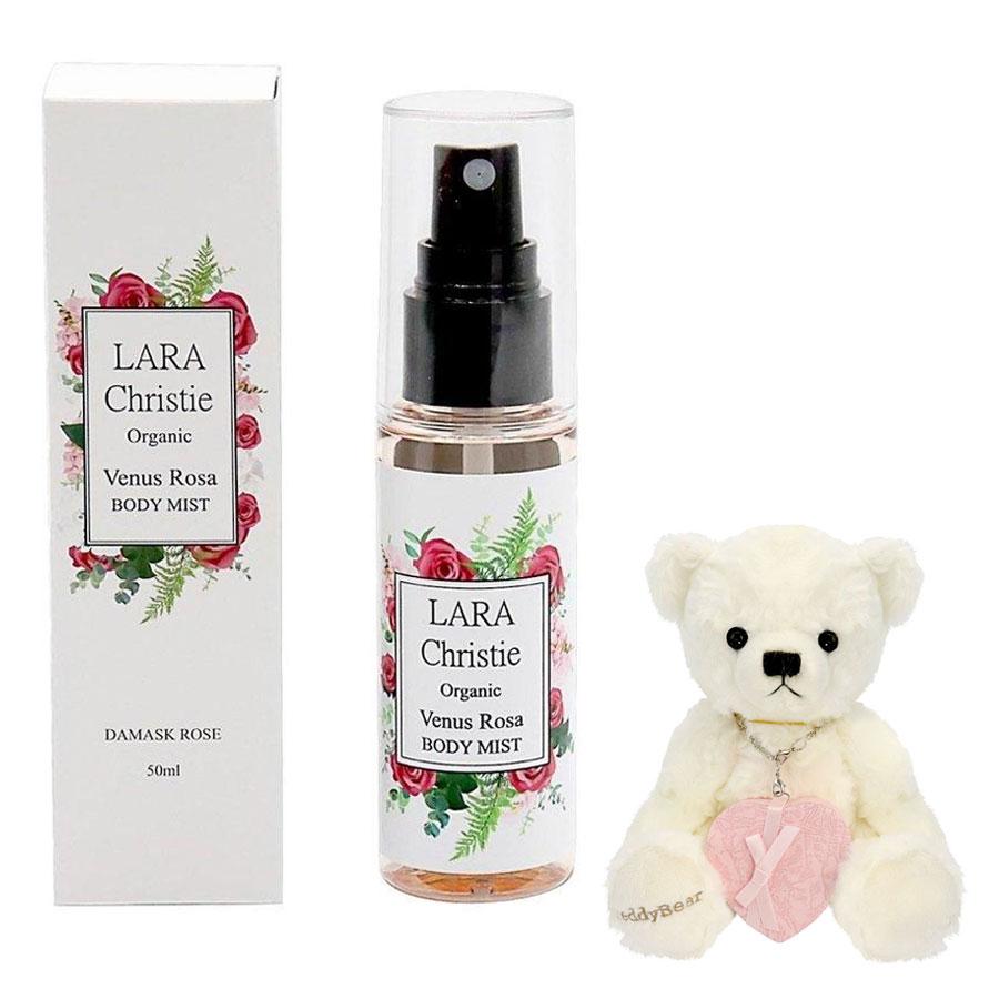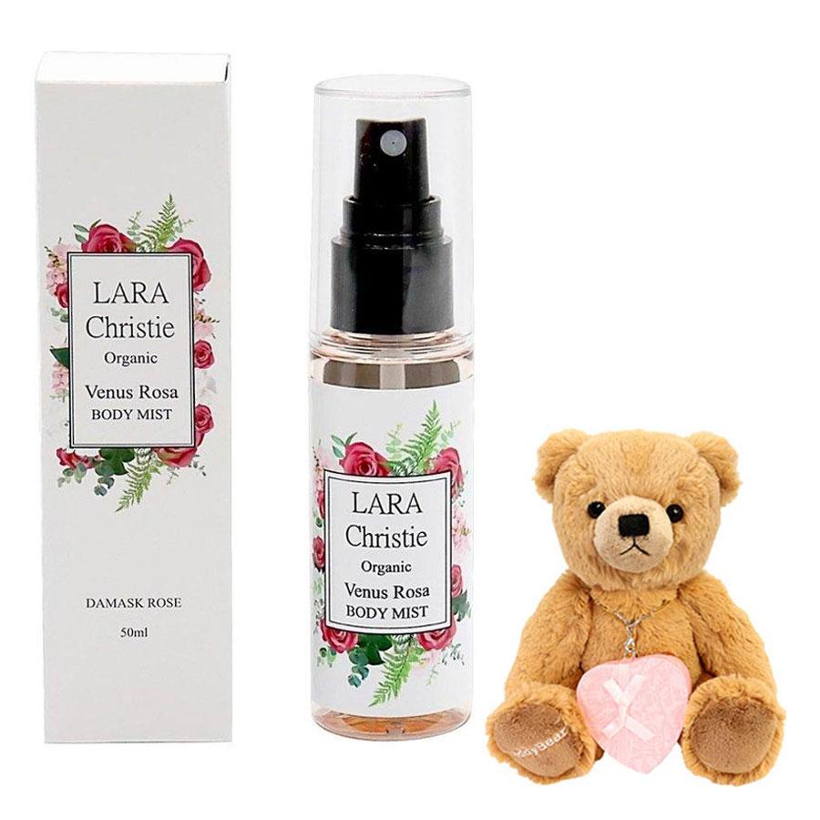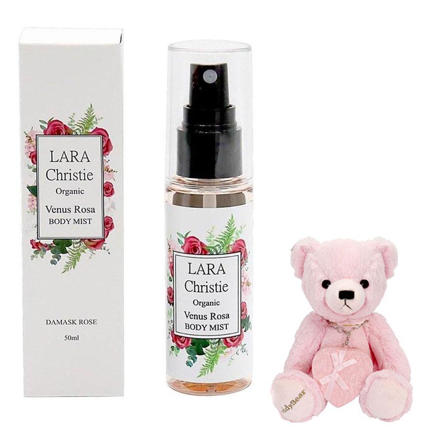 Gift set of the brand Lala Christie Venus Rosa body mist and a cute teddy bear plush toy.