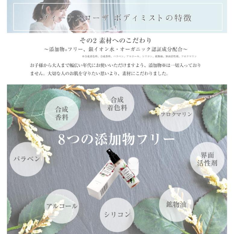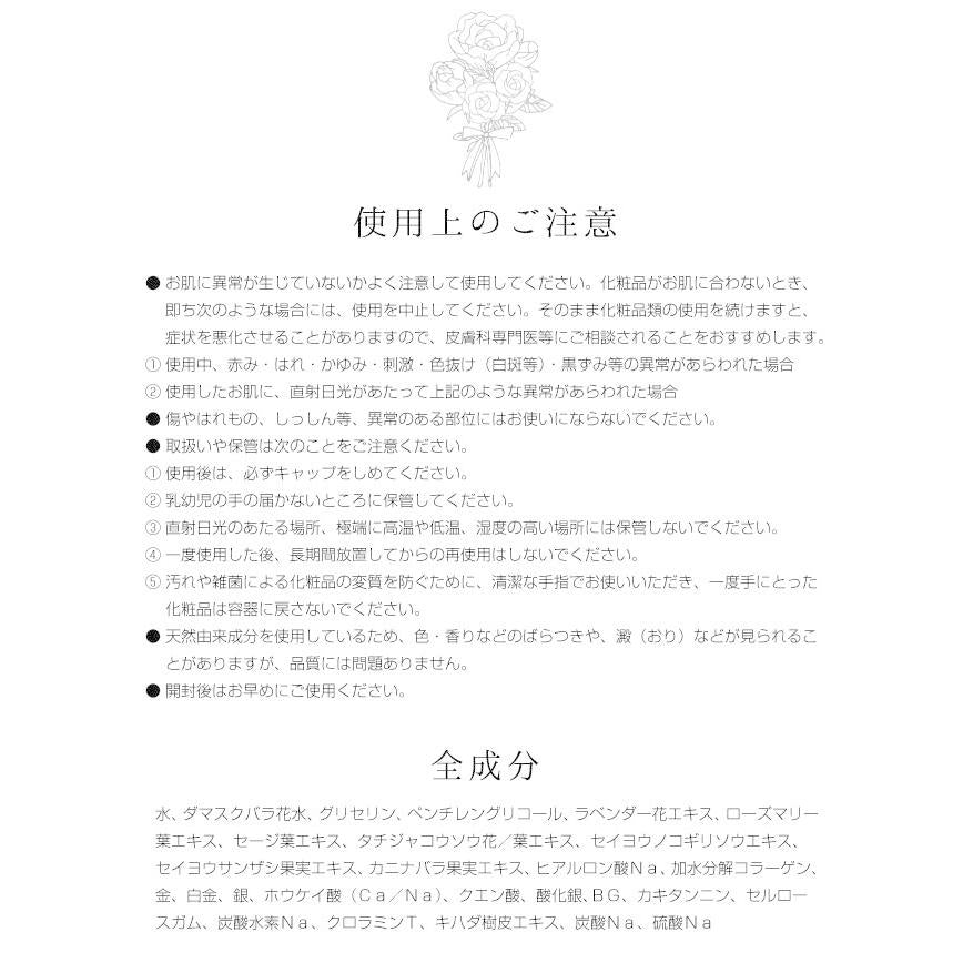 Body mist ingredients: Water, Damask rose flower water, Glycerin, Pentylene glycol, Lavender flower extract, Rosemary leaf extract, Sage leaf extract, Thymus serpyllum flower/leaf extract, Western yarrow extract, Western hawthorn fruit extract, Dog rose fruit extract, Sodium hyaluronate, Hydrolyzed collagen, Gold, Platinum, Silver, Boric acid (Ca/Na), Citric acid, Silver oxide, BG, Persimmon tannin, Cellulose gum, Sodium bicarbonate, Chloroamin T, Yellow dock bark extract, Sodium carbonate, Sodium sulfate.