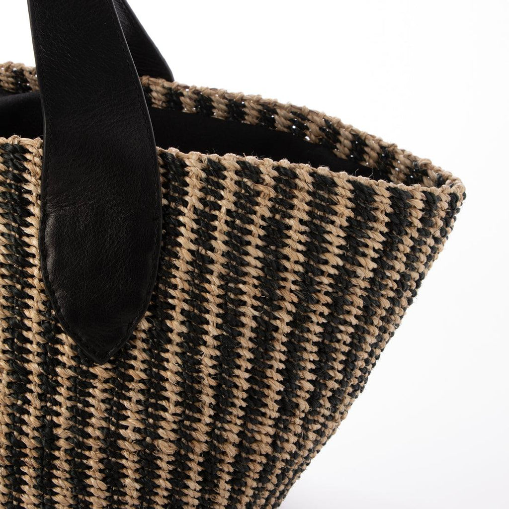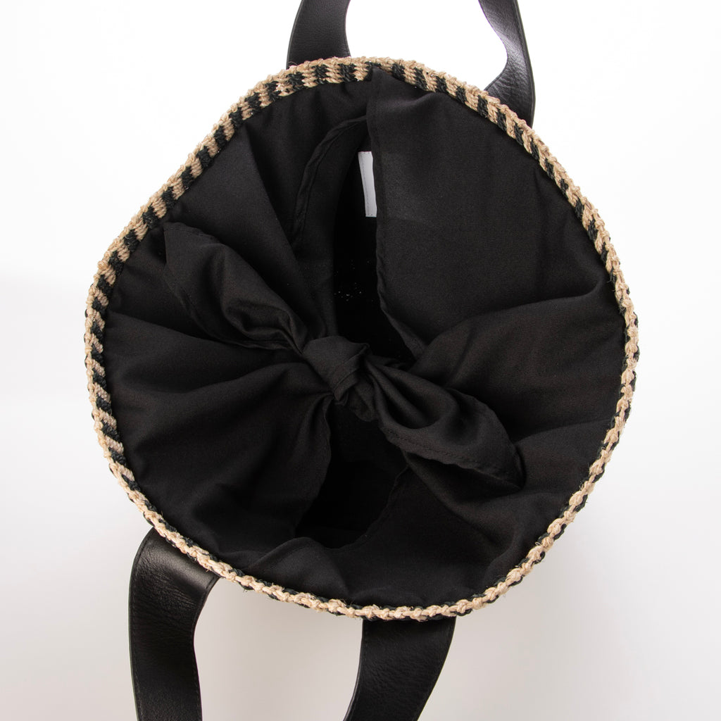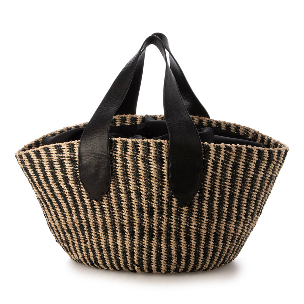 A tote bag that features a charming mix of natural raffia material and supple faux leather.