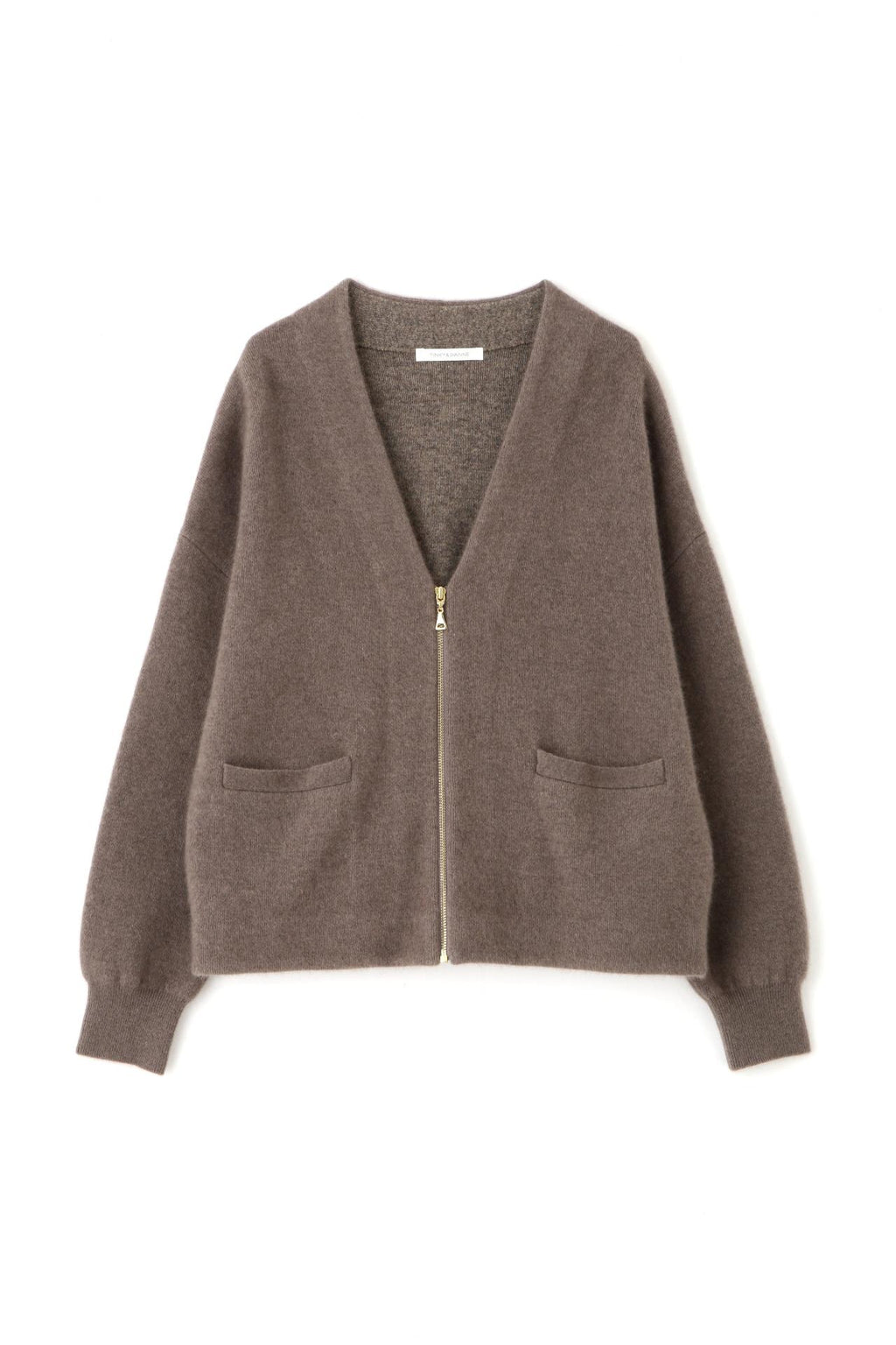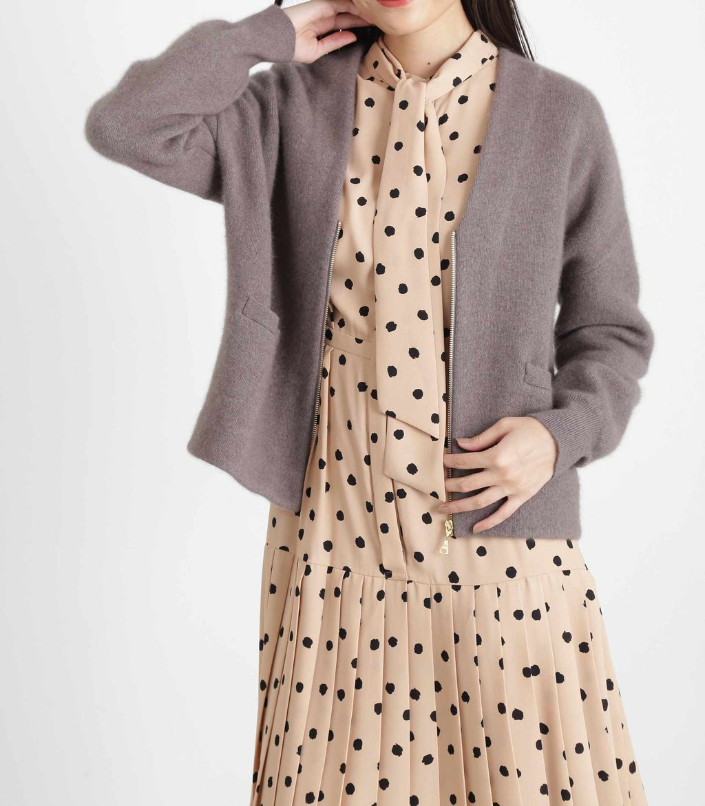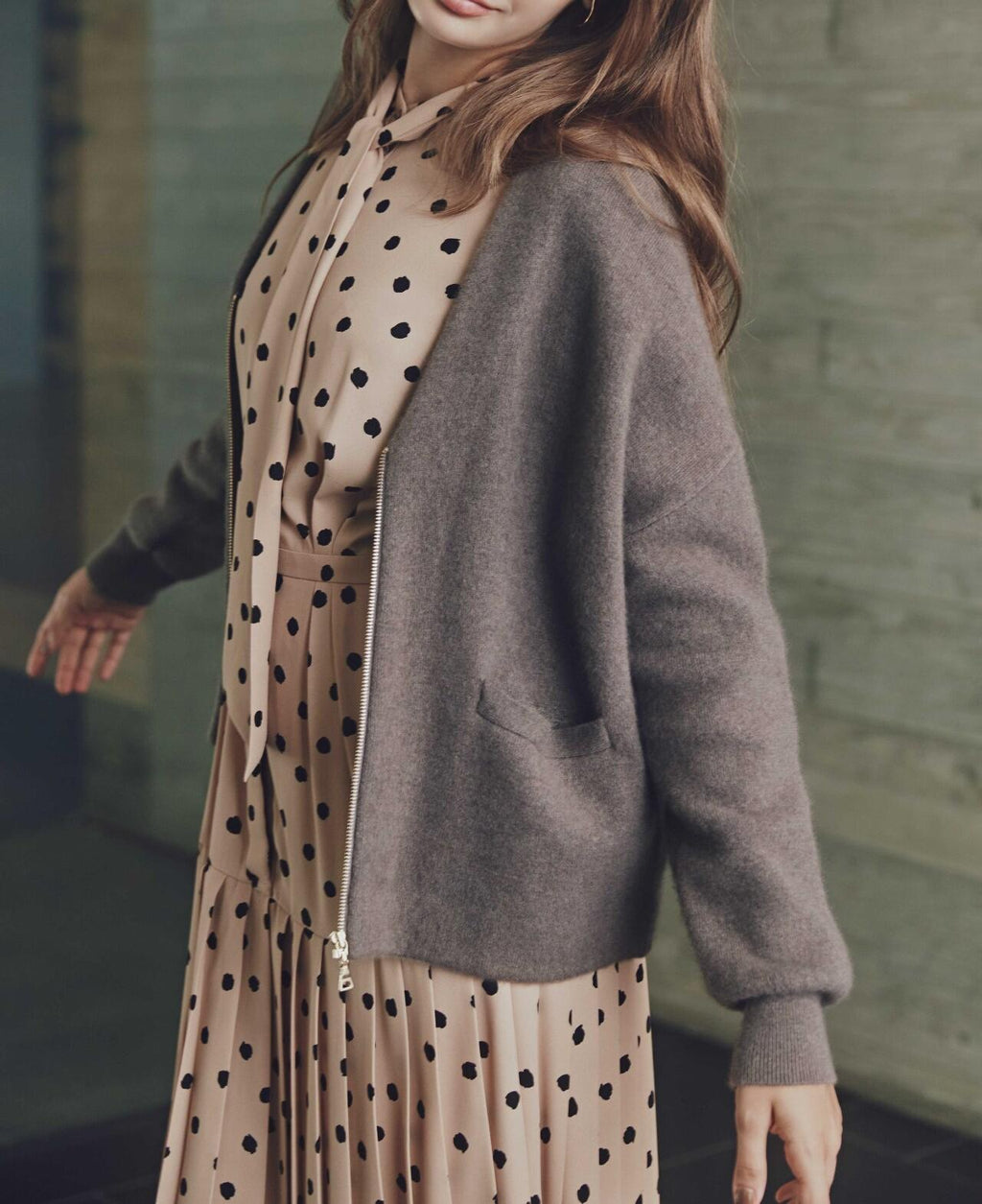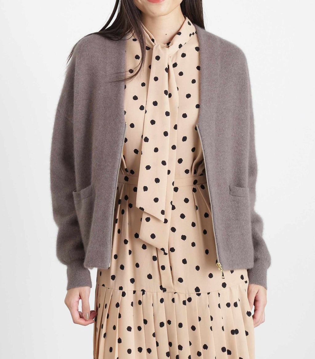 A brushed knit bomber with a pile texture that is feminine. The vertically long V-neck and smooth metal zipper add sharpness and a sense of luxury to the feminine material. The surface is a wool blend with pile, and the back is bonded with polyester, making it easy to wear and resistant to sagging. It is a versatile mid-layer outerwear that can be worn as a layer over T-shirts during the transition seasons from summer to autumn, and as an inner layer under coats in the winter peak.