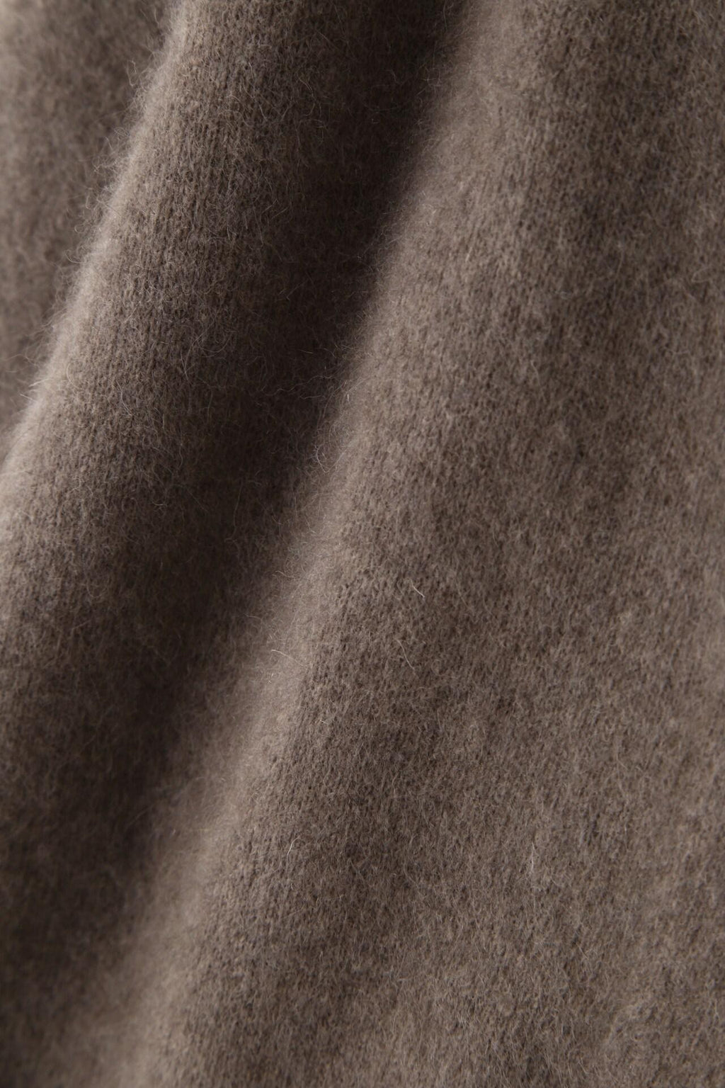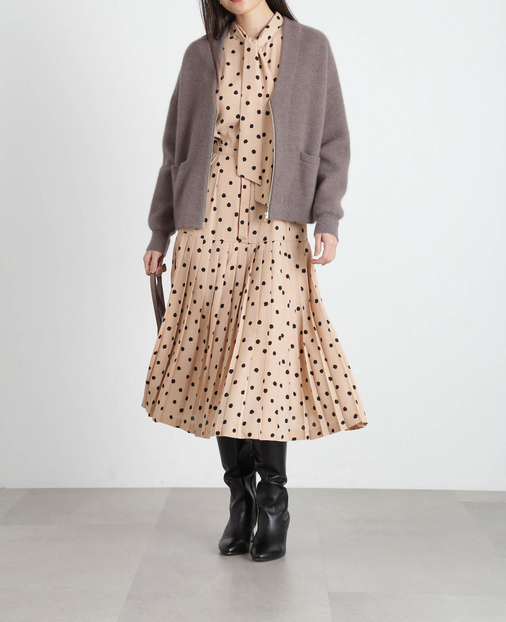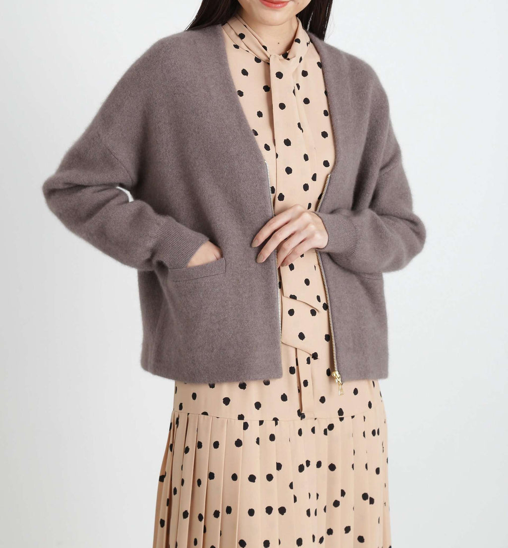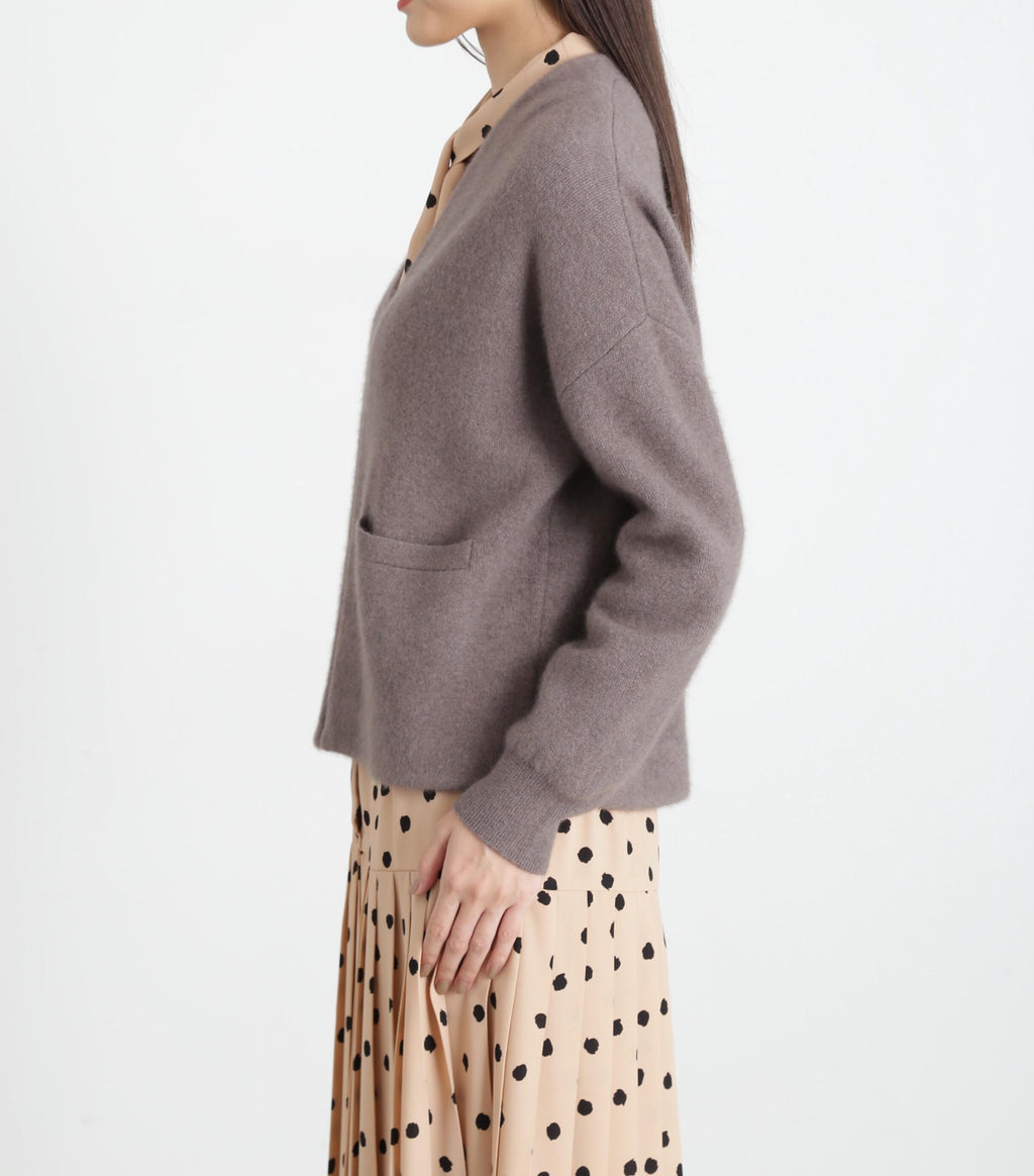 A brushed knit bomber with a pile texture that is feminine. The vertically long V-neck and smooth metal zipper add sharpness and a sense of luxury to the feminine material. The surface is a wool blend with pile, and the back is bonded with polyester, making it easy to wear and resistant to sagging. It is a versatile mid-layer outerwear that can be worn as a layer over T-shirts during the transition seasons from summer to autumn, and as an inner layer under coats in the winter peak.