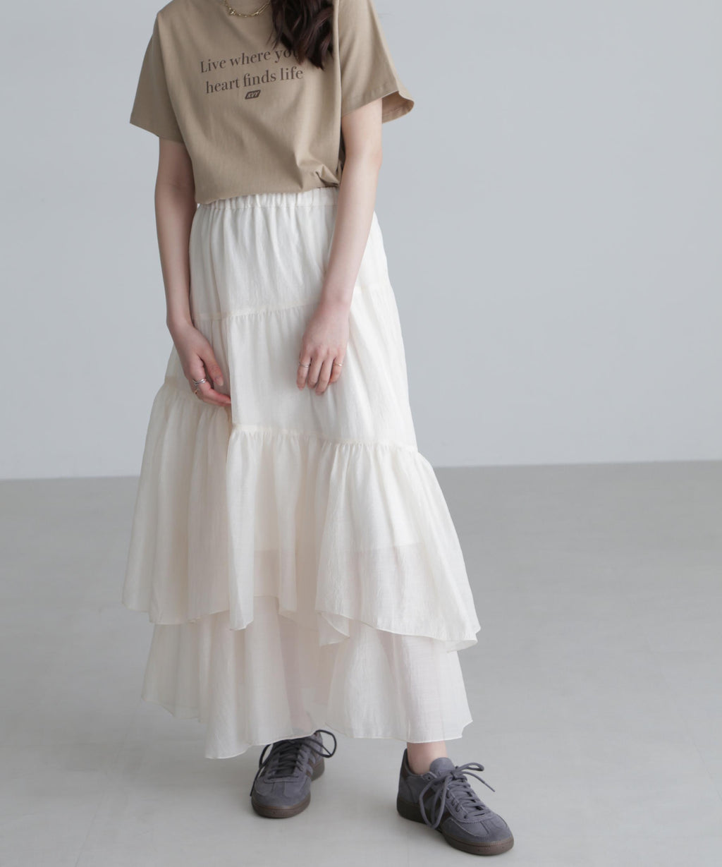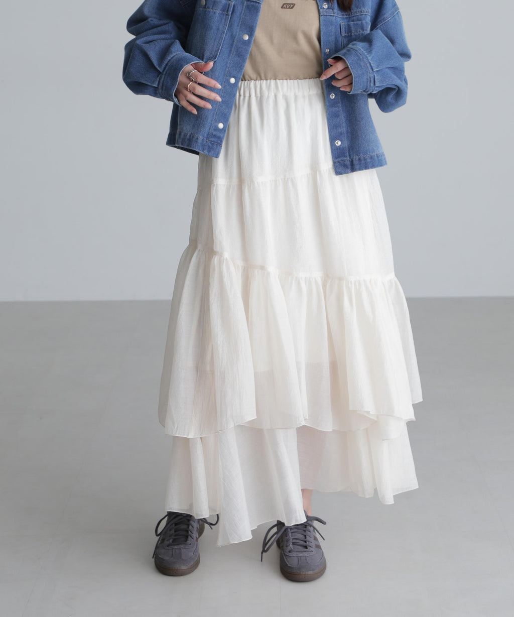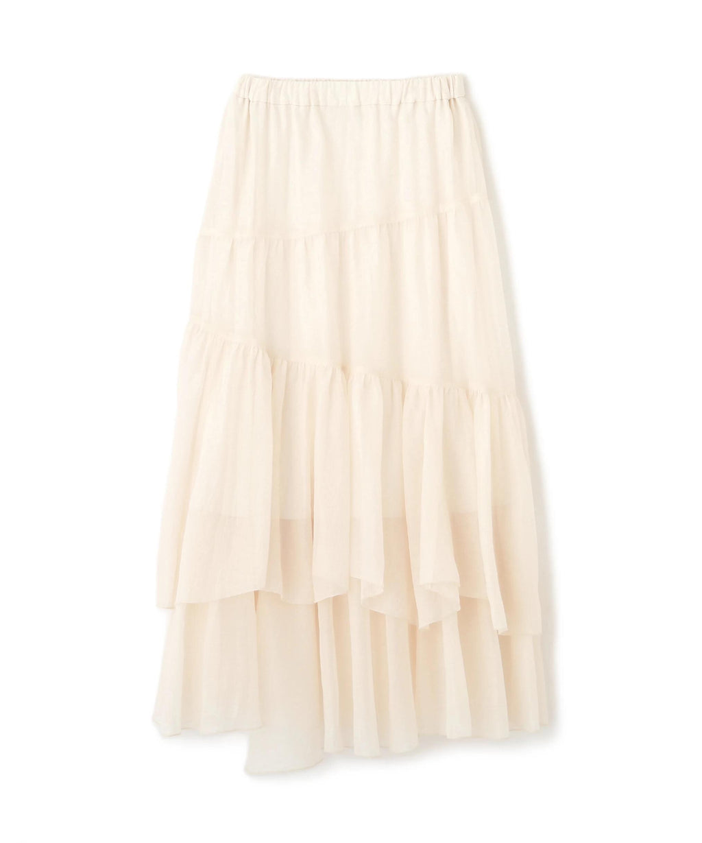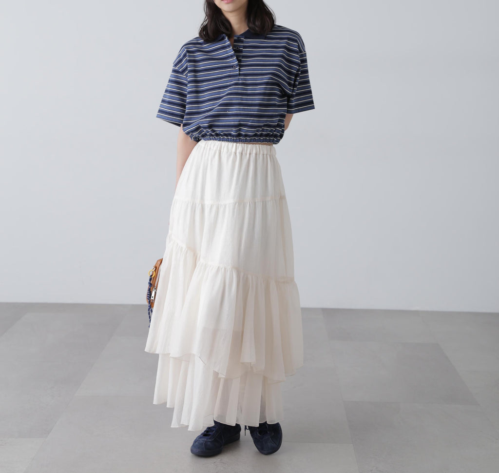[fabric&design] A tiered frill skirt with a light volume and sheer feeling that creates a glamorous impression. The asymmetric switching and the dynamic hemline are key points. The silhouette with a gentle sway every time you walk offers a feminine charm, making it a truly attractive piece. The waist is elastic, and a soft lining that prevents transparency is used for comfortable wear. [styling] Besides a compact knit, it is recommended to pair with a color-block line polo shirt or a logo T-shirt for a sweet and spicy mix coordinate.
