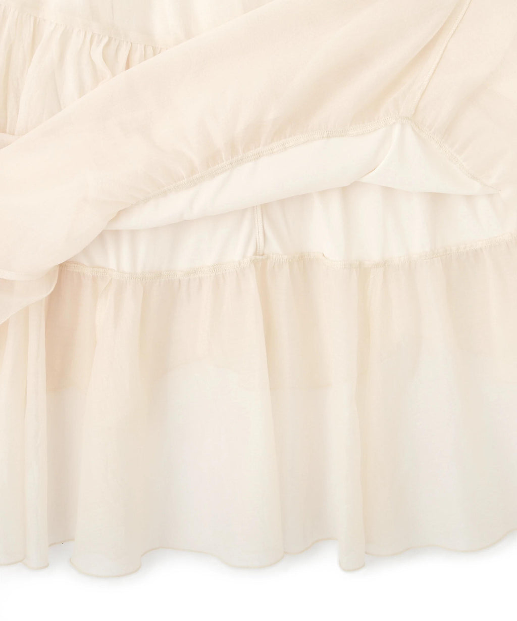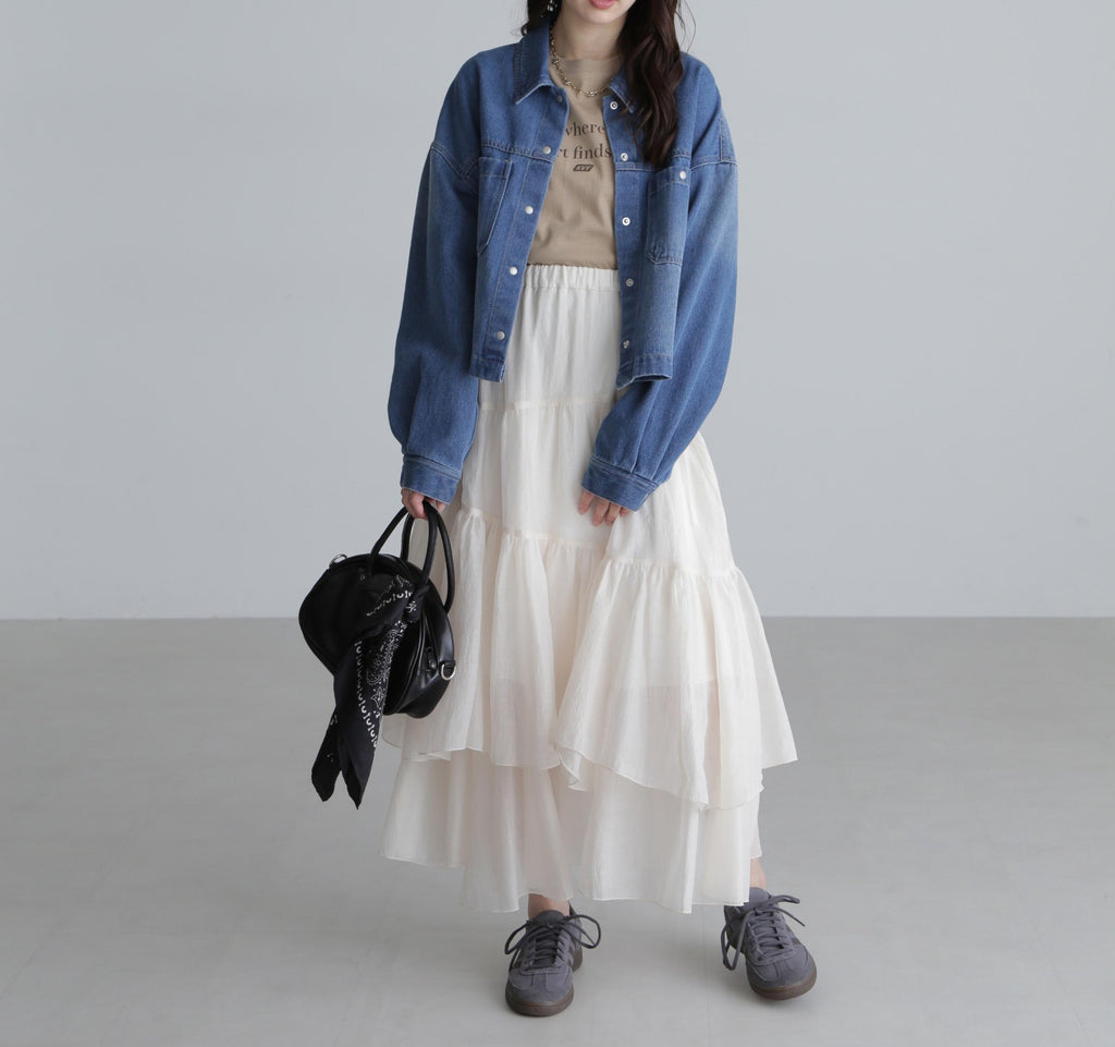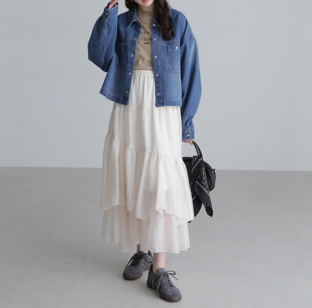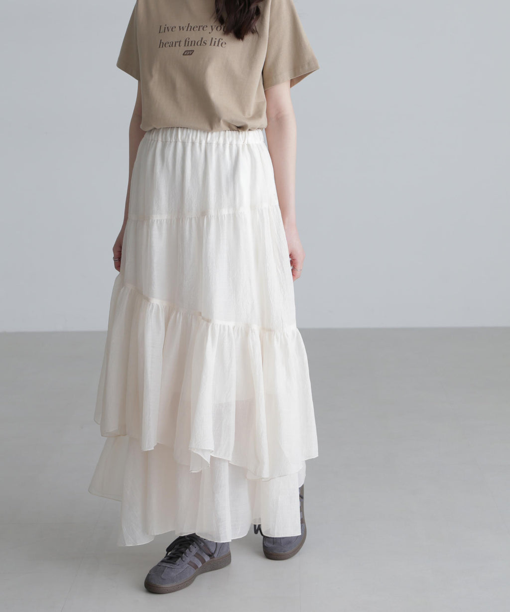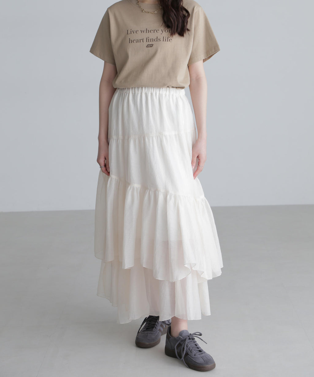 [fabric&design] A tiered frill skirt with a light volume and sheer feeling that creates a glamorous impression. The asymmetric switching and the dynamic hemline are key points. The silhouette with a gentle sway every time you walk offers a feminine charm, making it a truly attractive piece. The waist is elastic, and a soft lining that prevents transparency is used for comfortable wear. [styling] Besides a compact knit, it is recommended to pair with a color-block line polo shirt or a logo T-shirt for a sweet and spicy mix coordinate.