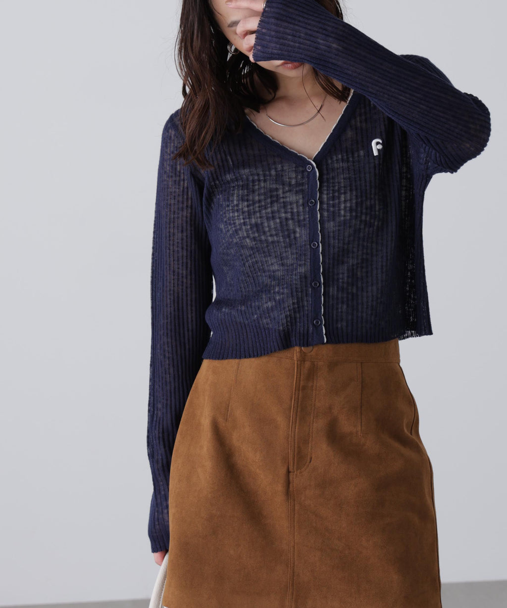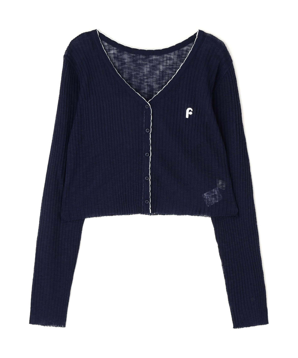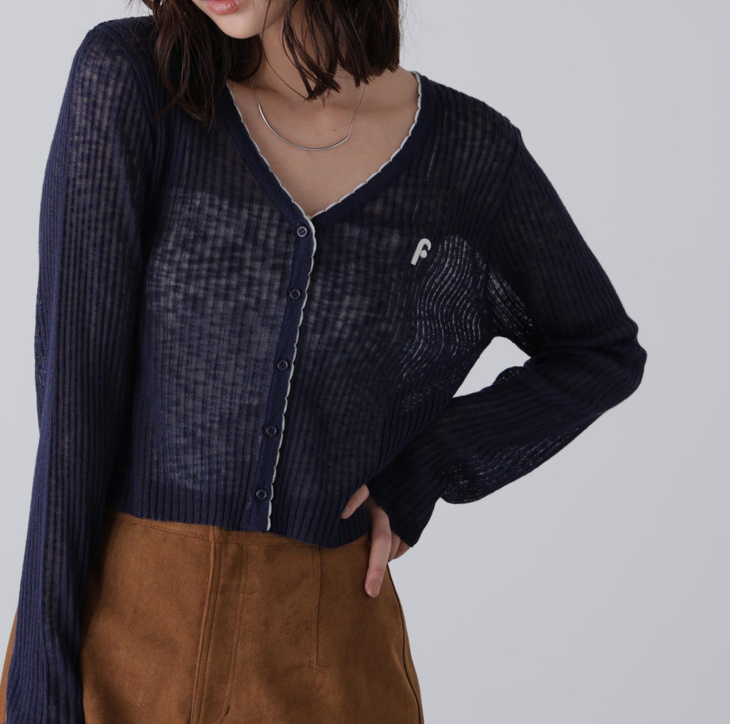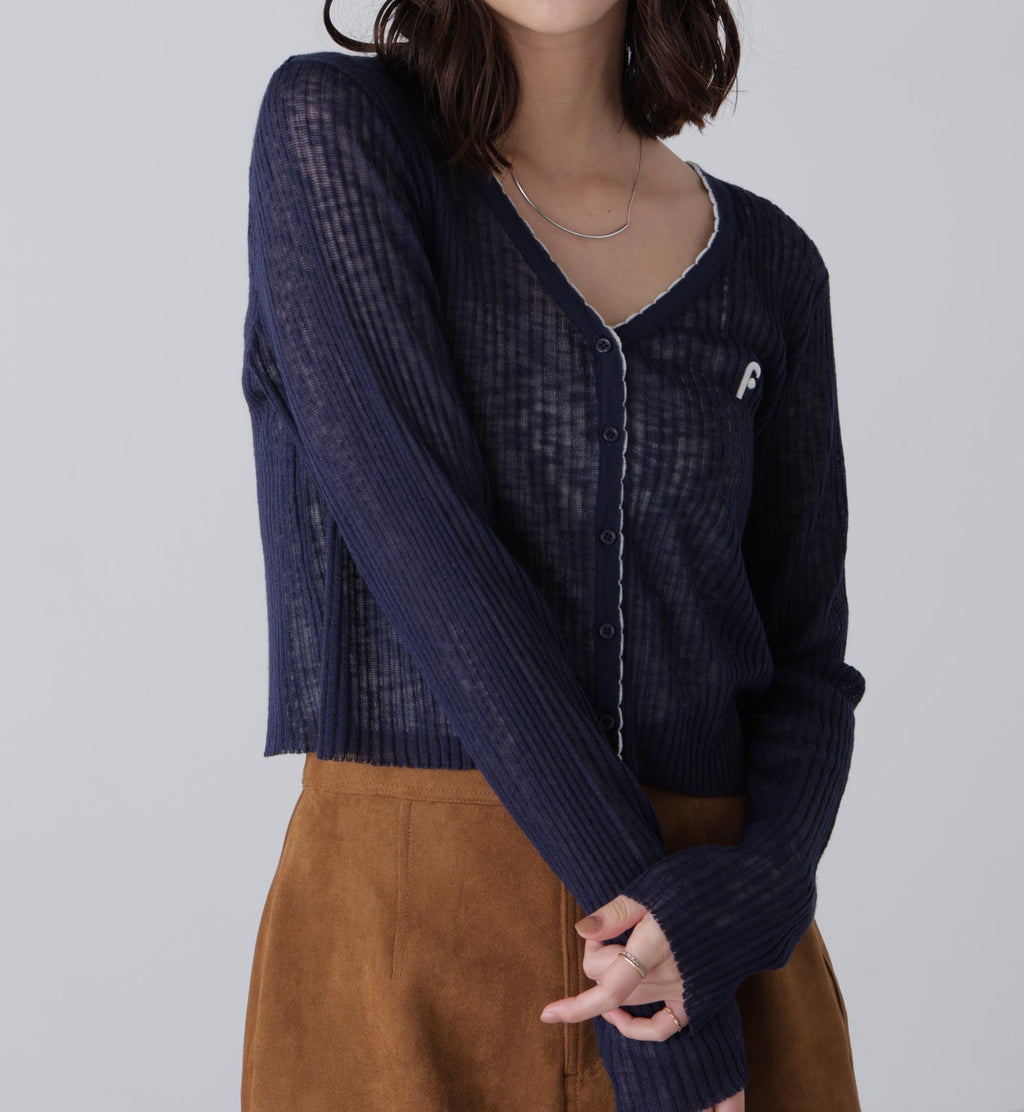 A refreshing, smooth-to-the-touch sheer rib knit cardigan. The slub yarn gives it a casual vibe. The delicate color-blocked scallop design on the front adds sweetness. The brand's initials are featured on the logo tape at the chest, giving a casual impression. When layered over wide denim and a camisole with a built-in bra, it creates a relaxed casual look. Buttoning up the front and pairing with a mini skirt allows you to enjoy a girly preppy style.