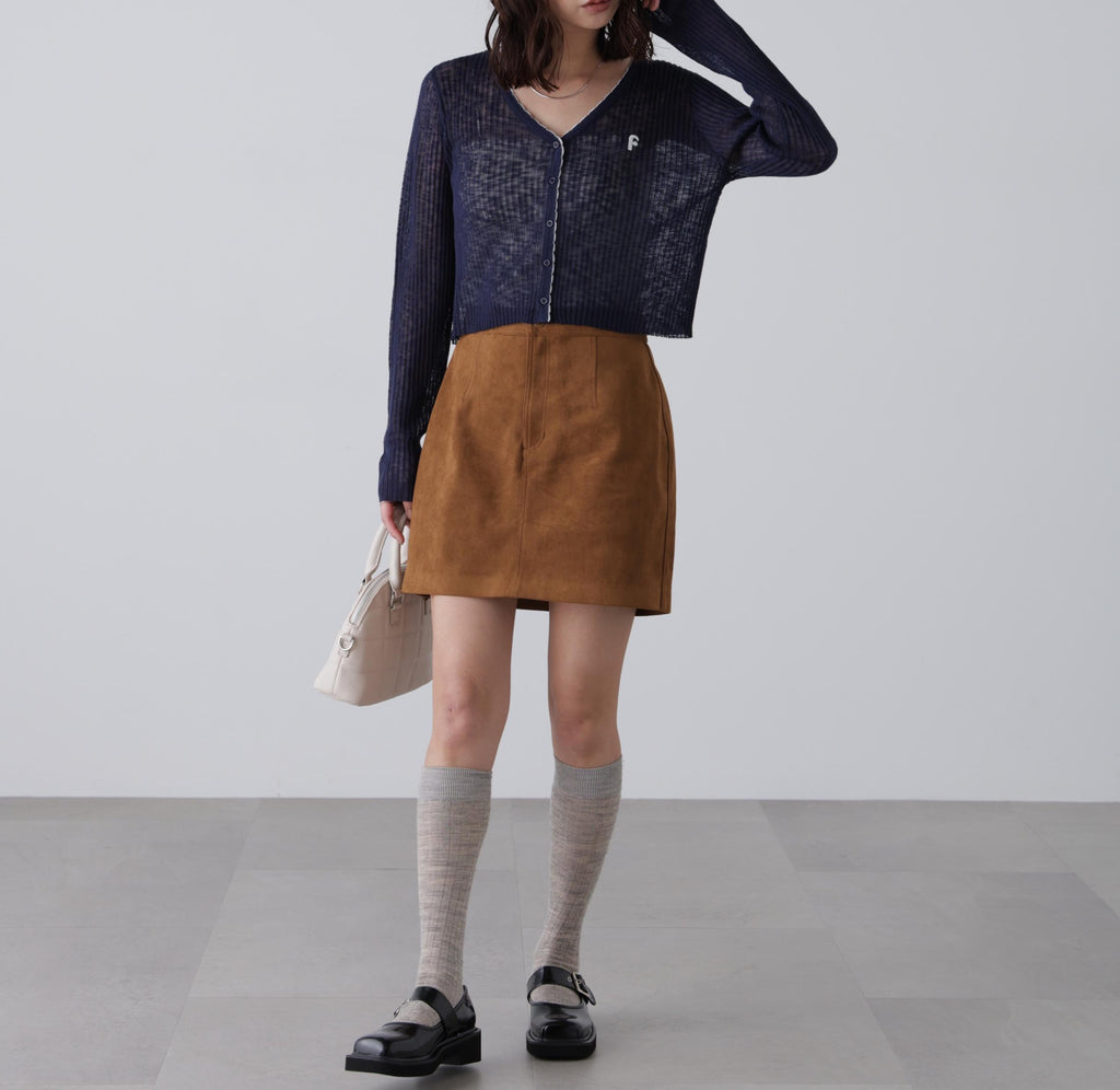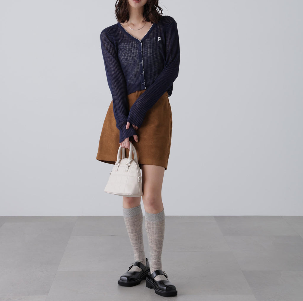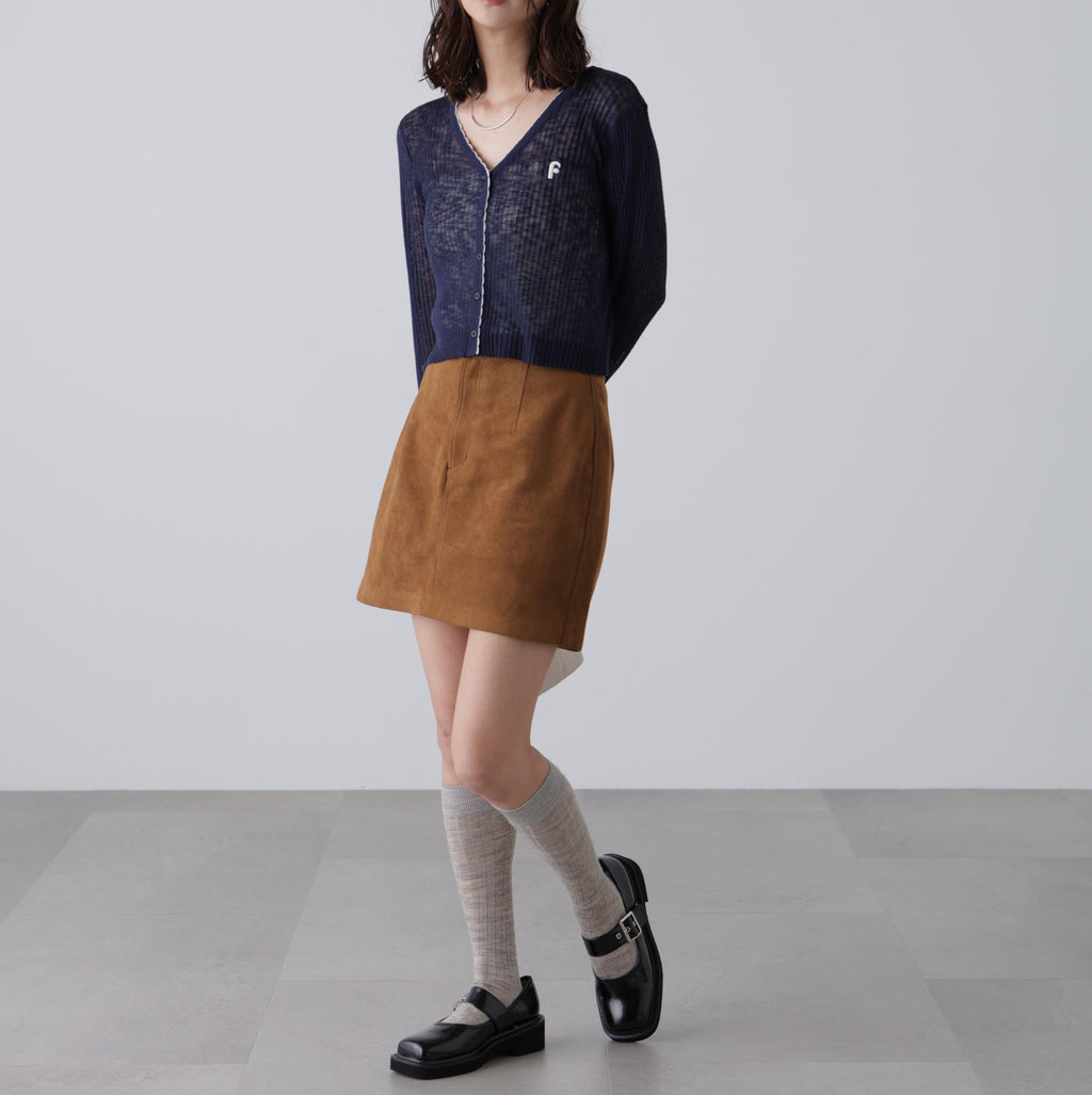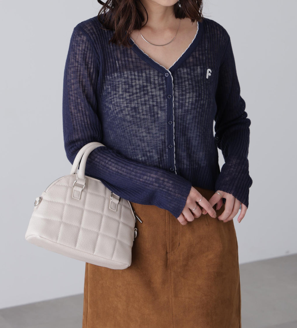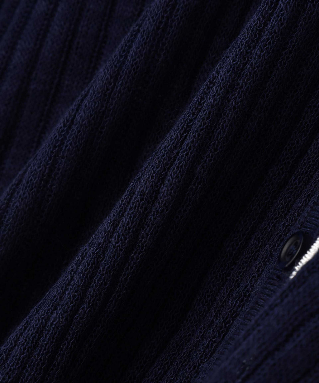 A refreshing, smooth-to-the-touch sheer rib knit cardigan. The slub yarn gives it a casual vibe. The delicate color-blocked scallop design on the front adds sweetness. The brand's initials are featured on the logo tape at the chest, giving a casual impression. When layered over wide denim and a camisole with a built-in bra, it creates a relaxed casual look. Buttoning up the front and pairing with a mini skirt allows you to enjoy a girly preppy style.