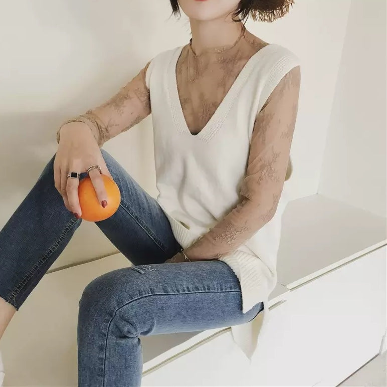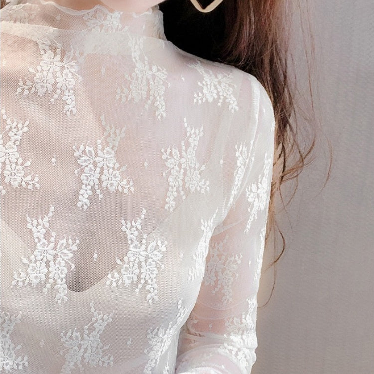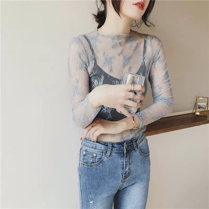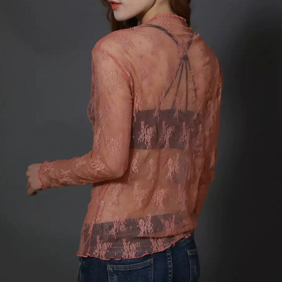 Carpe diem Lace Tulle Top Long Sleeve Sheer Top Inner High Neck Transparent Lace Inner Sheer Sexy Blouse Layered New Thin Cute Korea