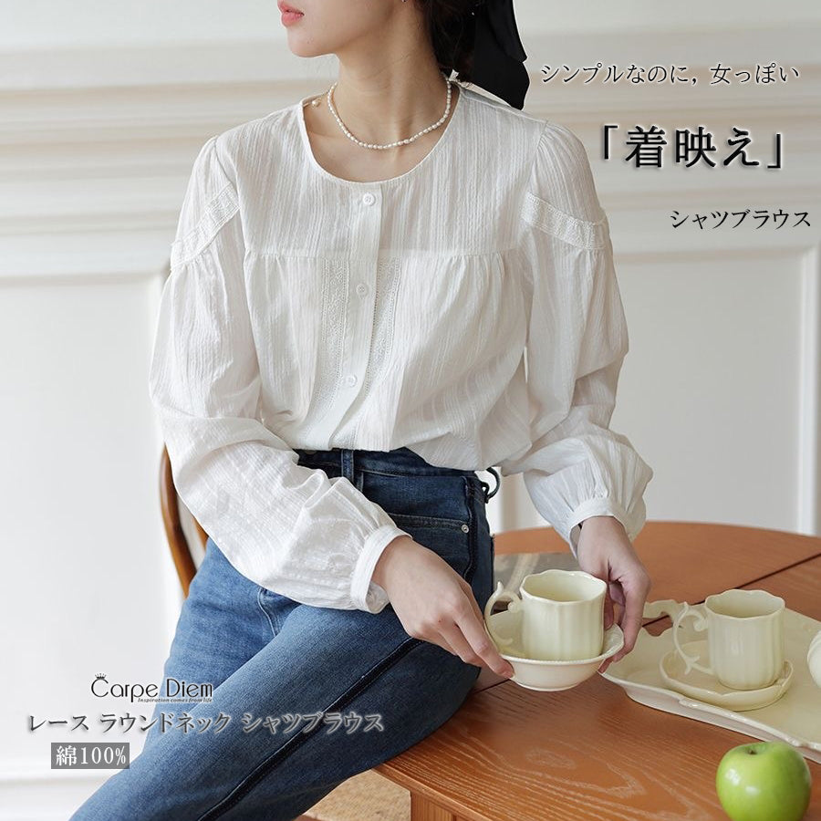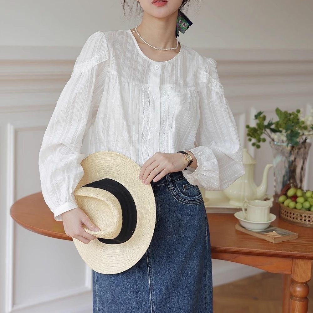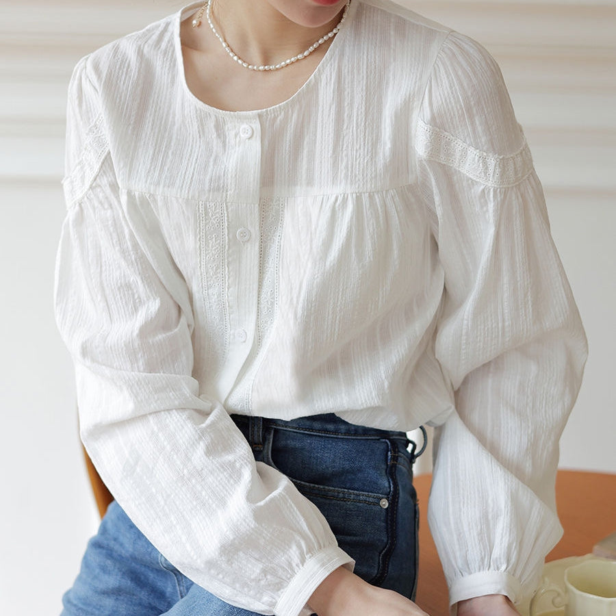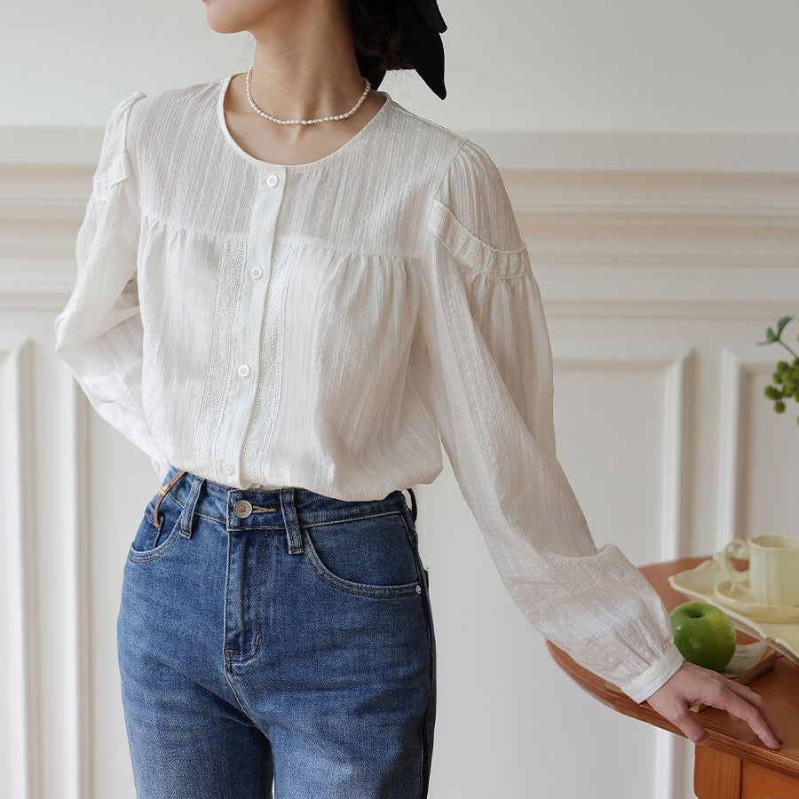 Carpe diem lace long-sleeve shirt blouse top autumn new release sheer elegant volume sleeve shirt cotton office casual lightweight puff sleeve no collar white adult cute body shape cover
