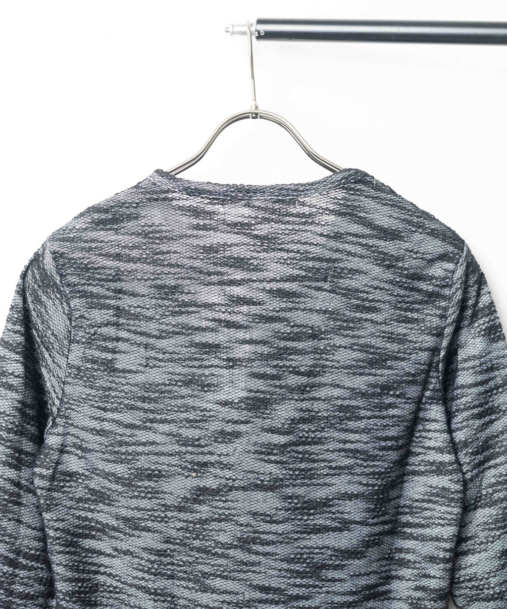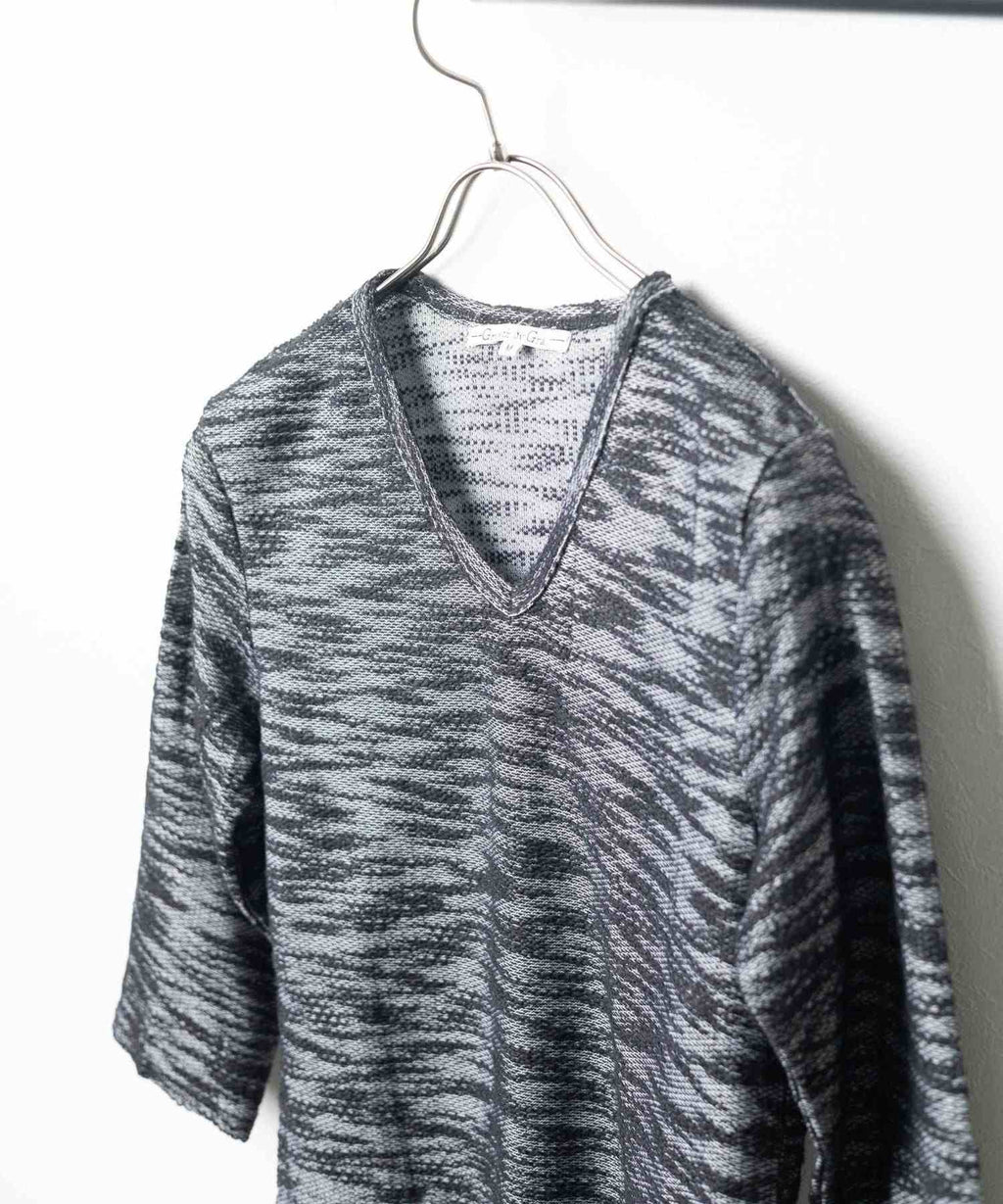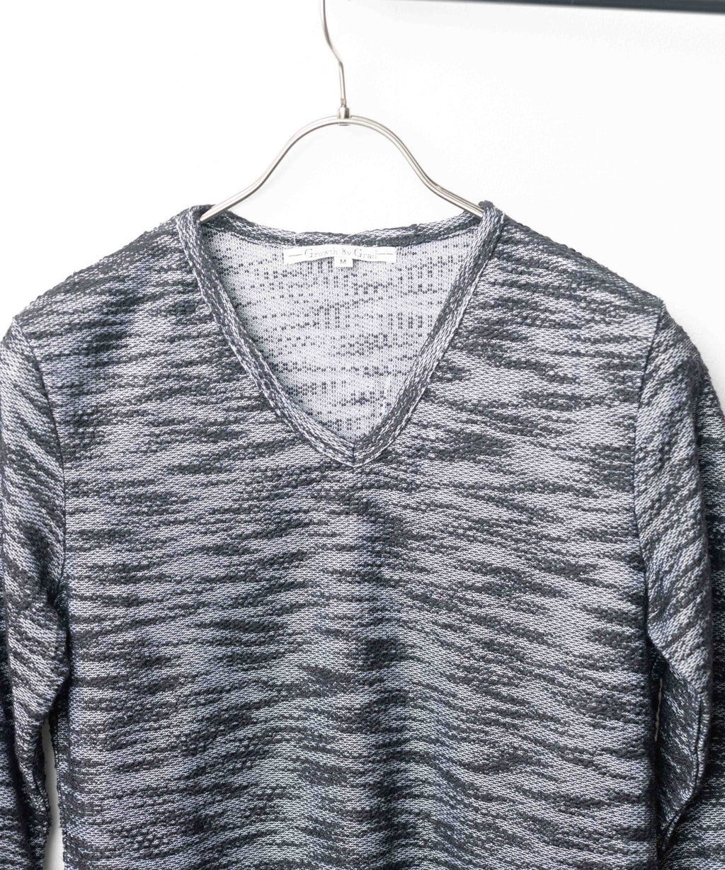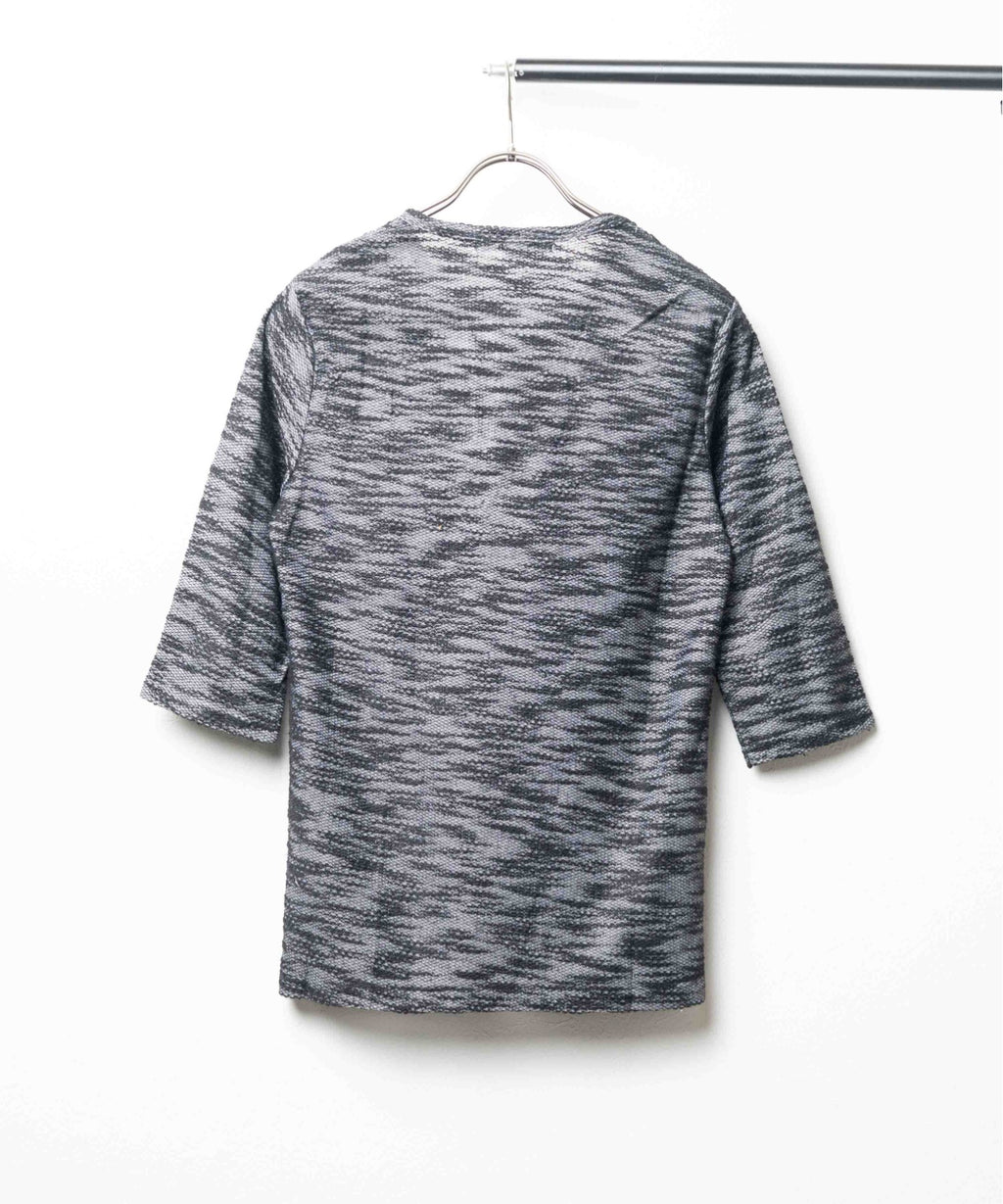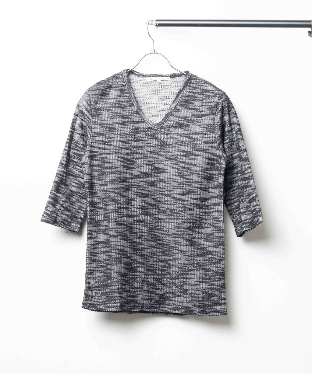 A 7/8 sleeve V-neck cut-and-sew using heather textured cut fabric.