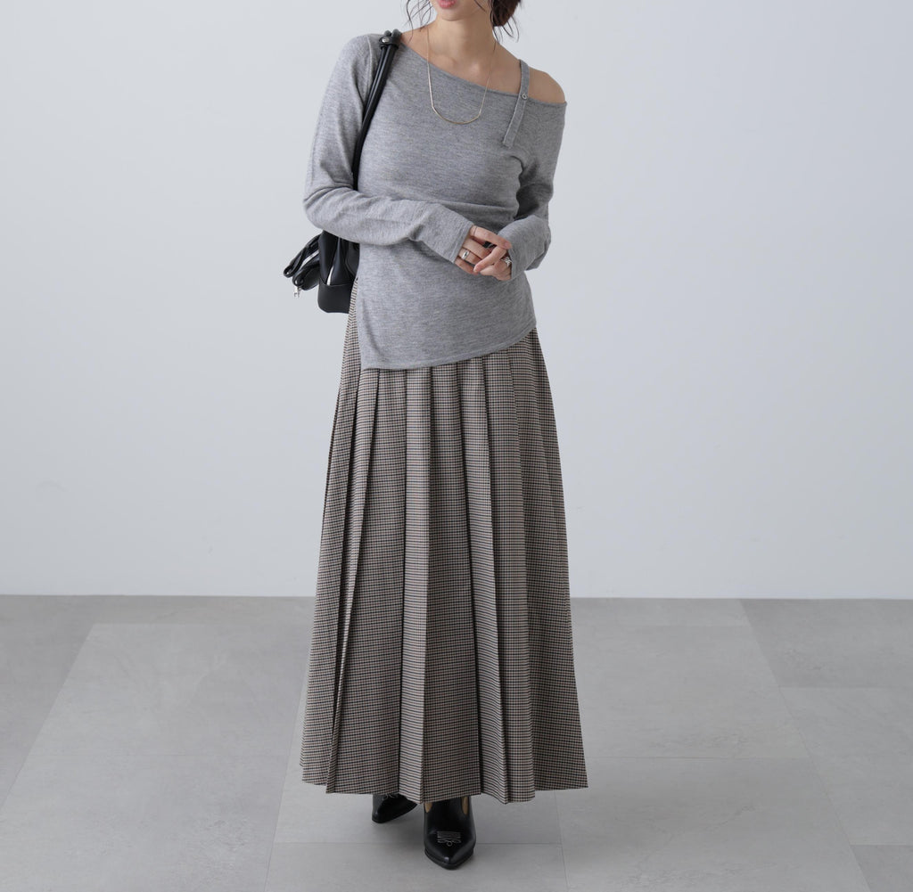 A pleated long skirt made of TR material that is easy to match with anything. It has a soft drape and a beautiful silhouette that does not flare too much. The long length makes it easy for adults to wear. The back Waist is designed with elastic for a stress-free fit. It has belt loops, so you can adjust the Waist by pairing it with your own belt. Tucking in a compact top and matching it with a belt creates a stylish look with contrast that is trendy this year. You can also enjoy a polished style by pairing it with knitwear. Available in a simple heather gray and an autumn-inspired small check pattern assortment.