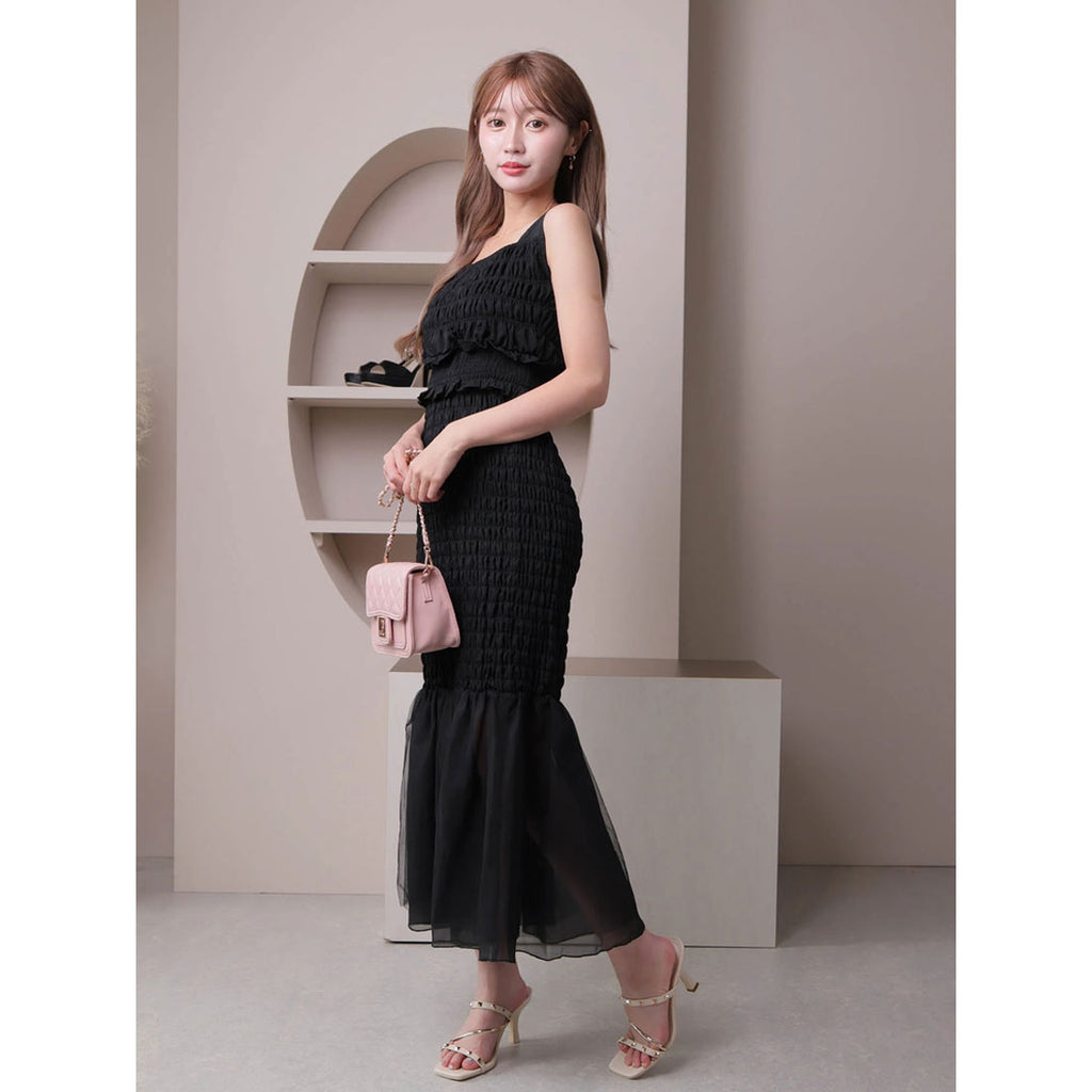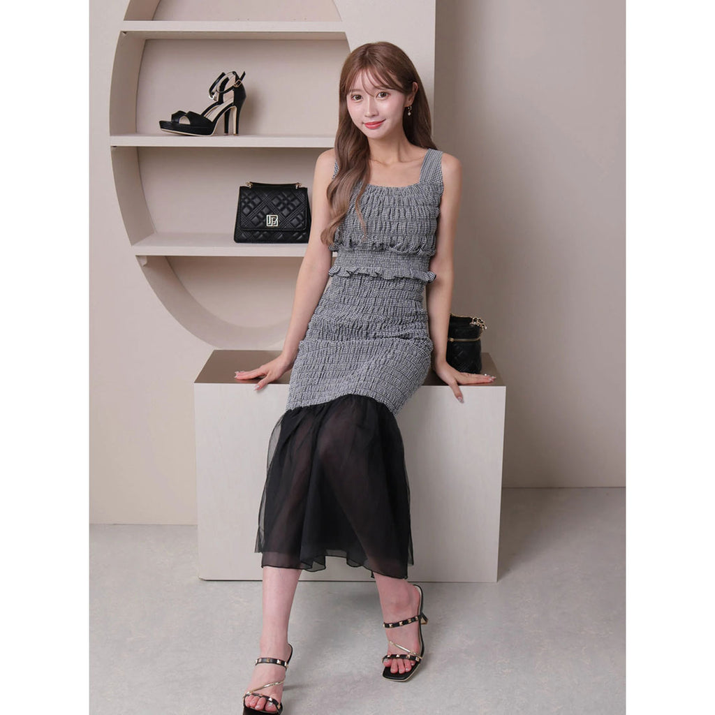 The hem uses tulle and chiffon, creating a sheer effect and a feminine design.