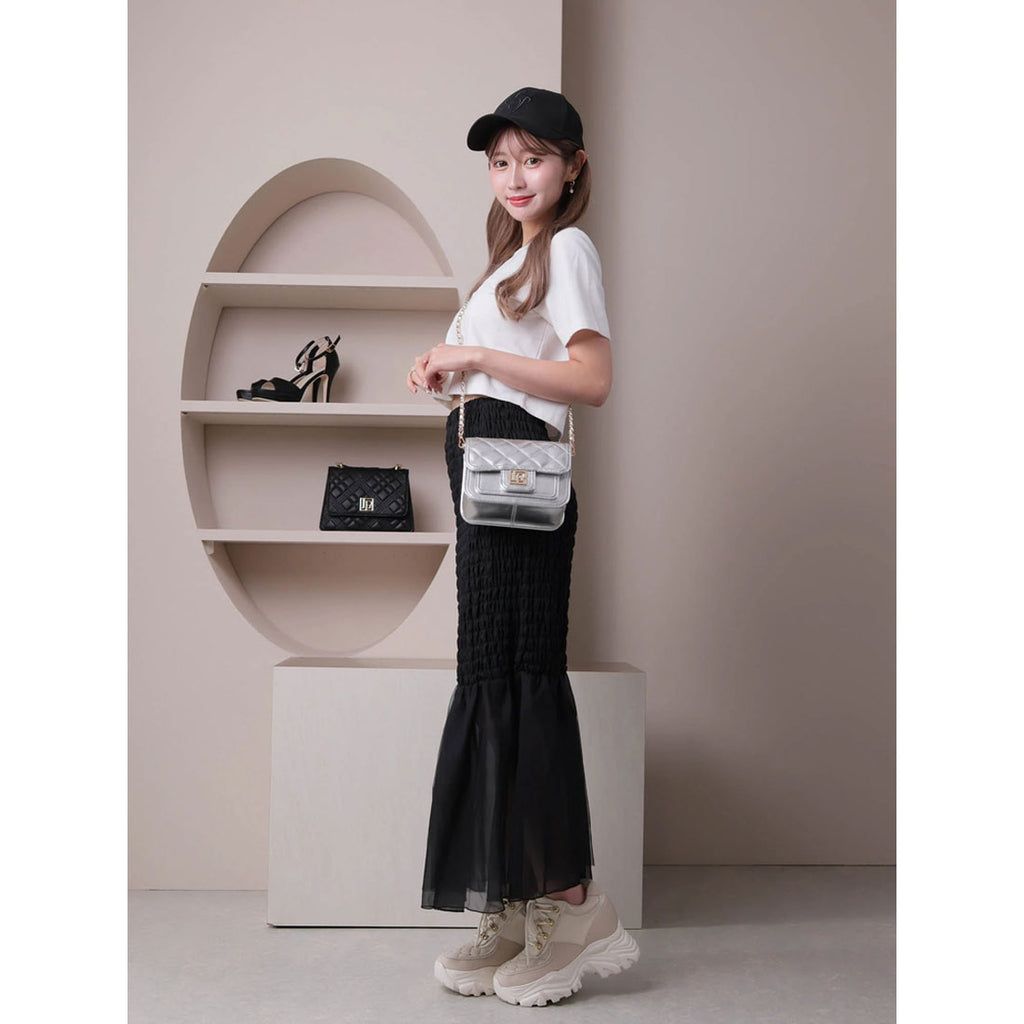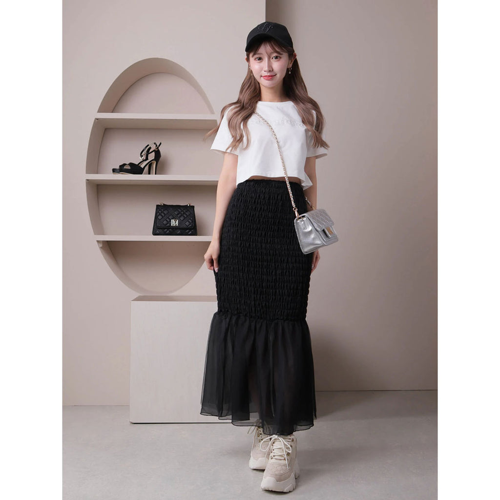 Material Material: (TOPS) [Outer fabric] Polyester 97% Polyurethane 3% [Lining] Polyester 100% (SK) [Outer fabric] Polyester 97% Polyurethane 3% [Tulle part] Polyester 100% [Chiffon part] Polyester 100% [Lining] Polyester 100%