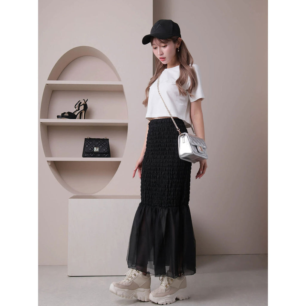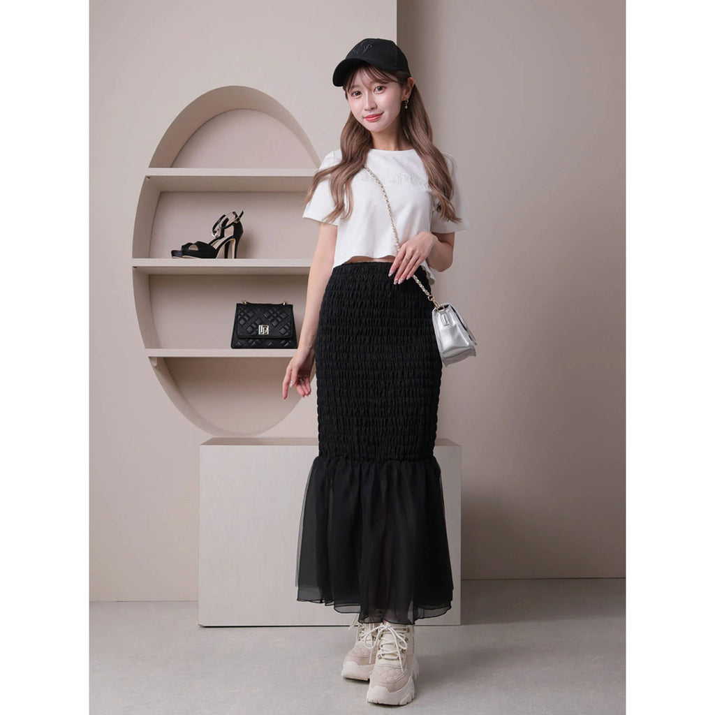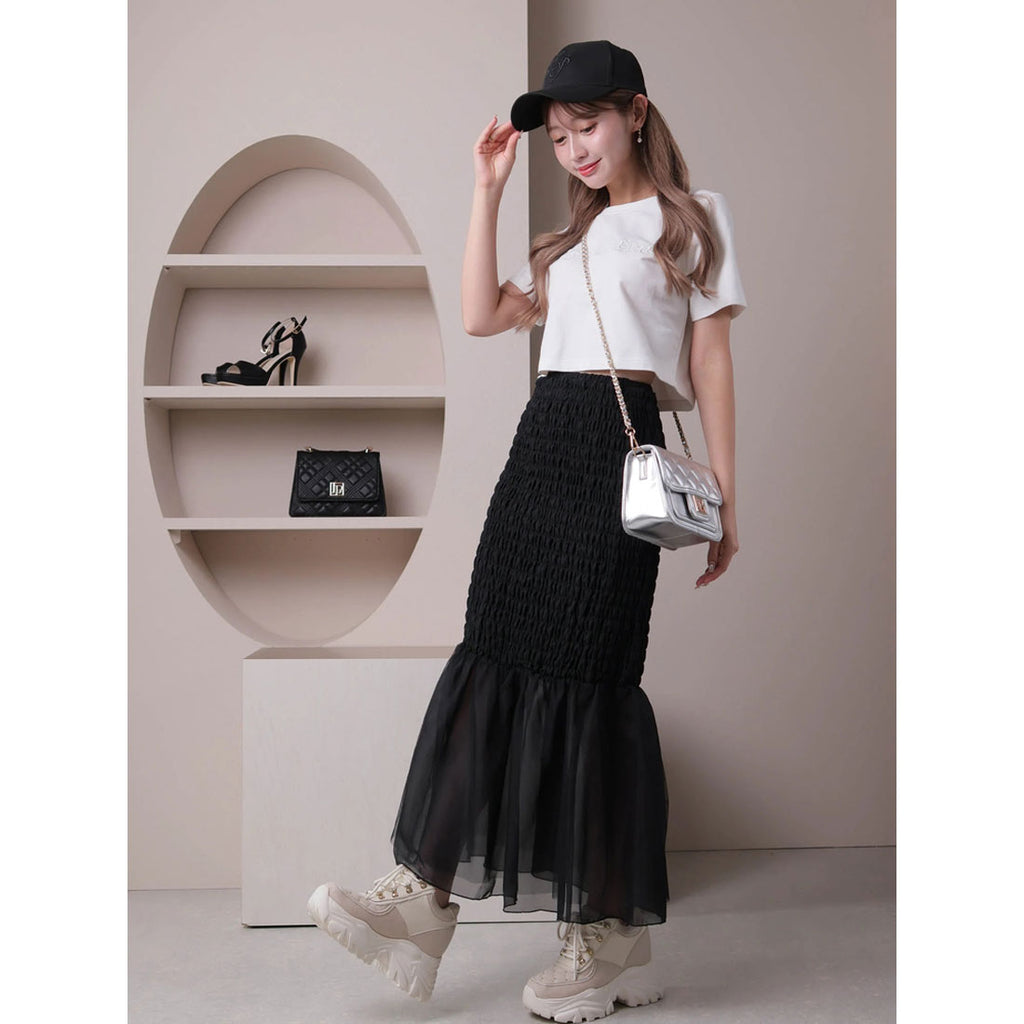 The hem of the skirt is made of a double layer of chiffon and tulle, creating a sheer effect that gives a feminine atmosphere.