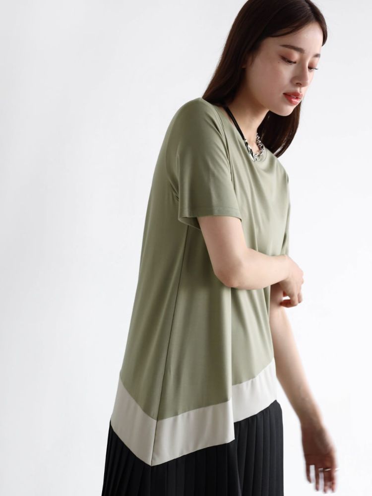 A design that combines different materials towards the hem, based on a smooth fabric.