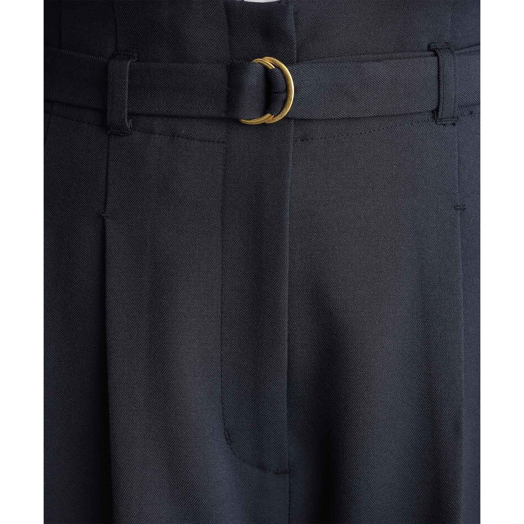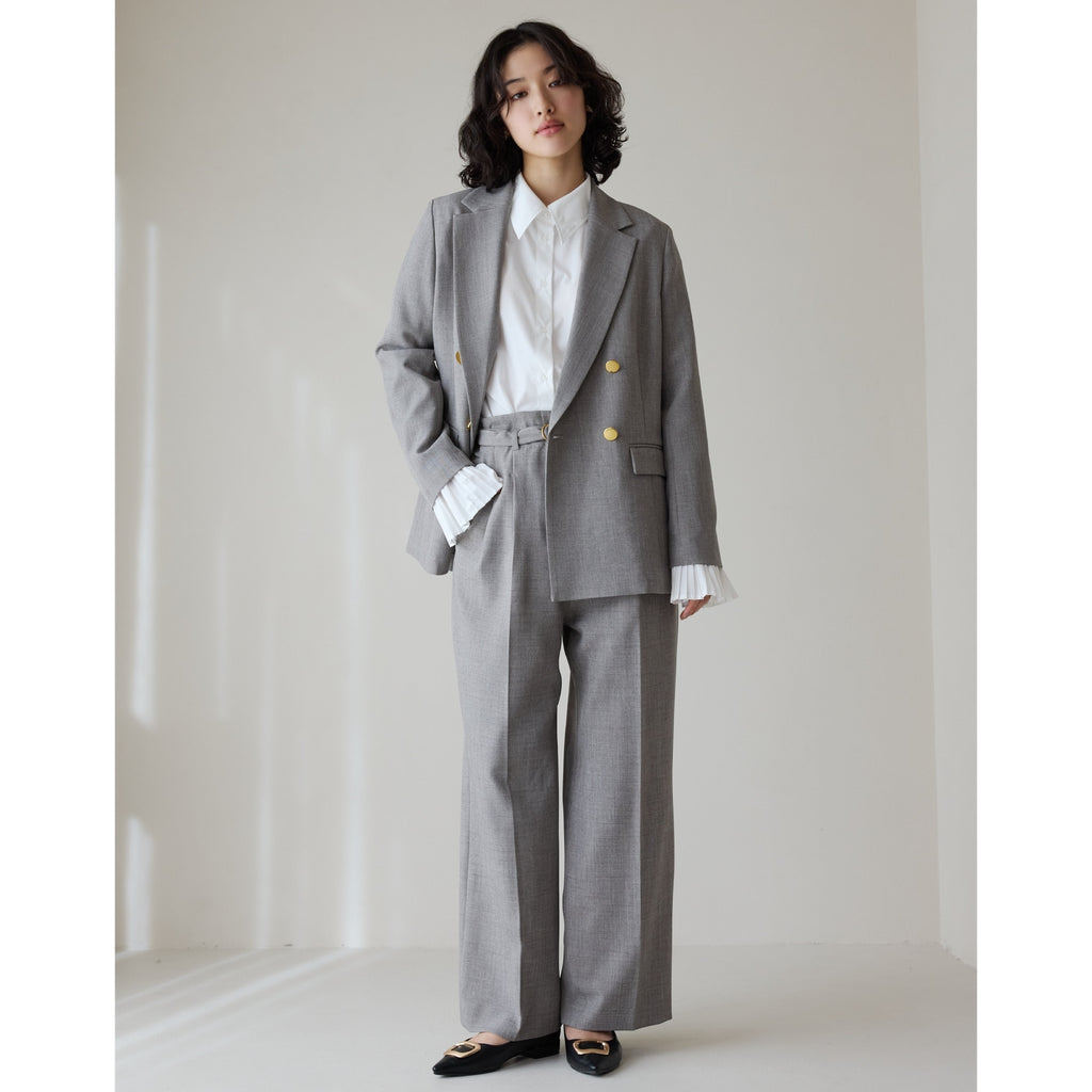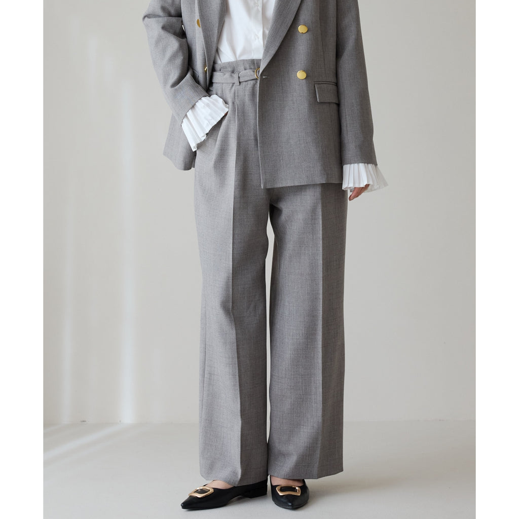 The wide silhouette pants with a two-tuck design made from sharkskin material give a stylish and sophisticated impression.