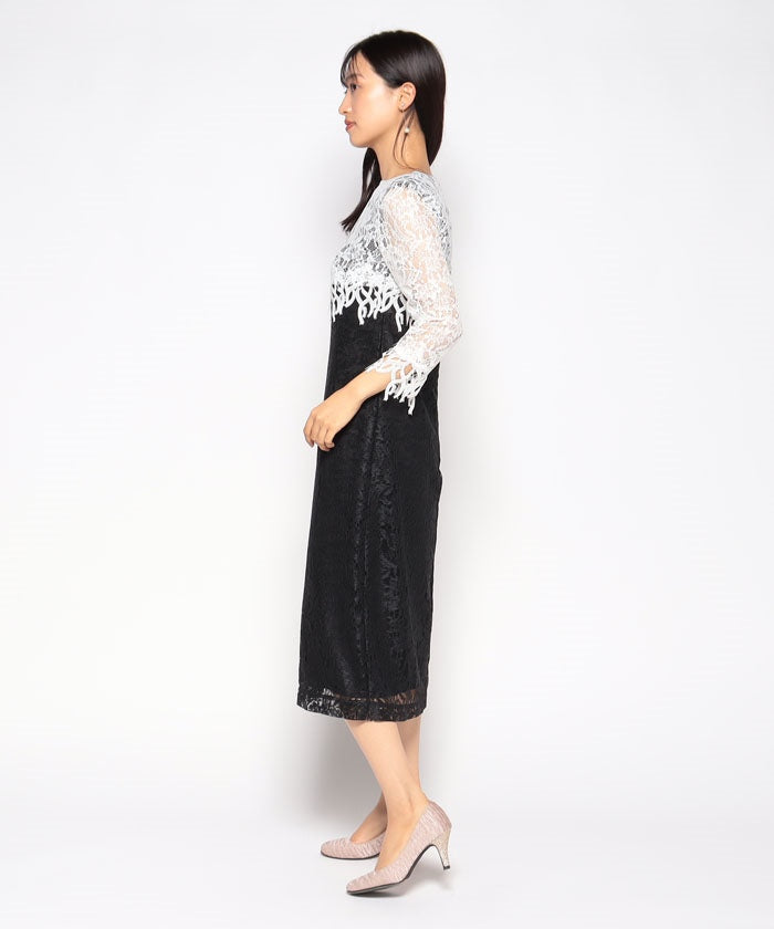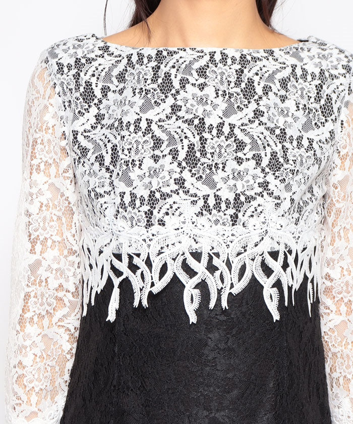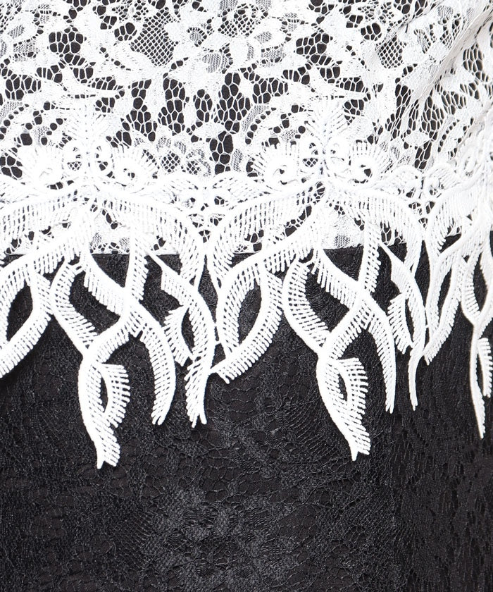 It features a combination of white and black lace with a ruffled design on the body, combined with chemical lace in the underbust area.