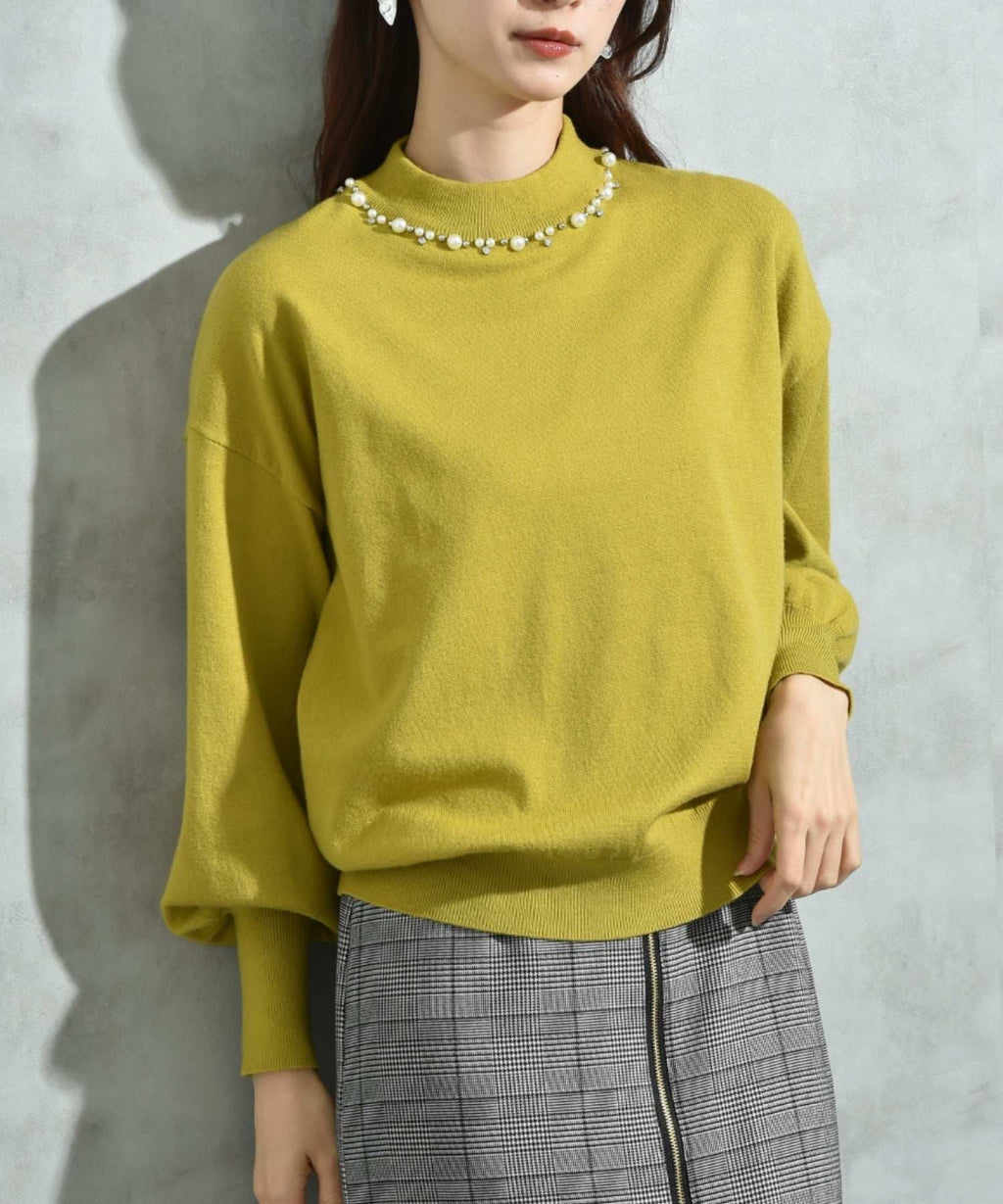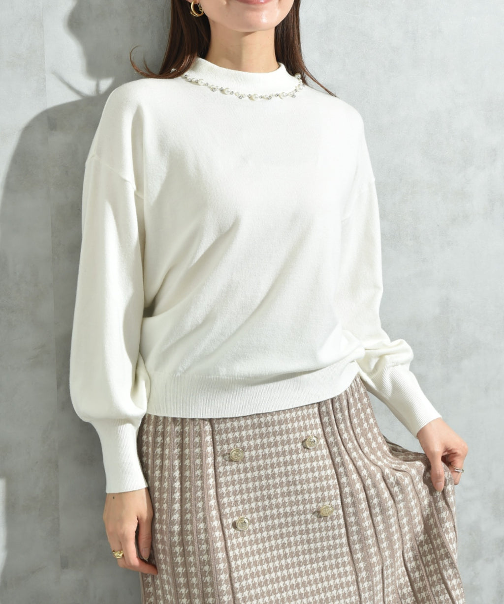 This is a pullover with a glamorous impression accented by bijoux at the neckline.