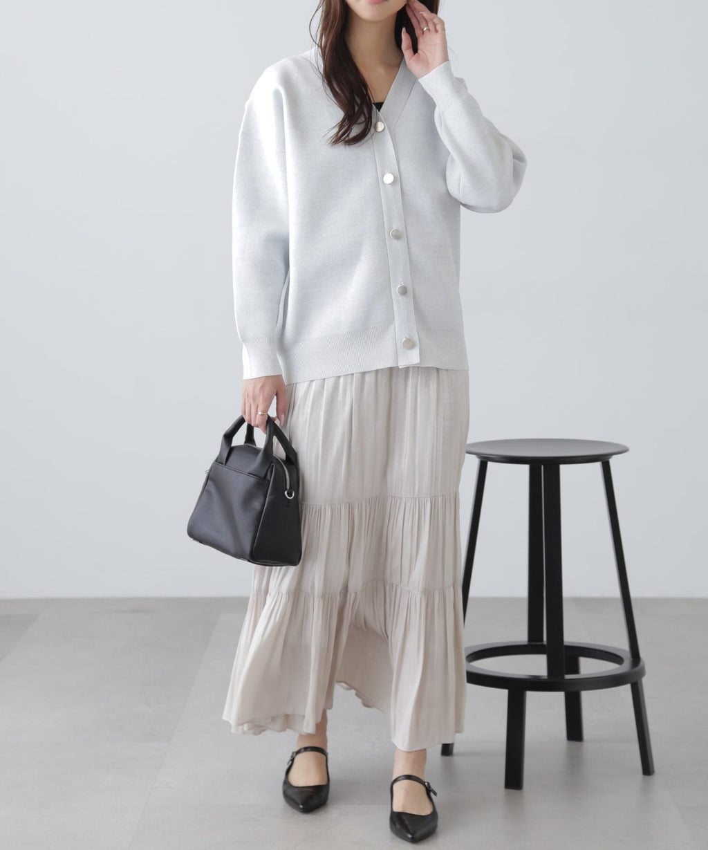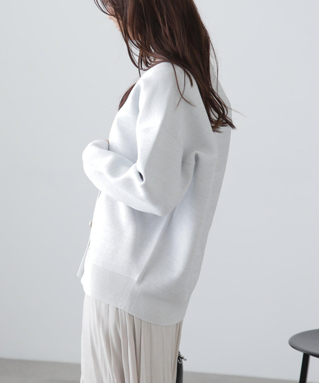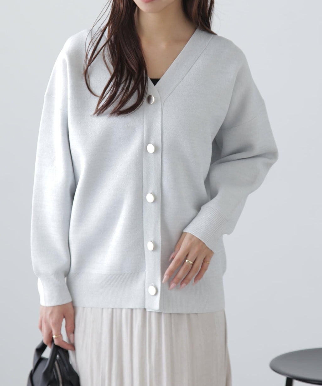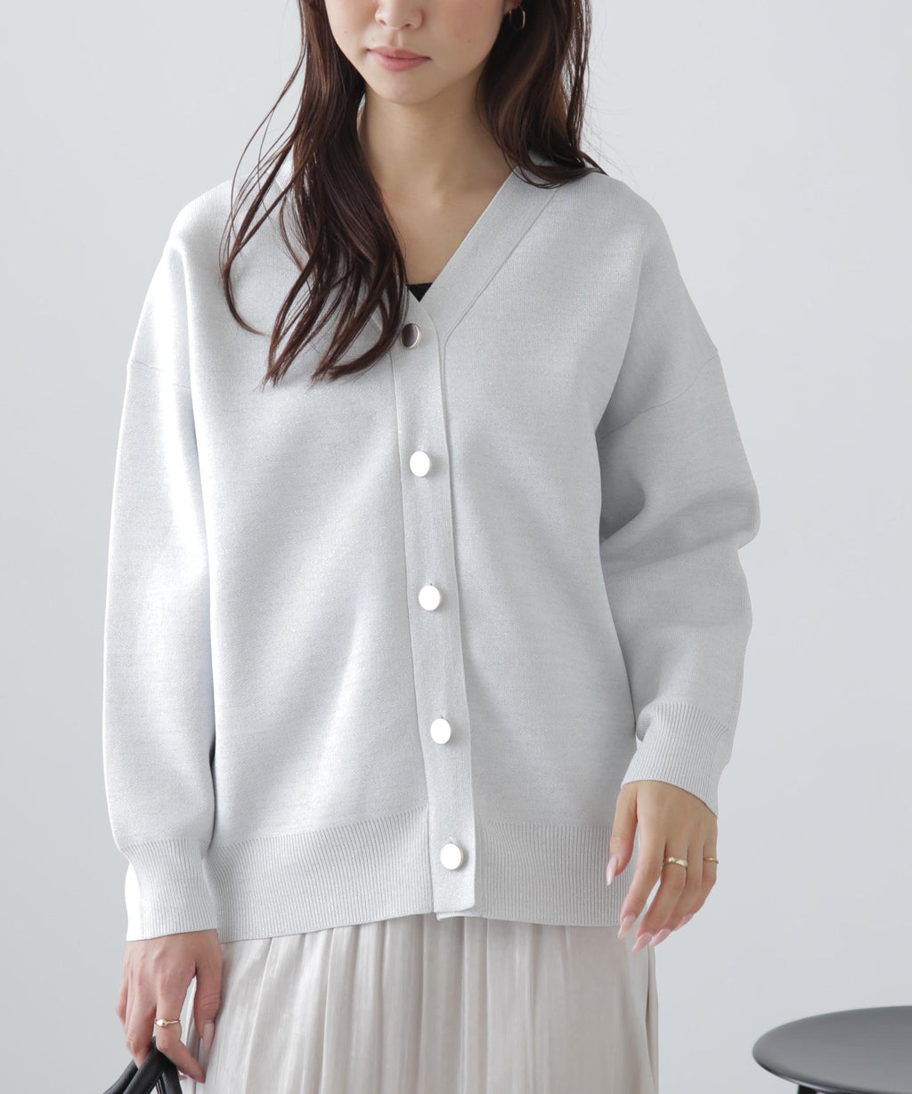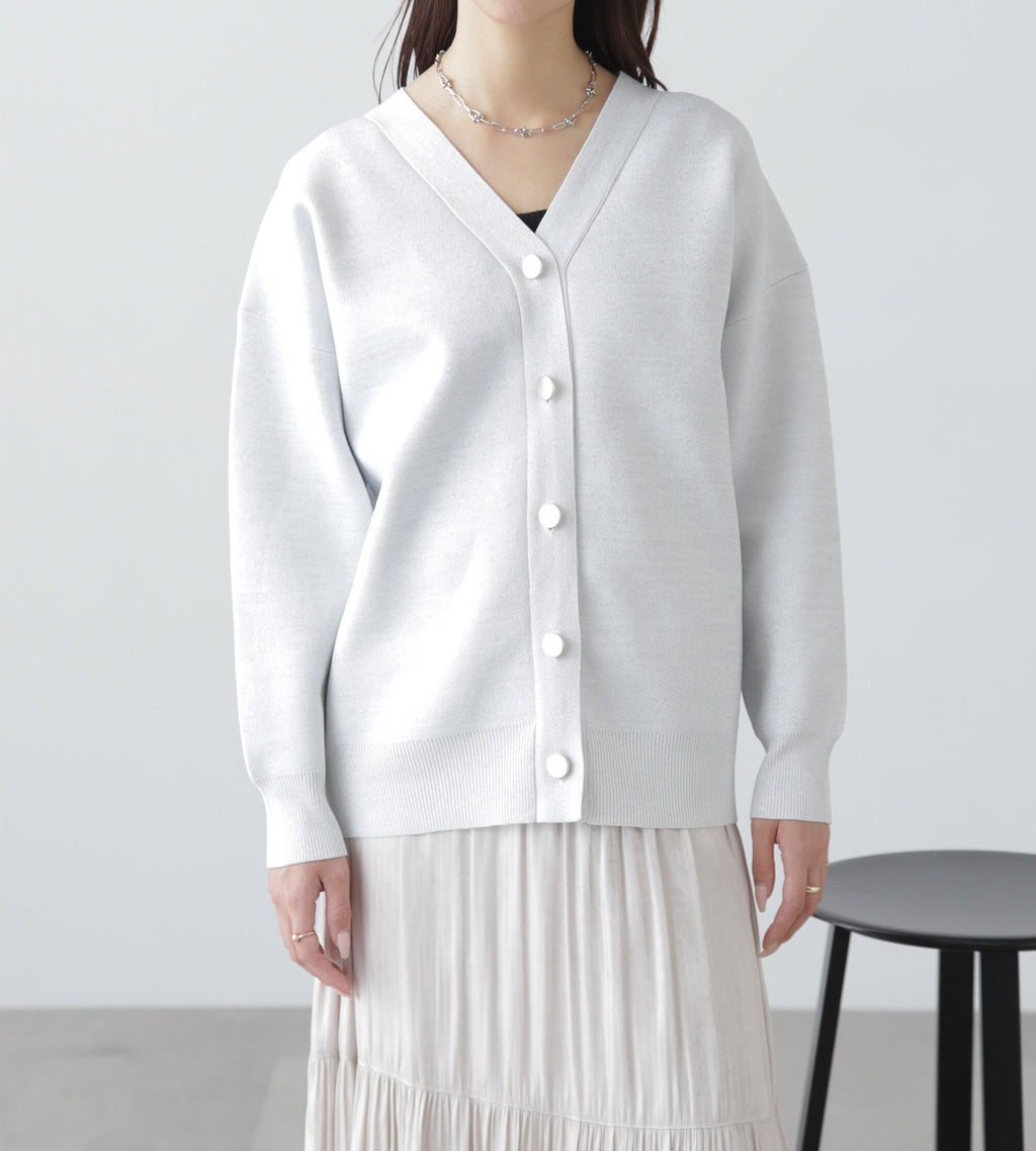 【Adult-like Casual Volume Silhouette Glitter Cardigan】A cardigan with a voluminous silhouette made from trendy glitter knit material. The sleeve ribbed parts are made with the same knitting as the body, providing a stable hold even when you roll up the sleeves. The moderately open V-neck design does not restrict your choice of innerwear. T-shirts, flocked cut-and-sew tops, tanks, or turtleneck sweaters are recommended for colder seasons. For bottoms, pairing with denim, narrow skirts, or shorts is perfect.