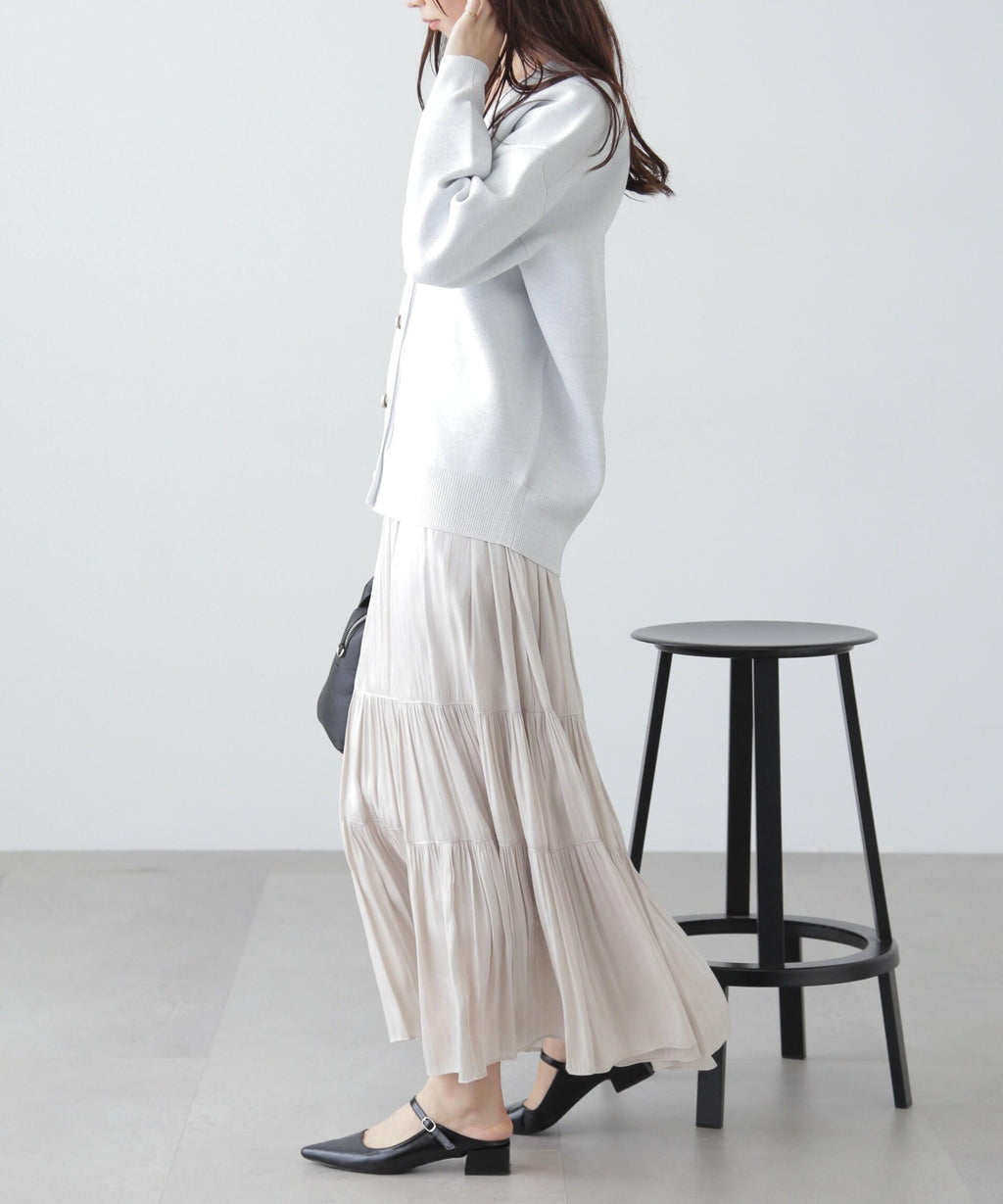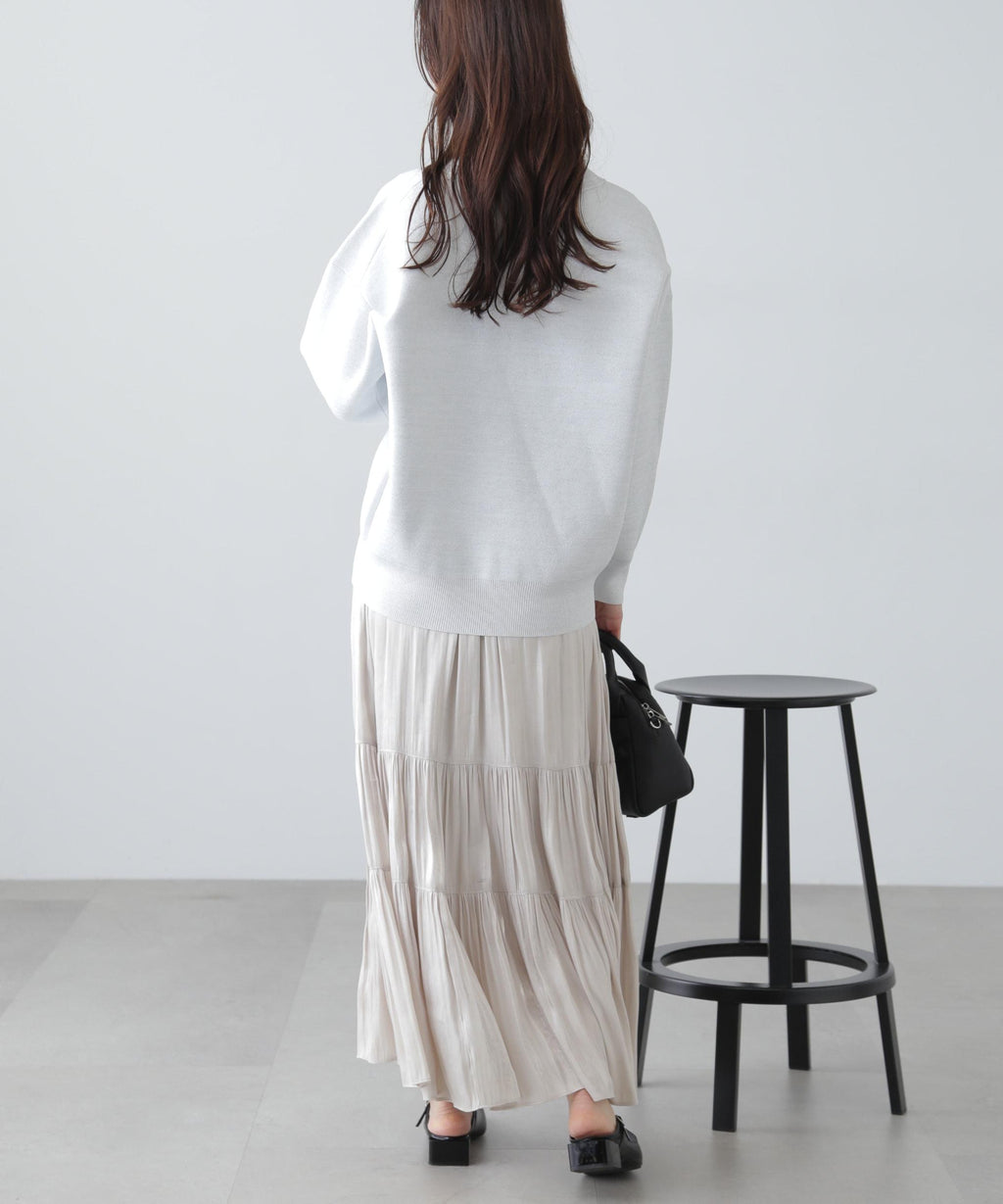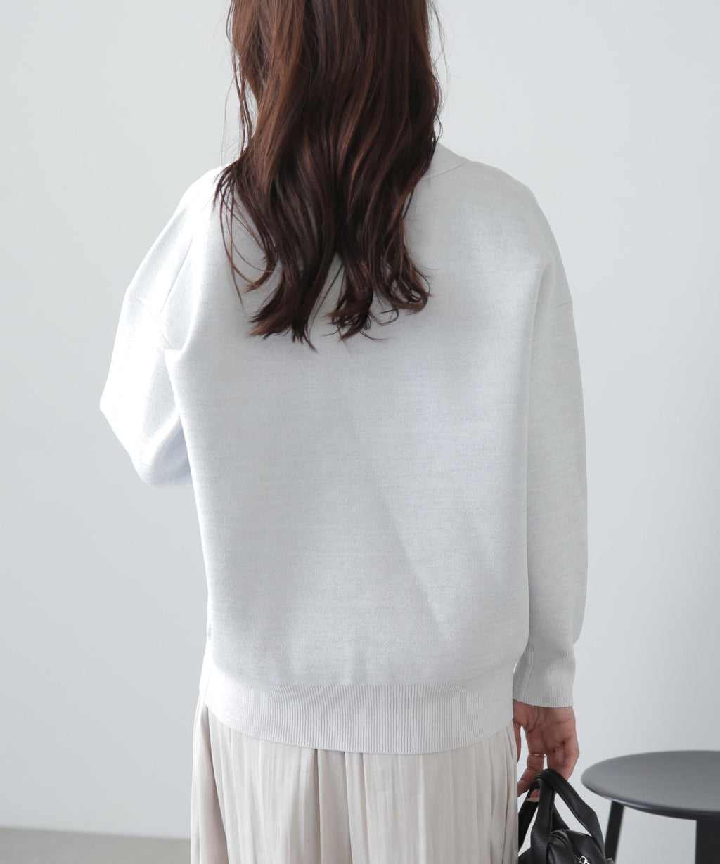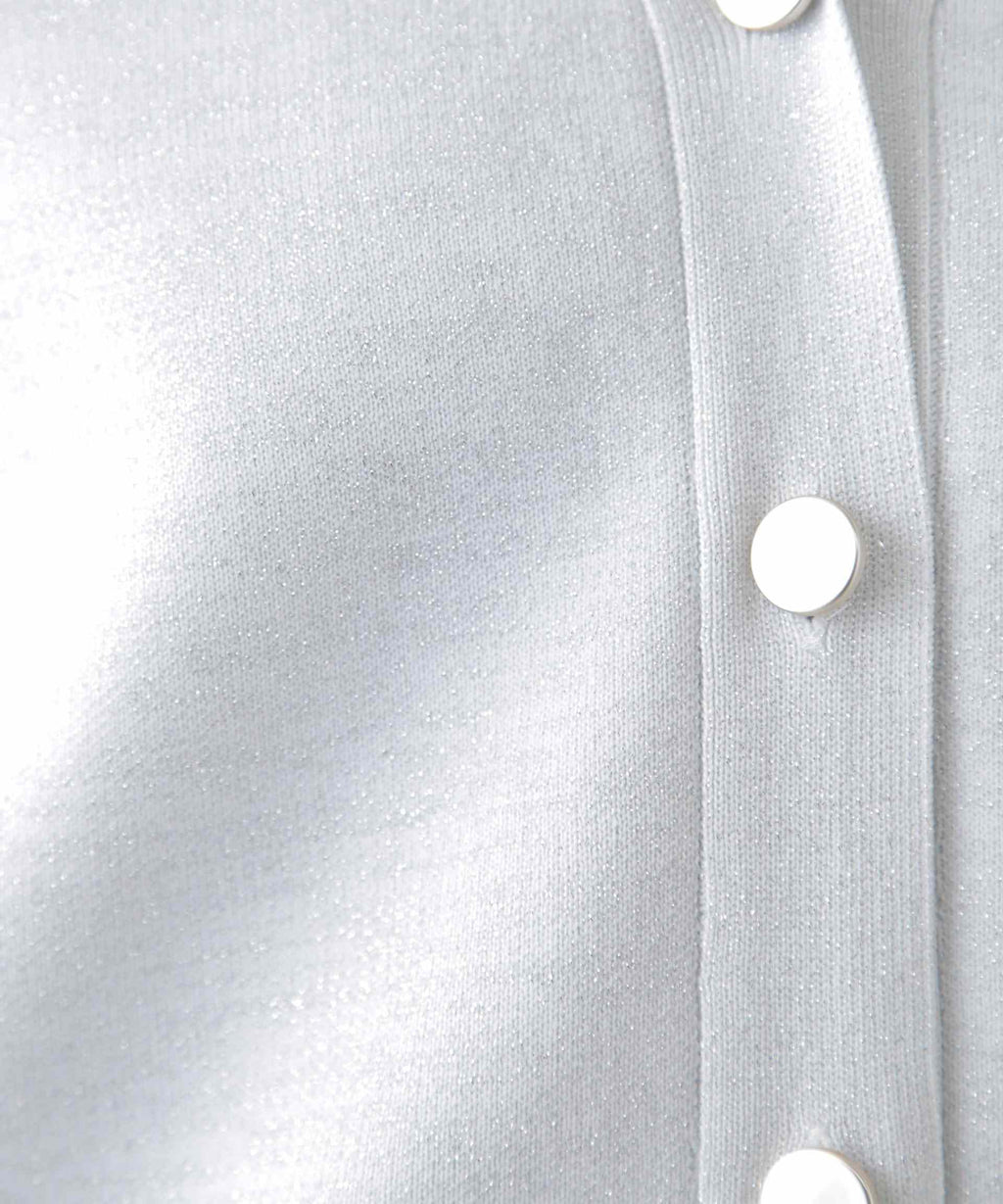 【Adult-like Casual Volume Silhouette Glitter Cardigan】A cardigan with a voluminous silhouette made from trendy glitter knit material. The sleeve ribbed parts are made with the same knitting as the body, providing a stable hold even when you roll up the sleeves. The moderately open V-neck design does not restrict your choice of innerwear. T-shirts, flocked cut-and-sew tops, tanks, or turtleneck sweaters are recommended for colder seasons. For bottoms, pairing with denim, narrow skirts, or shorts is perfect.