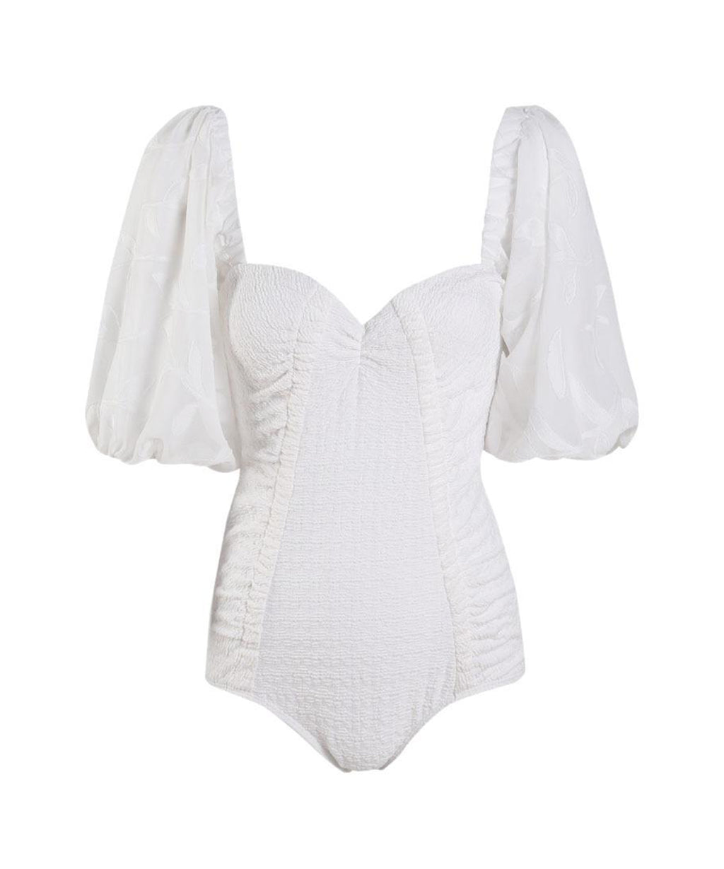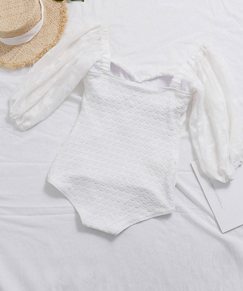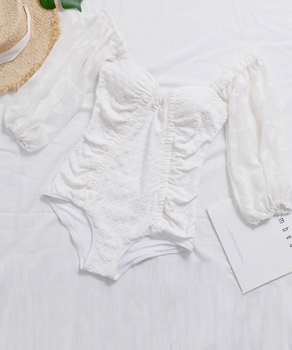 This is a feminine one-piece swimsuit with a lot of gathering and slightly sheer voluminous sleeves.