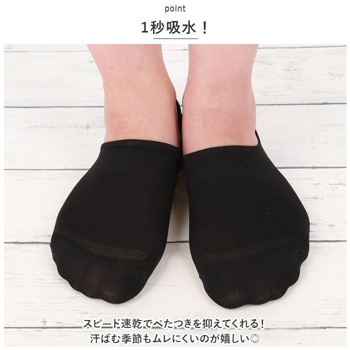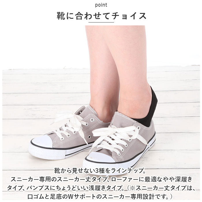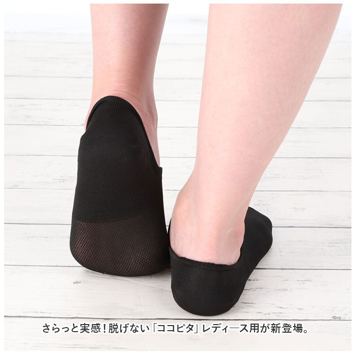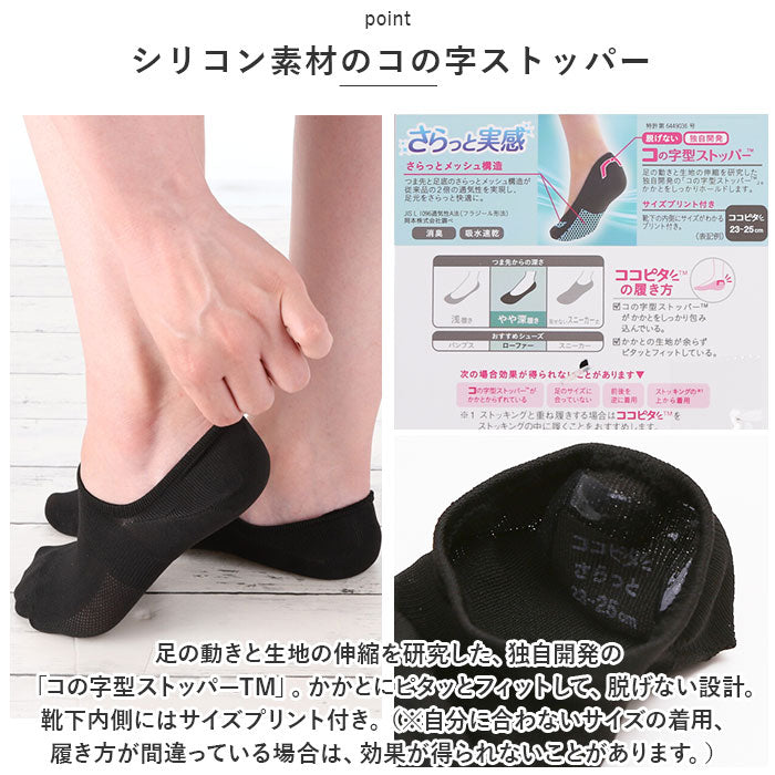 Feel the difference! The non-slip "Cocopita" for ladies is newly launched. 【Mesh structure keeps you feeling fresh】 By using a mesh design for the toes and soles, breathability is enhanced! Your feet will always feel comfortable and dry! 【1-second water absorption!】 Quick-drying technology reduces stickiness! It's great that it doesn't get stuffy even in sweaty seasons◎【Eliminates unpleasant odors】 It also has deodorizing effects that suppress the growth of bacteria that cause odors. Say goodbye to those annoying smells! 【Silicone U-shaped stopper】 A uniquely developed "U-shaped stopper TM" that studies foot movement and fabric stretch. It fits snugly on the heel, designed to prevent slipping. The inside of the socks has size prints. (※ If you wear a size that doesn't fit you or if you wear them incorrectly, you may not achieve the desired effect.) 【Choose according to your shoes】 Three types that won't show from your shoes. A sneaker-length type specifically for sneakers, a slightly deeper type perfect for loafers, and a shallow type just right for pumps. (※ The sneaker-length type is specifically designed with double support from the elastic opening and sole for sneakers.)