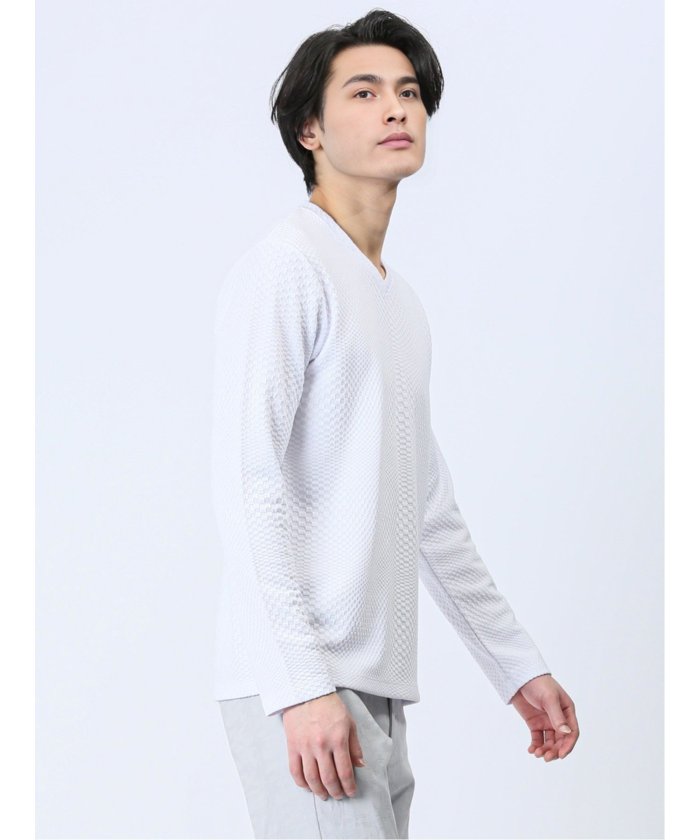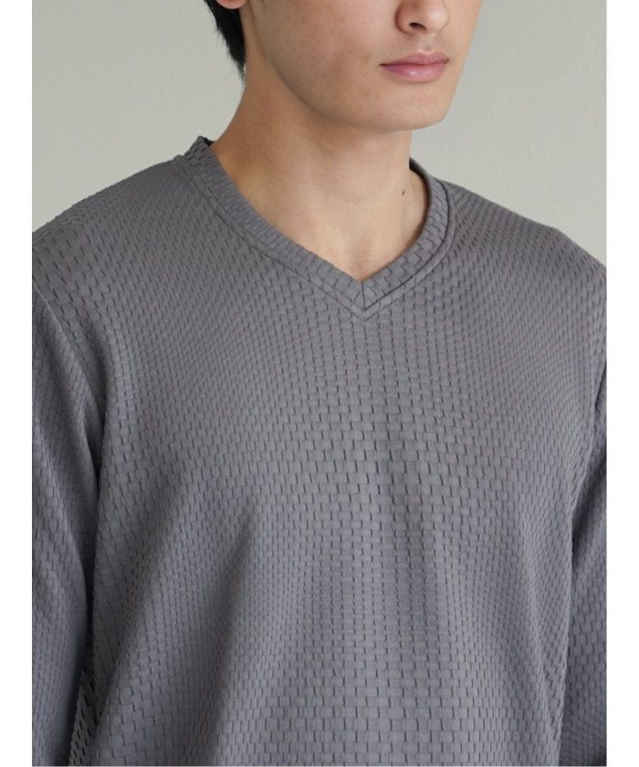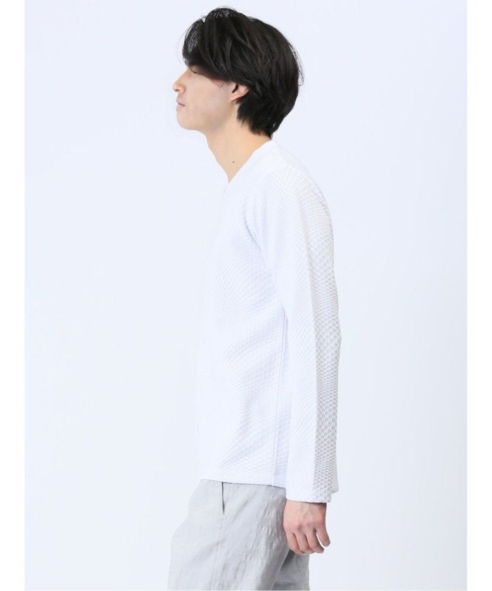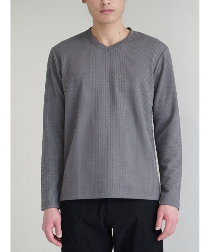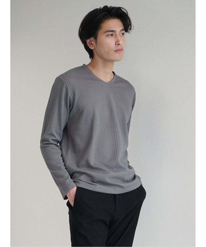 This is a V-neck long-sleeve T-shirt that has a sophisticated and urban impression. It features a random block check with a textured feel, expressing the world view of the renoma brand. It is a versatile item that can be worn alone or as an inner layer under jackets, shirts, or vests.