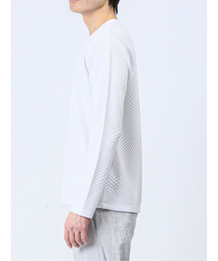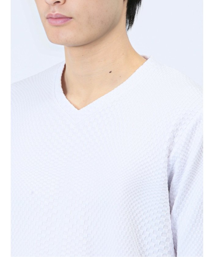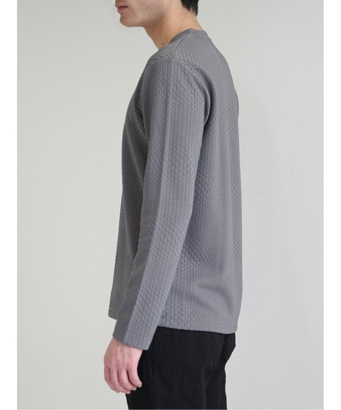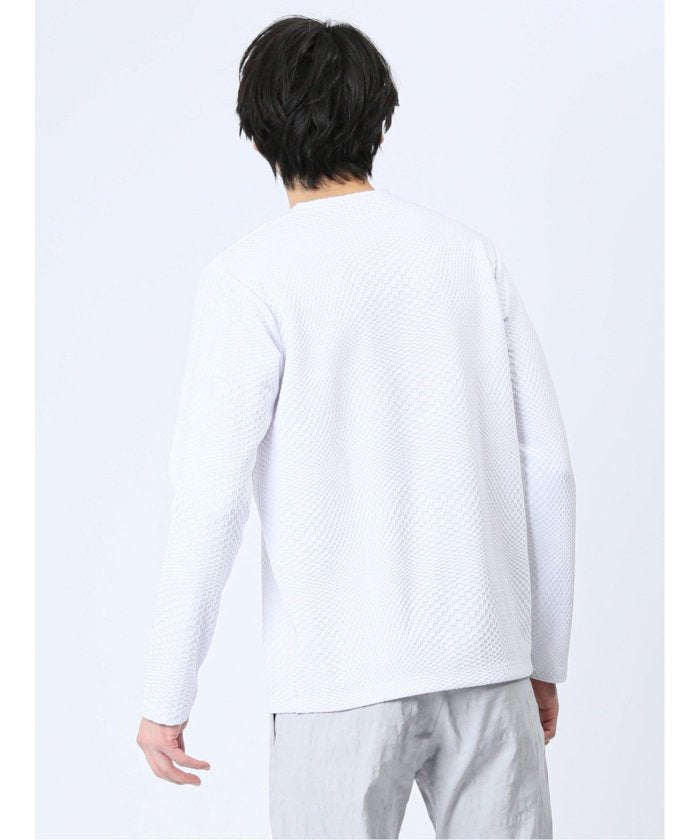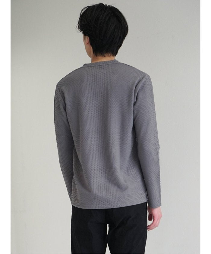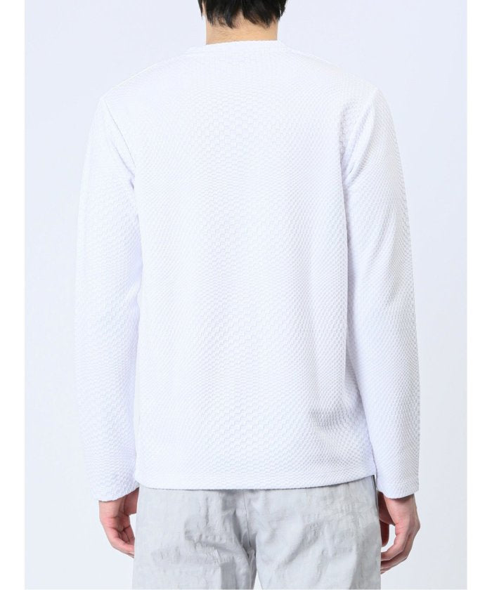 This is a V-neck long-sleeve T-shirt that has a sophisticated and urban impression. It features a random block check with a textured feel, expressing the world view of the renoma brand. It is a versatile item that can be worn alone or as an inner layer under jackets, shirts, or vests.