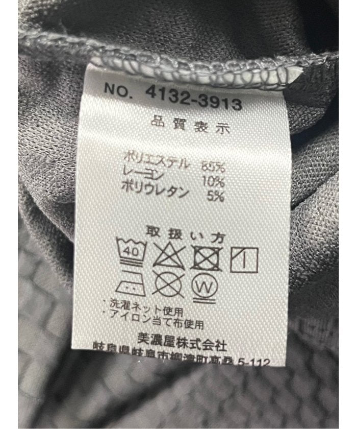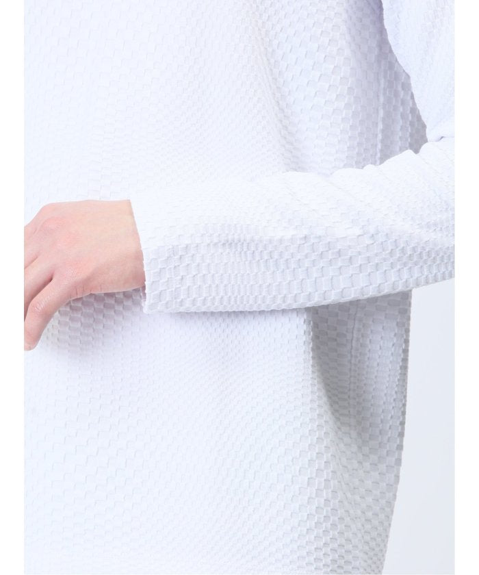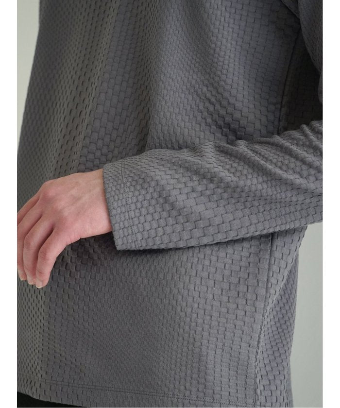 We use a cut-and-sew material blended with polyester, rayon, and polyurethane. It features a random block check pattern expressed in jacquard weaving, characterized by a sense of depth and natural three-dimensionality.