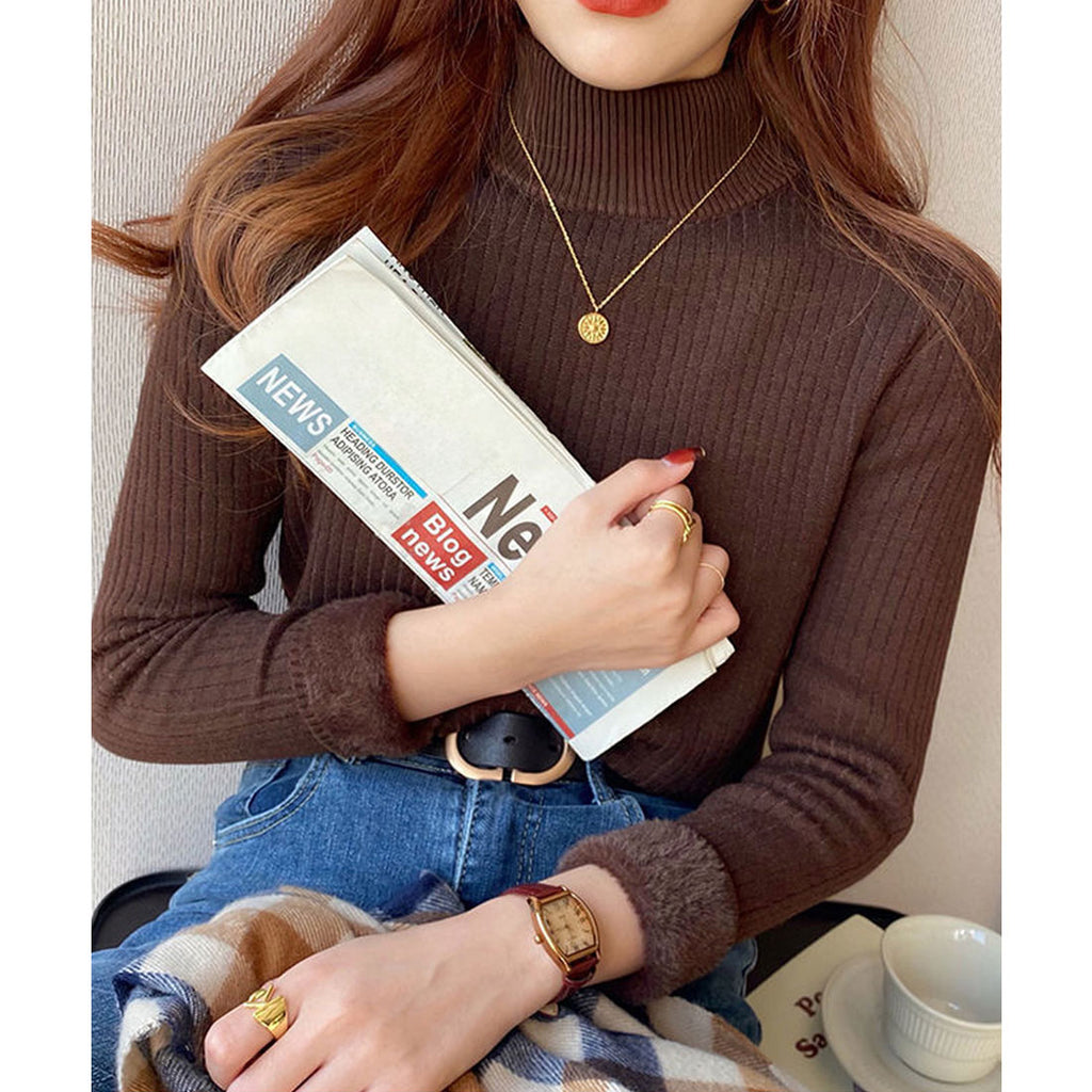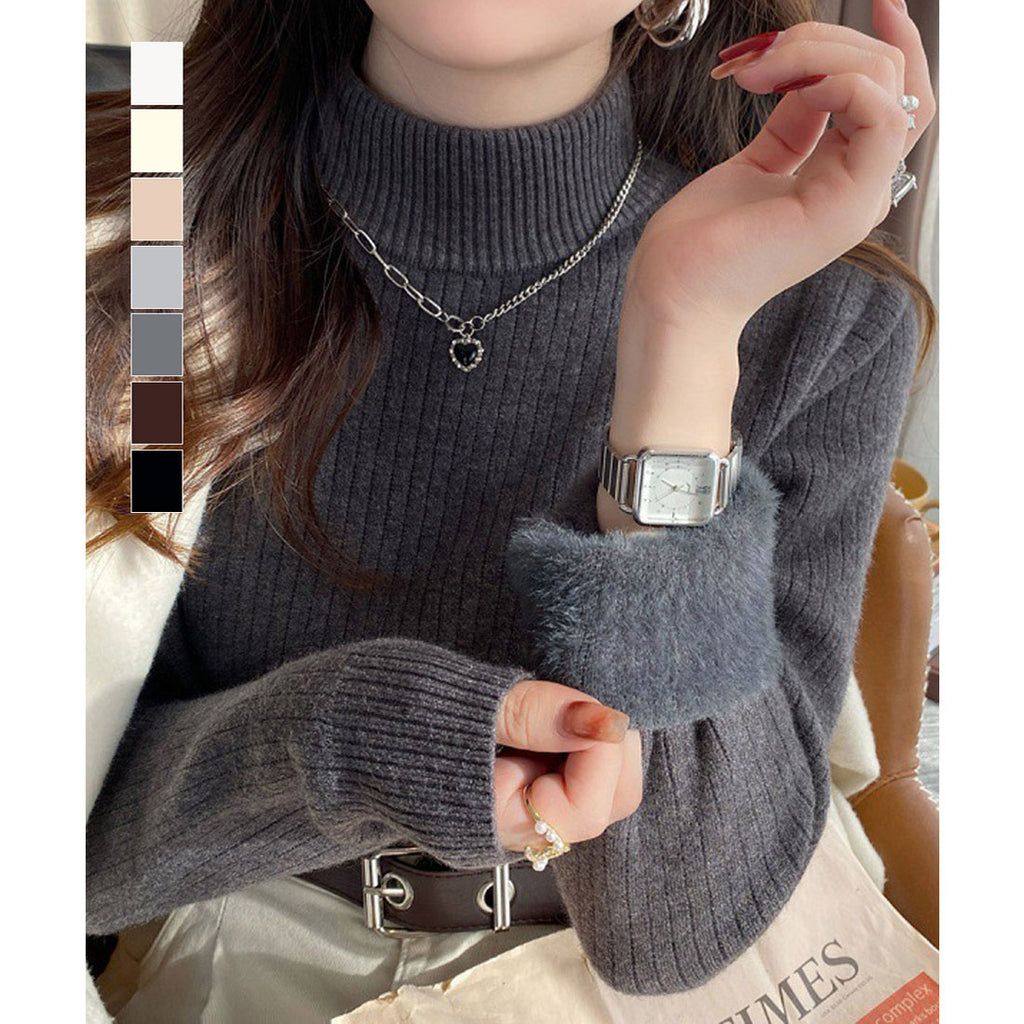 Available in 7 colors, this high-neck knit features a fluffy, soft brushed interior.